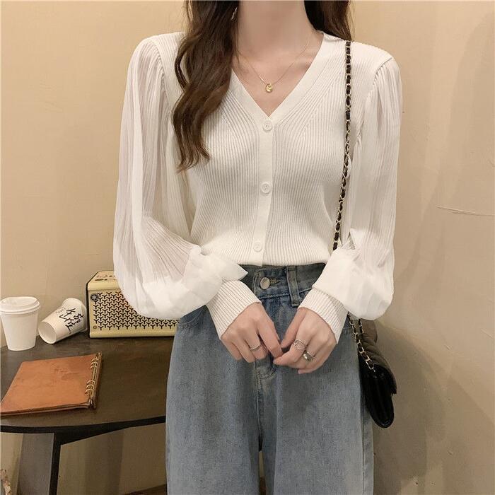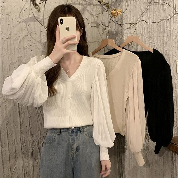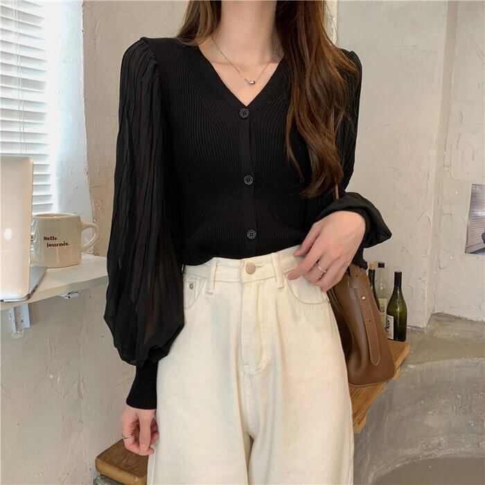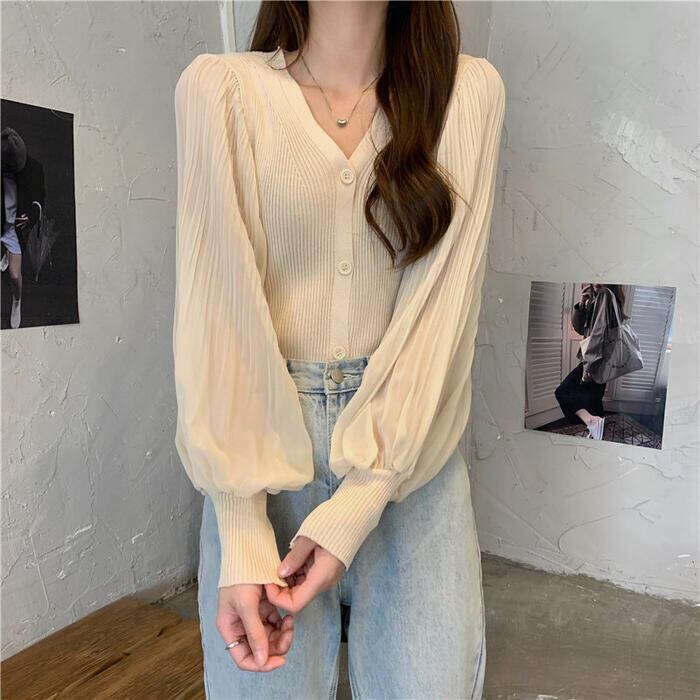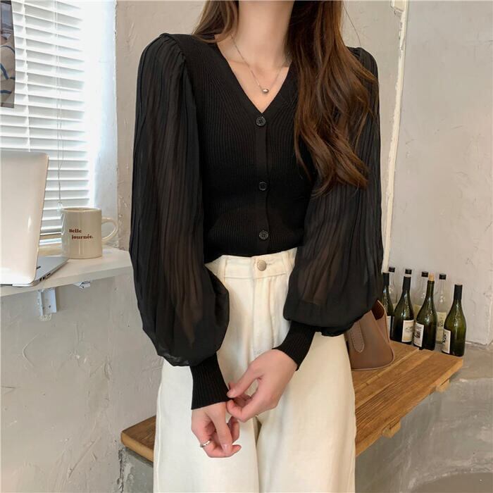繊細なシフォンプリーツのボリューム袖がドラマティックに揺れるドッキングニット。