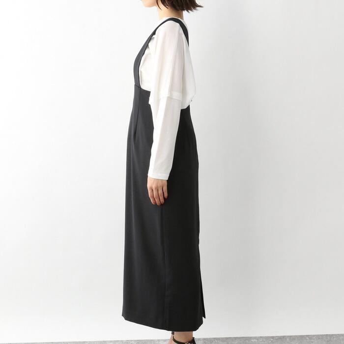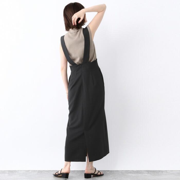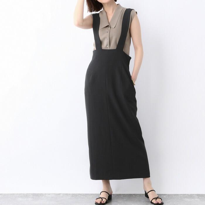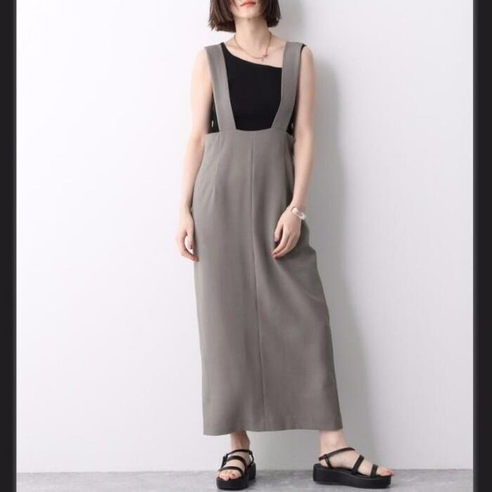 全3色 大きいサイズ 体型カバー エレガント フェミニン おしゃれ 楽ちん シンプル ボトムス スカート レディース きれいめ カジュアル 大人可愛い 春 夏 秋 サロペット ジャンパースカート タイト ミモレ丈 ハイウエスト グレー ベージュ ブラック 黒 20代 30代 40代 50代 フリー