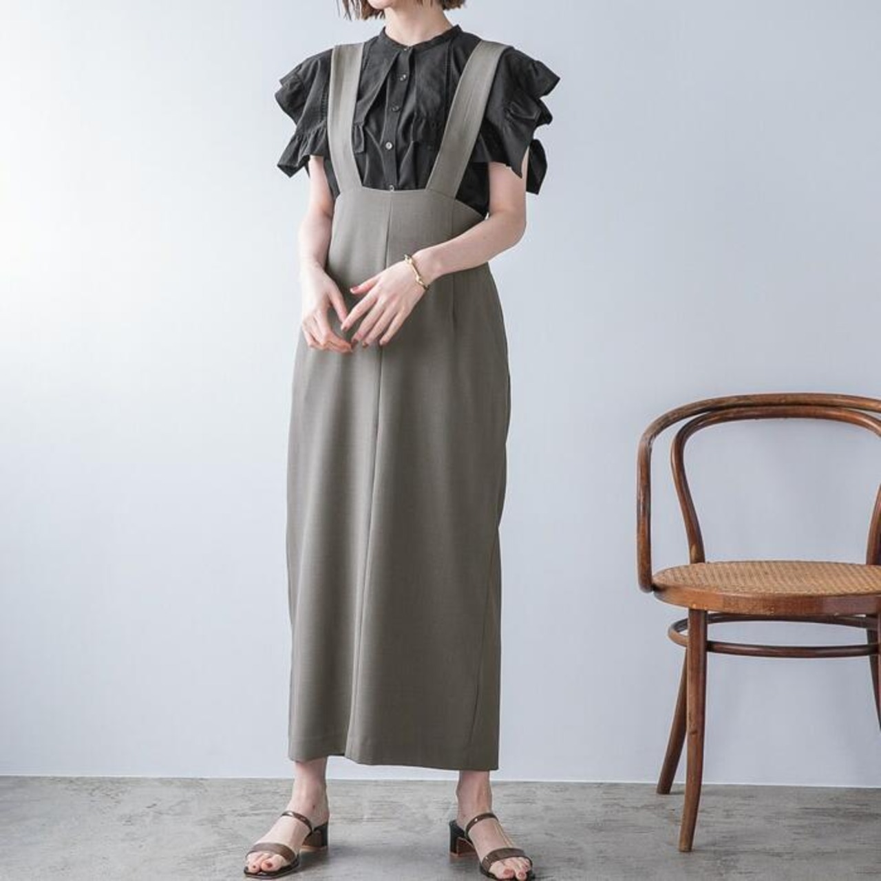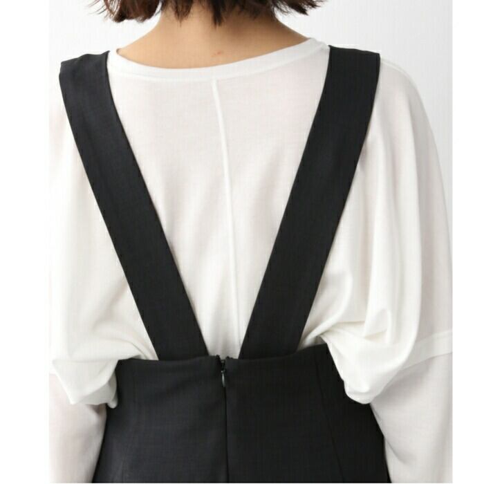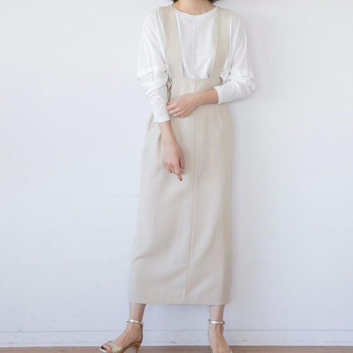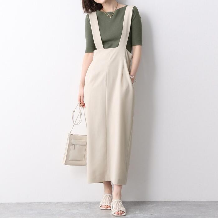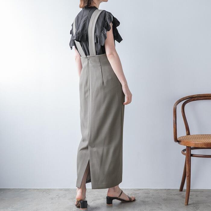 太めのショルダーストラップがアクセントになった、ハイウエストのサロペットスカート。