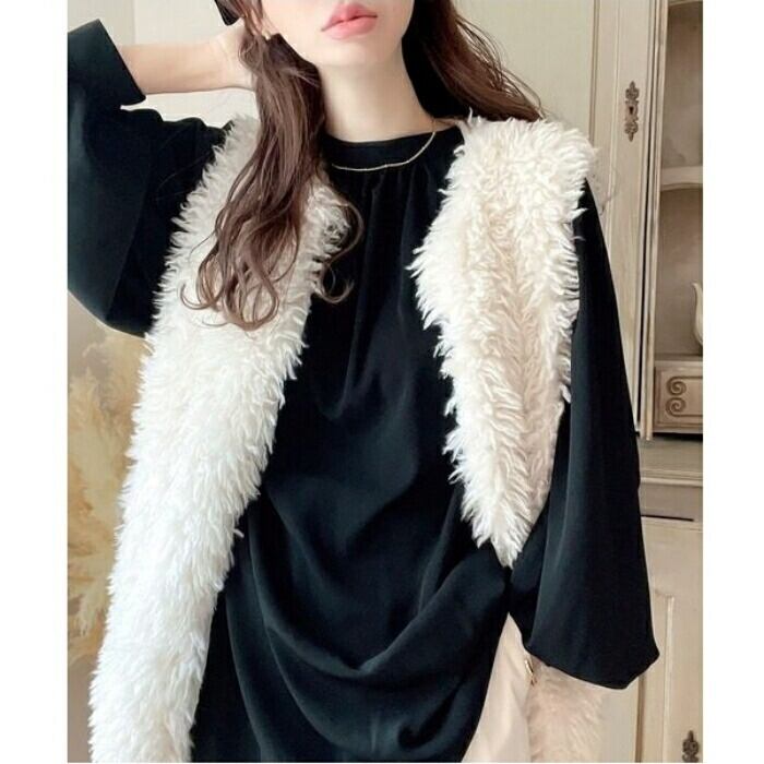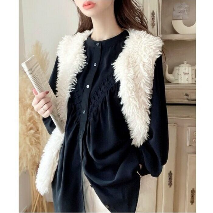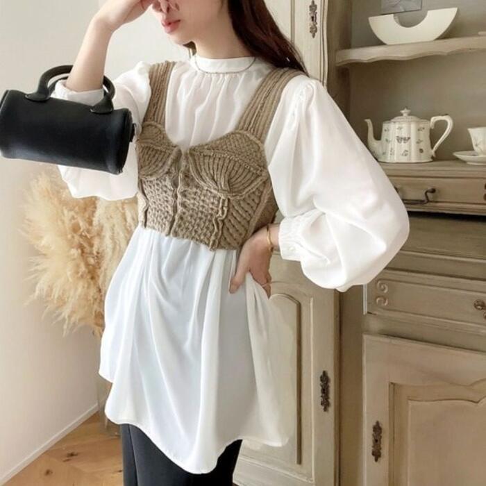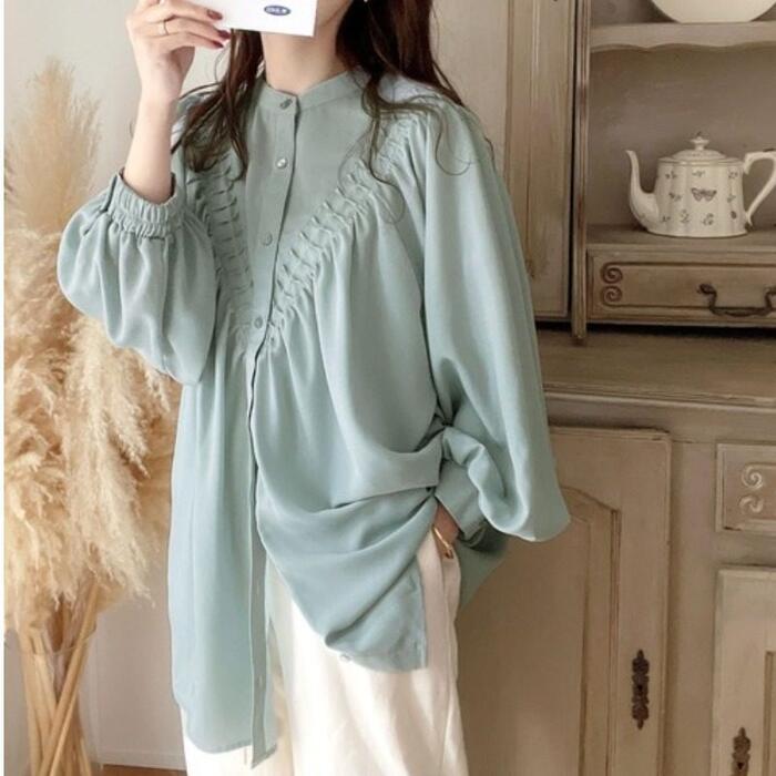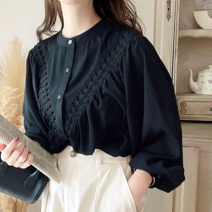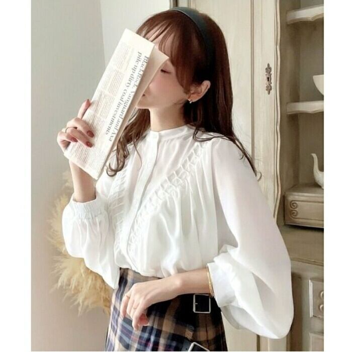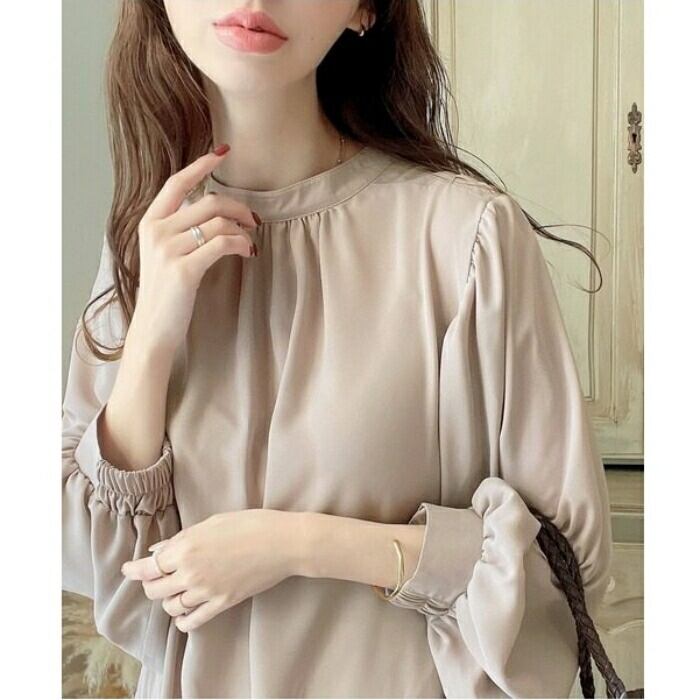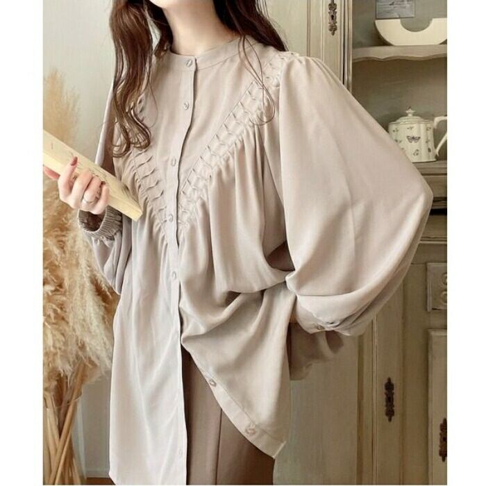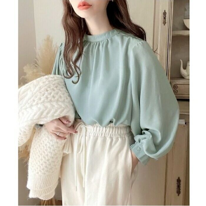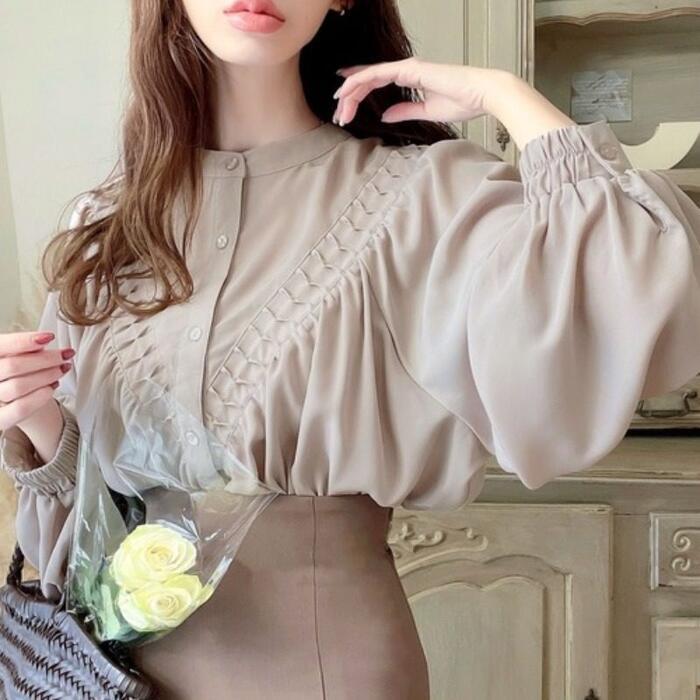 首元をスッキリ見せるバンドカラーとボリュームスリーブのコントラストが、大人の女性の可愛らしさを引き立てます。