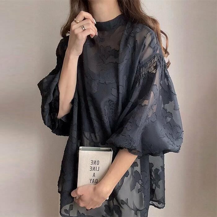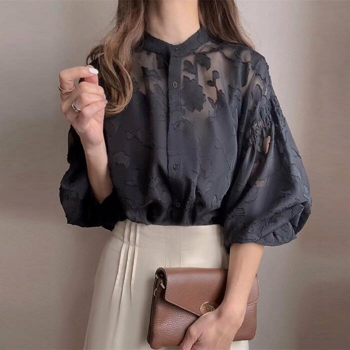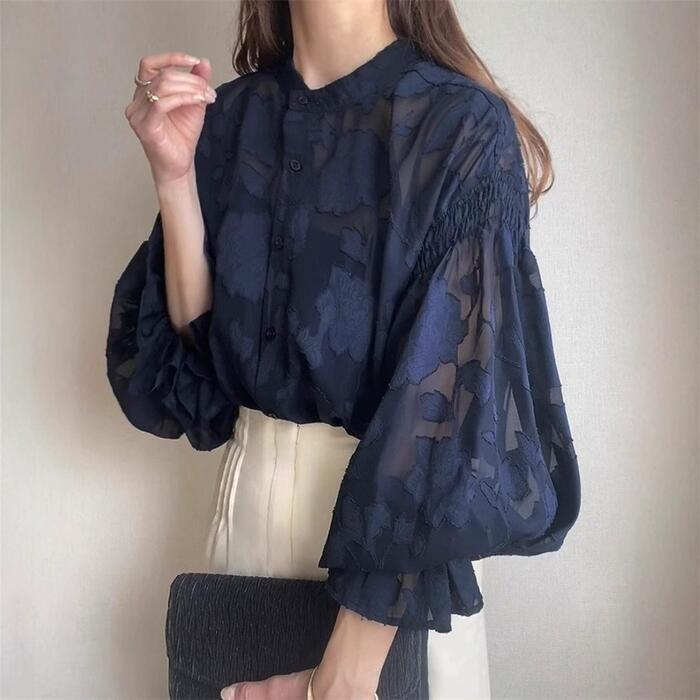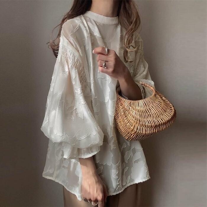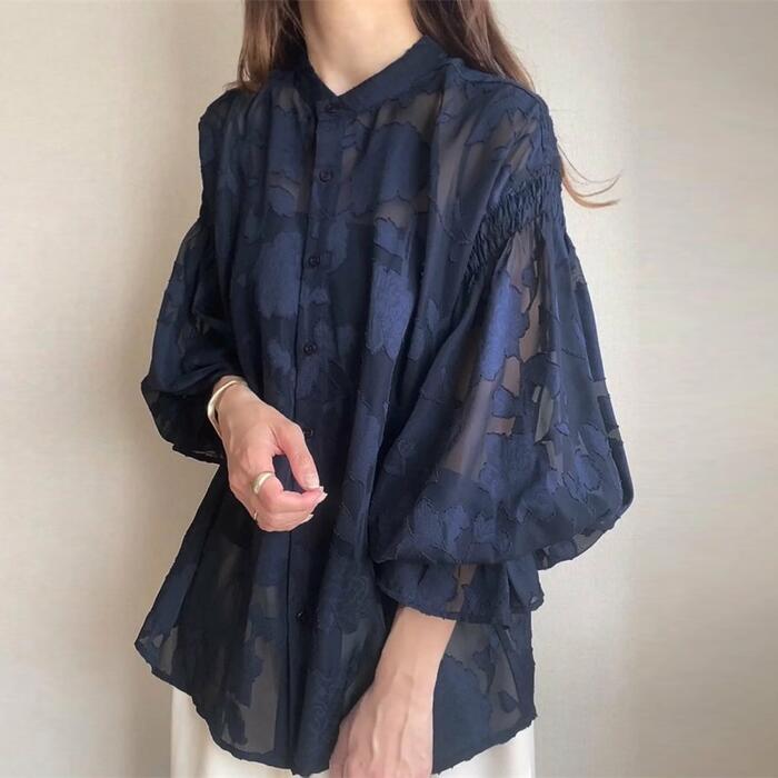 浮き上がるような花柄のジャガード織りが、贅沢で奥行きのある表情を作るシアーブラウス。