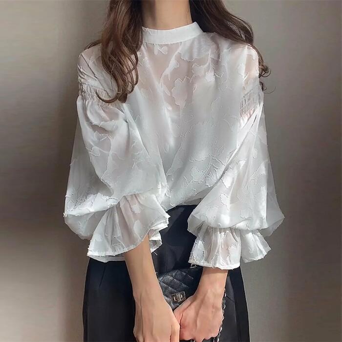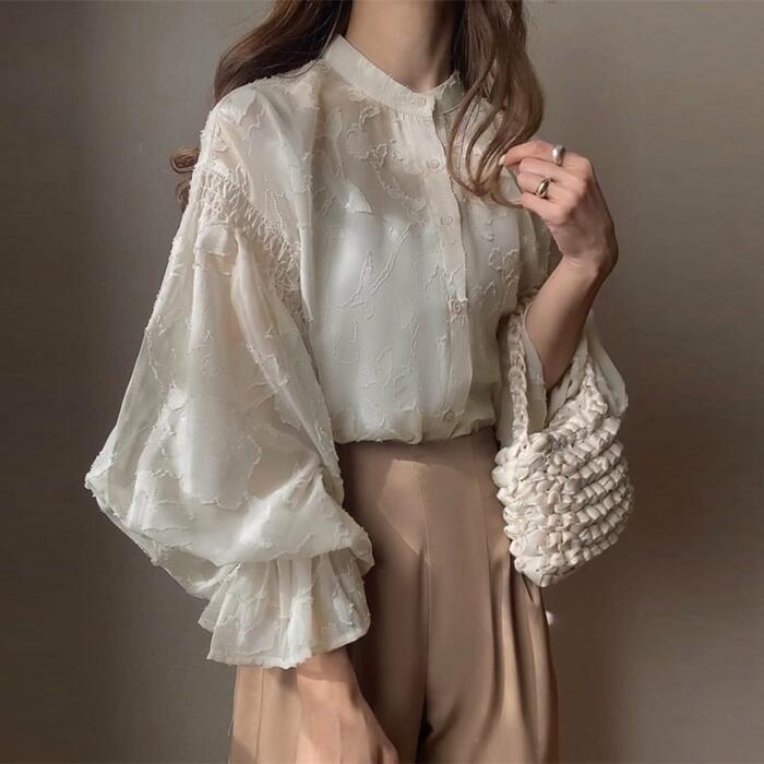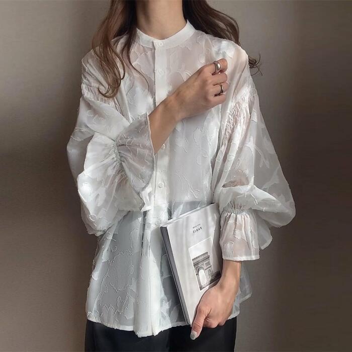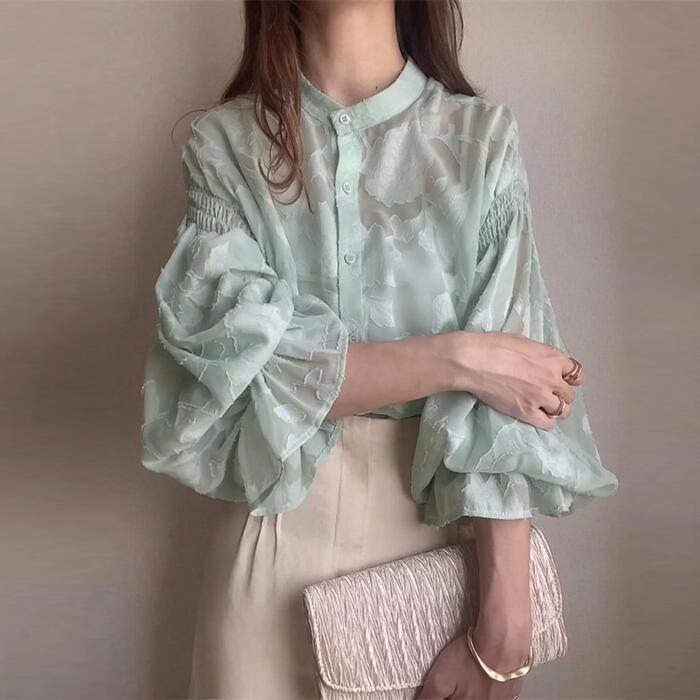 全5色 大きいサイズ 体型カバー エレガント フェミニン おしゃれ お呼ばれ 上品 トップス シャツ ブラウス レディース きれいめ カジュアル 大人可愛い 春 秋 冬 長袖 シアー 透け感 花柄 ジャガード パフスリーブ グリーン 緑 ベージュ ネイビー ブラック 黒 ホワイト 白 20代 30代 40代 50代 フリー