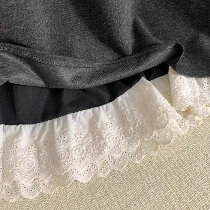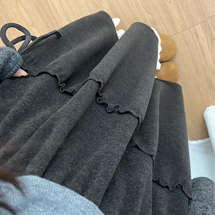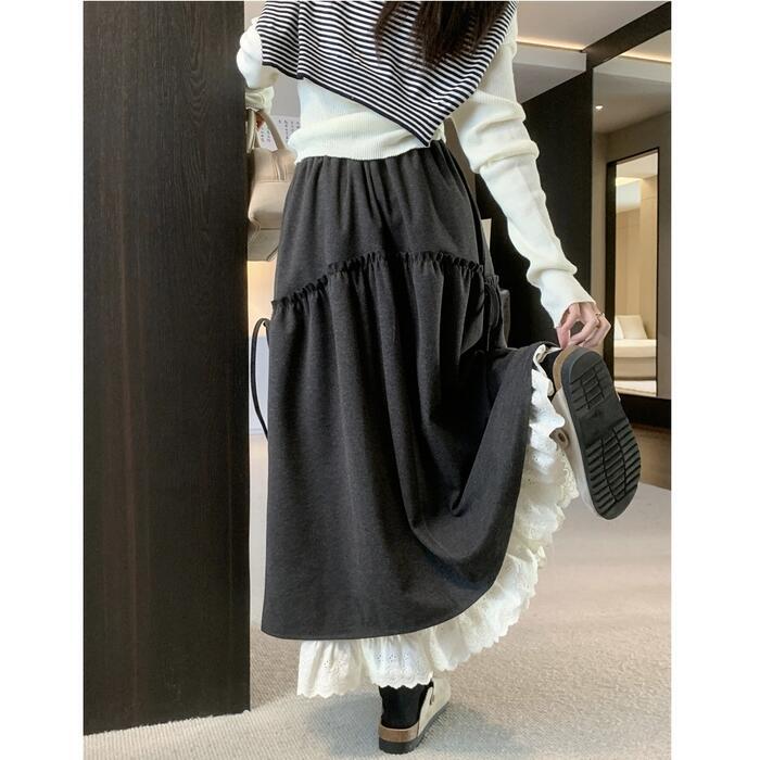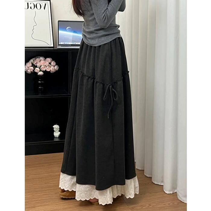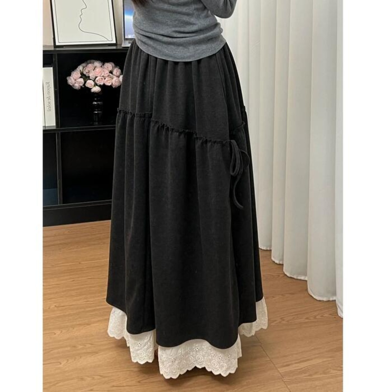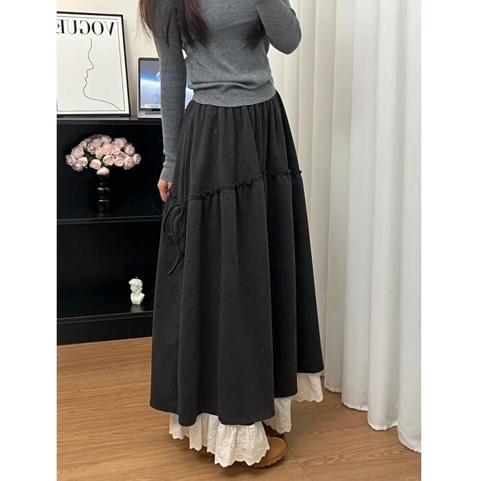 大きいサイズ 体型カバー エレガント フェミニン おしゃれ 楽ちん ボトムス スカート レディース きれいめ カジュアル 大人可愛い 春 秋 冬 Aライン レース フレア リボン ロング丈 ウエストゴム レイヤード風 グレー 20代 30代 40代 50代 S M L XL 2XL 3XL 4XL