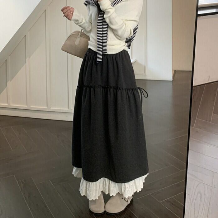 裾から覗くコットンレースが、コーディネートに程よい甘さをプラスしてくれるロングスカートです。