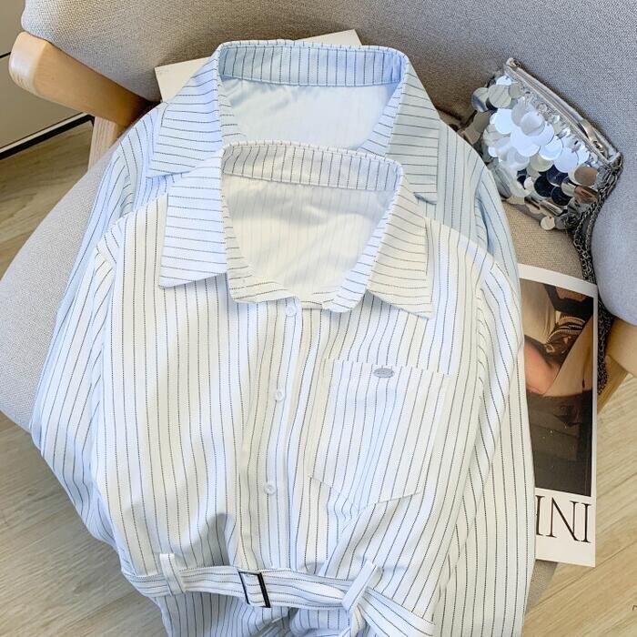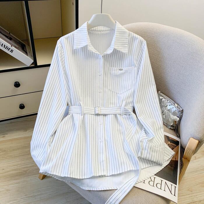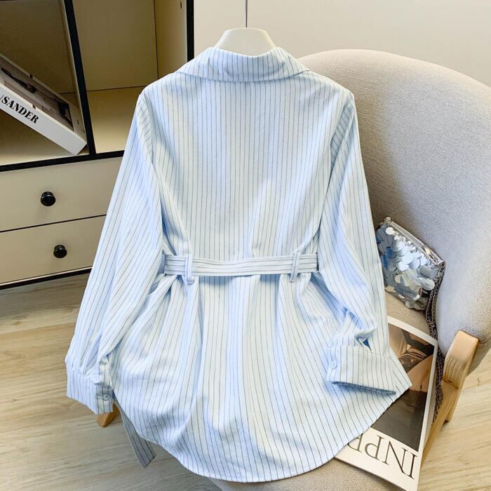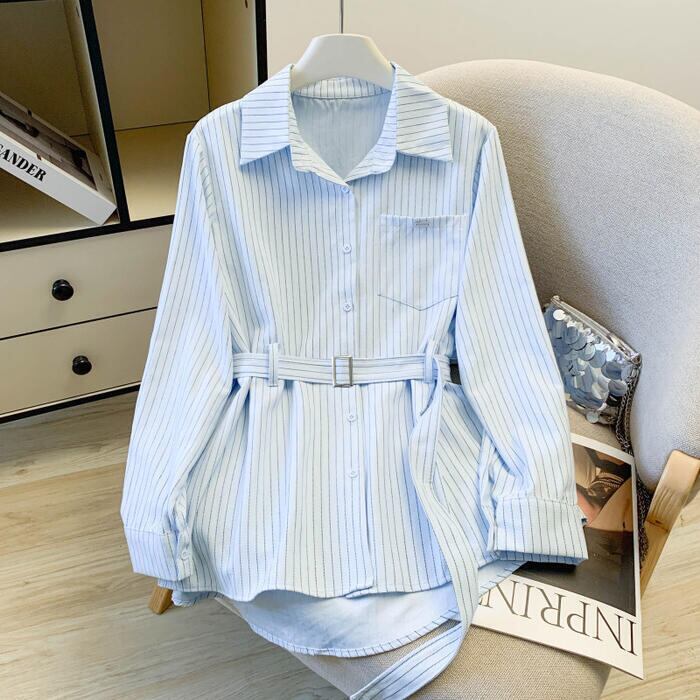 全2色 大きいサイズ 体型カバー エレガント フェミニン おしゃれ カットソー シンプル 通勤 トップス シャツ ブラウス レディース きれいめ カジュアル 大人可愛い 春 秋 冬 長袖 ストライプ ウエストベルト チュニック ブルー 青 ホワイト 白 20代 30代 40代 50代 S M L XL 2XL