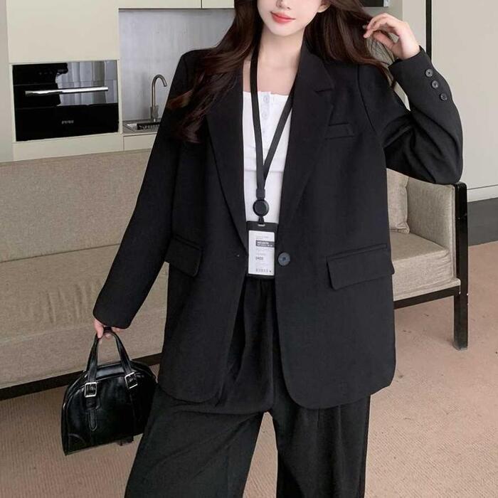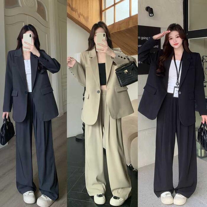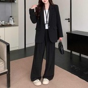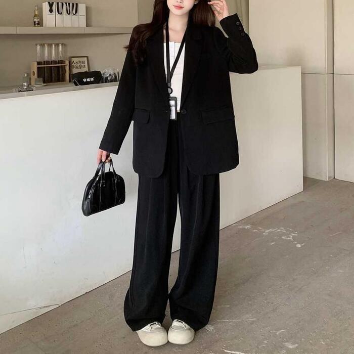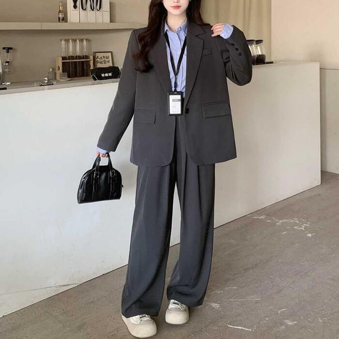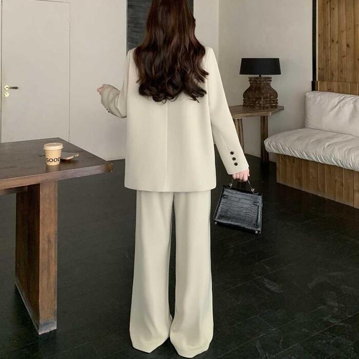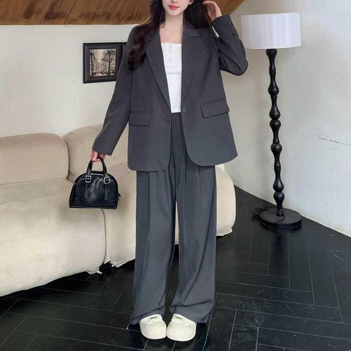 トレンドのオーバーシルエットを取り入れた、テーラードジャケット&ワイドパンツのセットアップ。