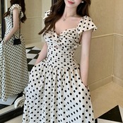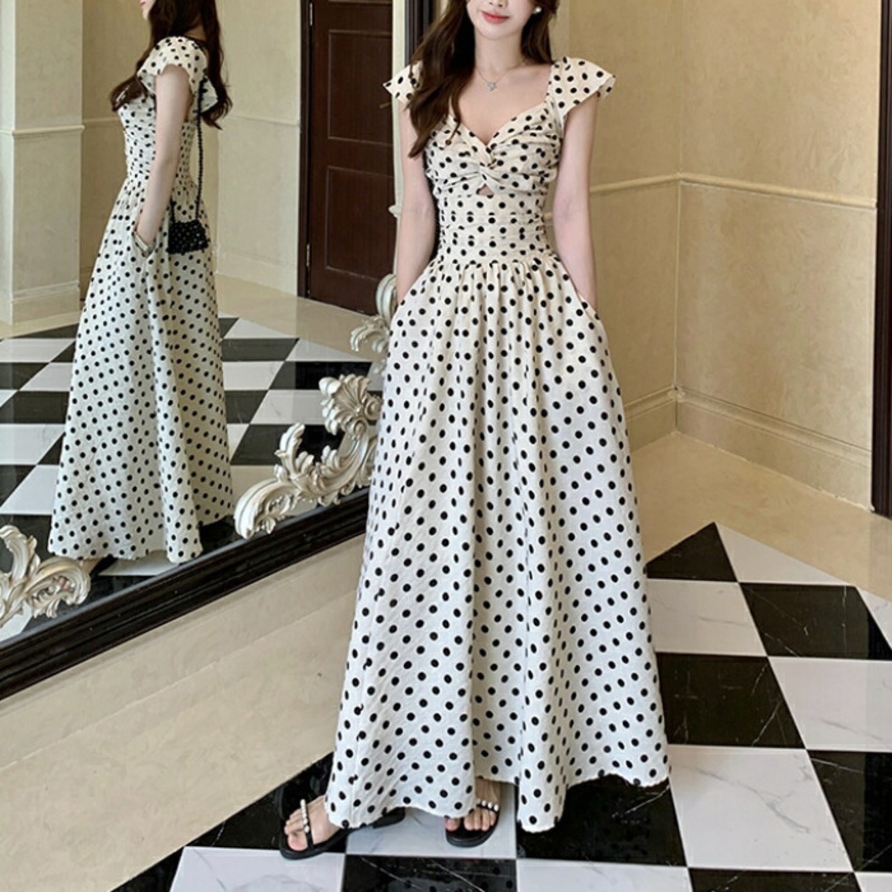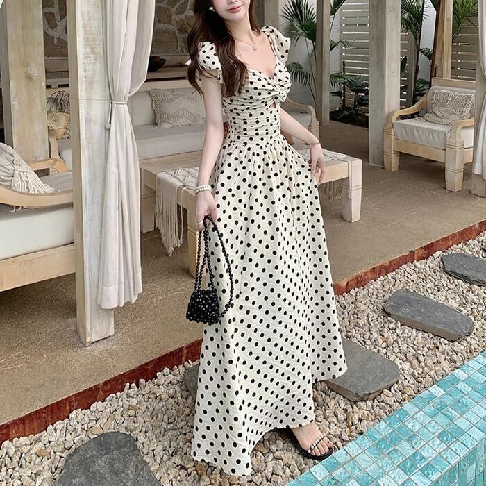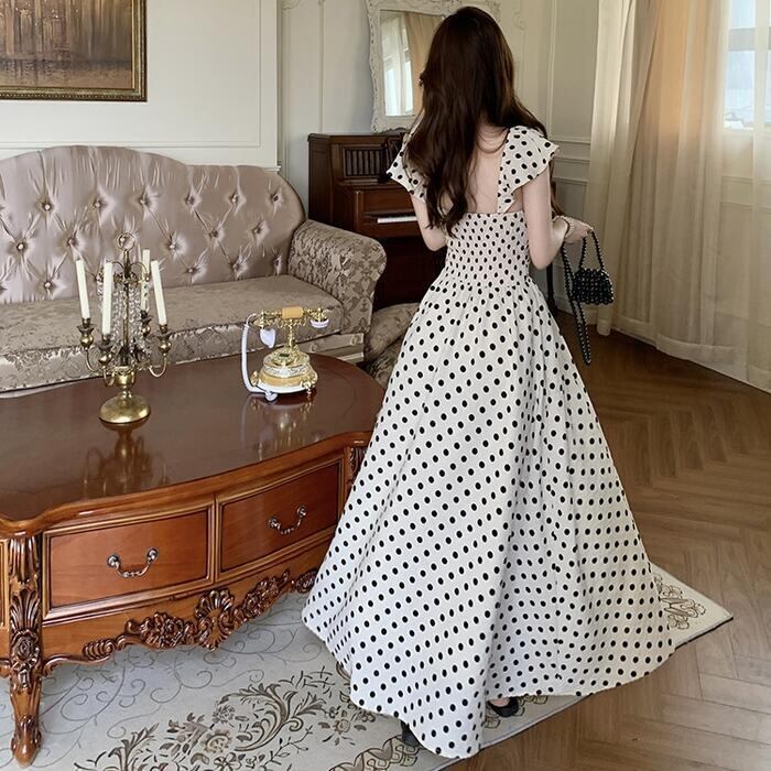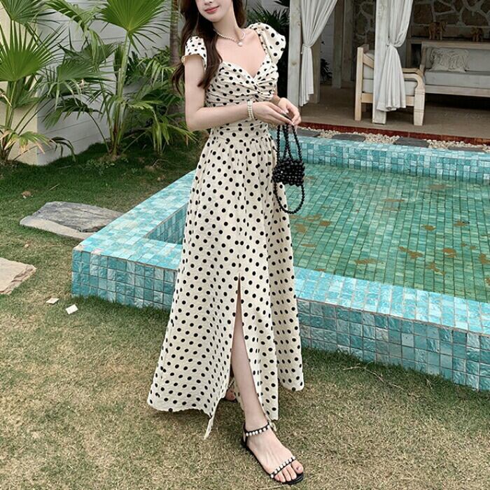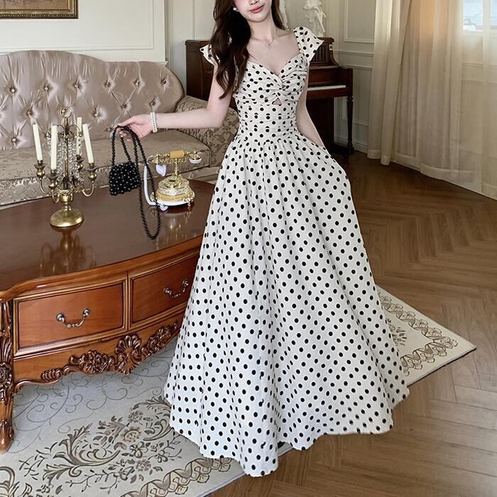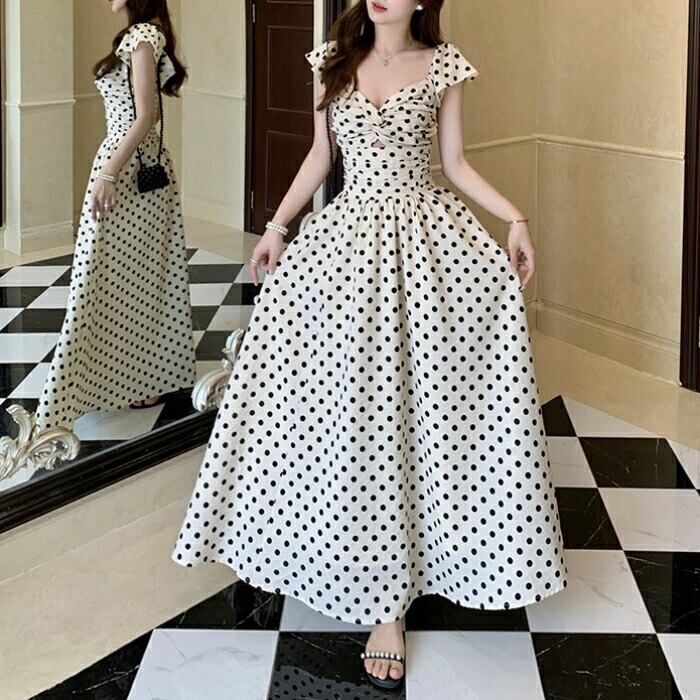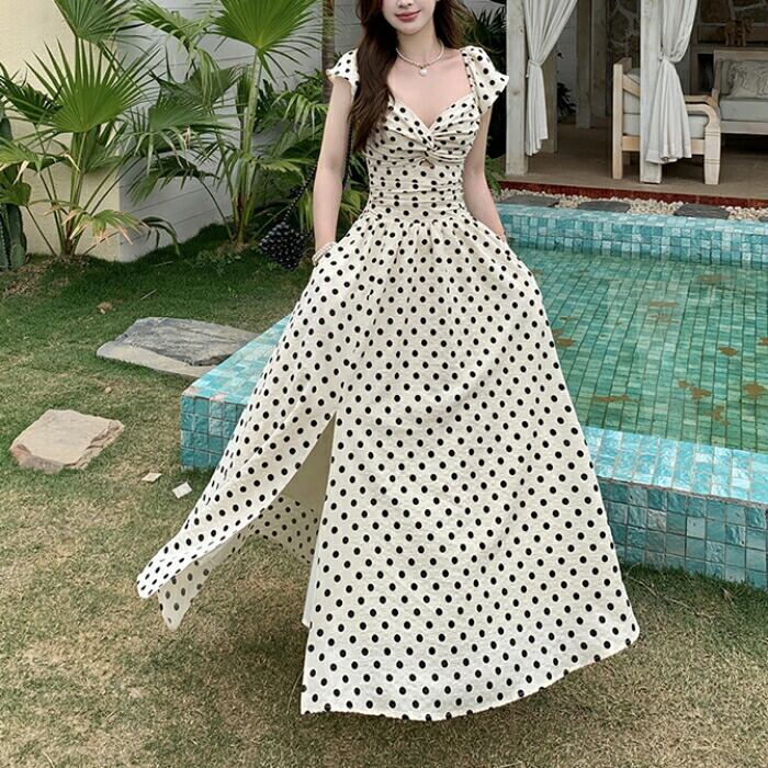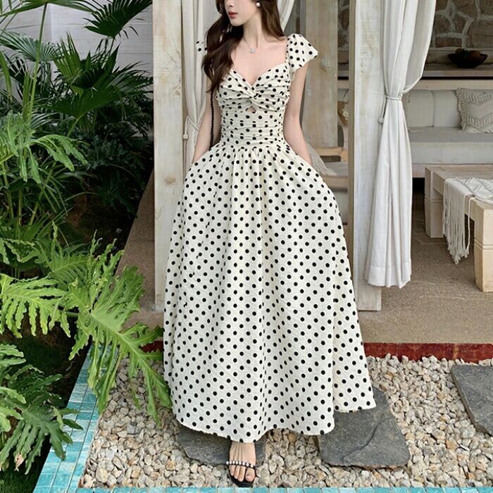 レトロで上品なドット柄が夏の陽射しに映えるマキシワンピース。