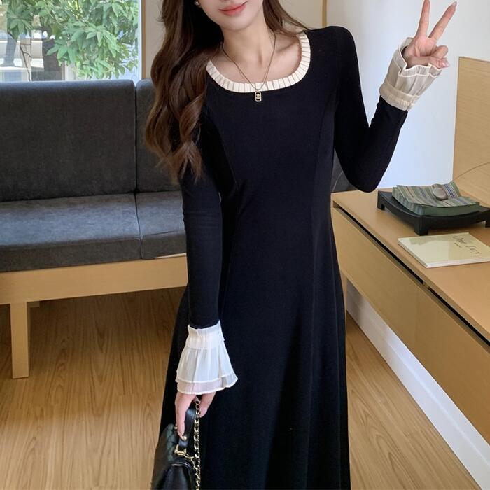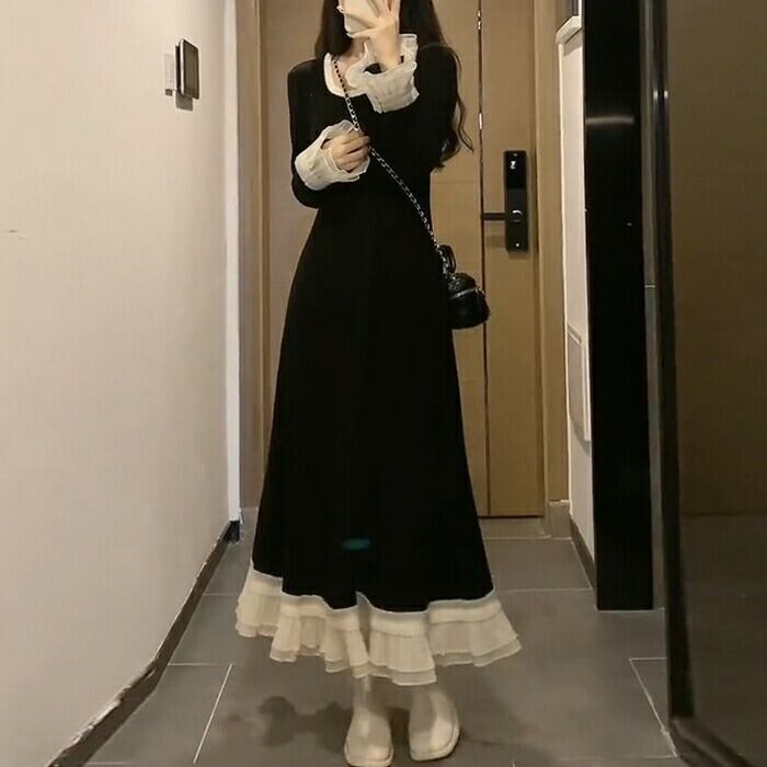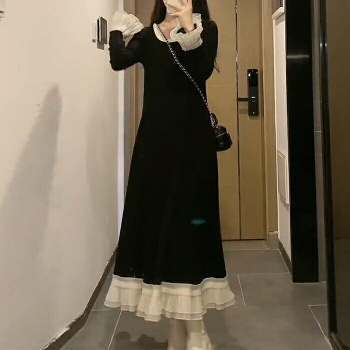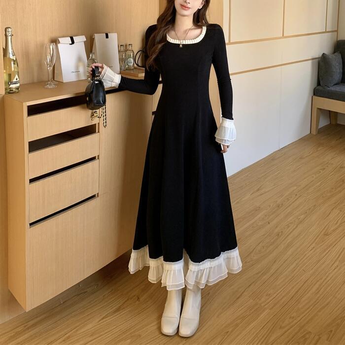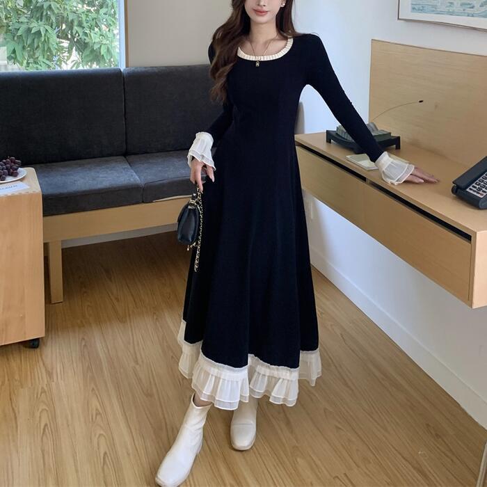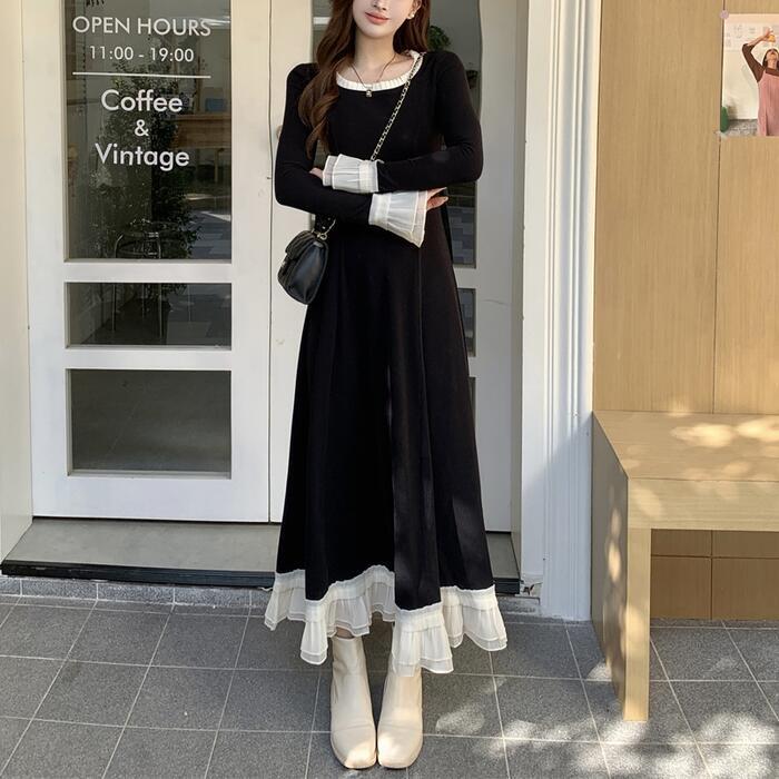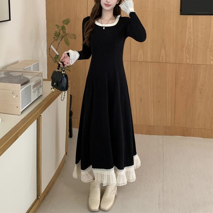 大きいサイズ 体型カバー エレガント フェミニン おしゃれ シンプル ワンピース ドレス レディース きれいめ カジュアル 大人可愛い 春 秋 冬 長袖 フリル レース ロング丈 Aライン バイカラー 配色 ロングワンピ ブラック 黒 20代 30代 40代 50代 M L XL 2XL 3XL 4XL