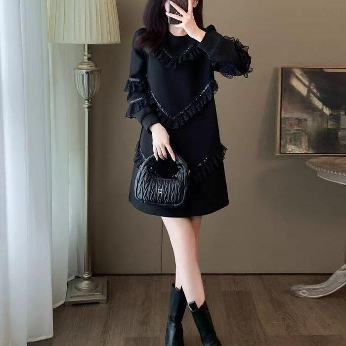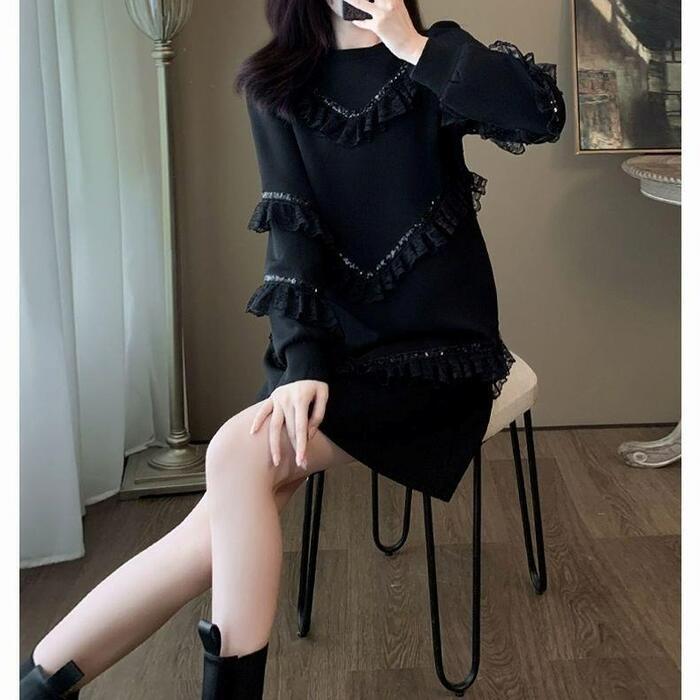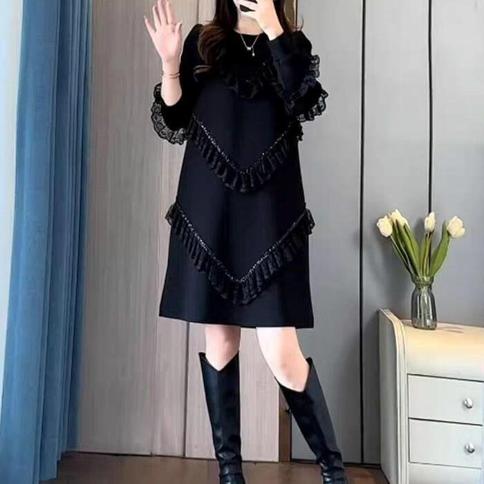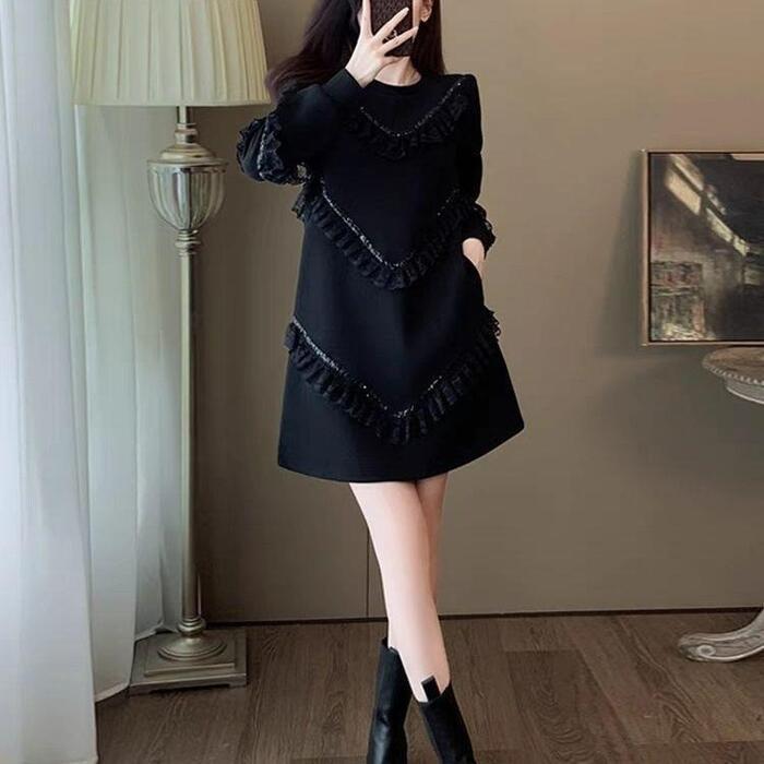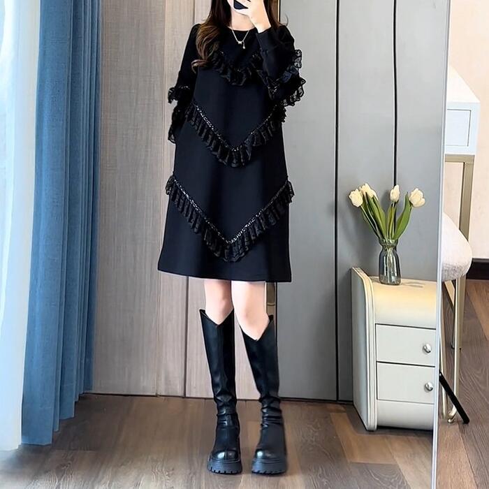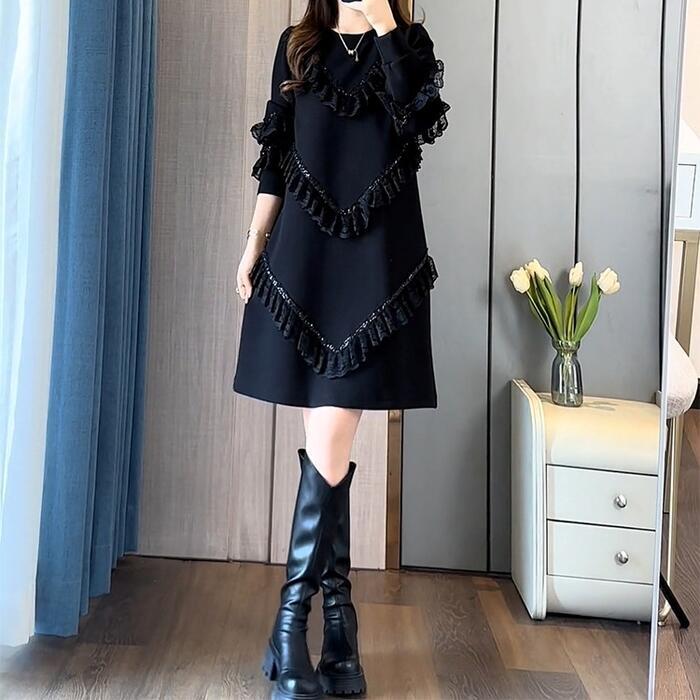 大きいサイズ 体型カバー エレガント フェミニン おしゃれ 上品 お呼ばれ ワンピース ドレス レディース きれいめ カジュアル 大人可愛い 春 秋 冬 長袖 フリル レース スパンコール ミニ丈 ショート丈 Aライン ブラック 黒 20代 30代 40代 50代 M L XL 2XL
