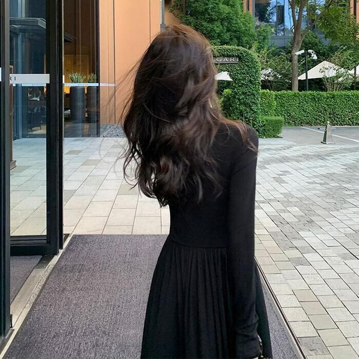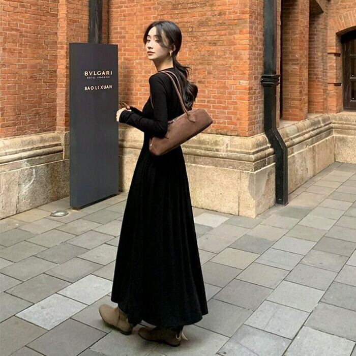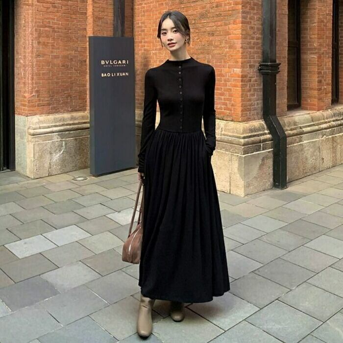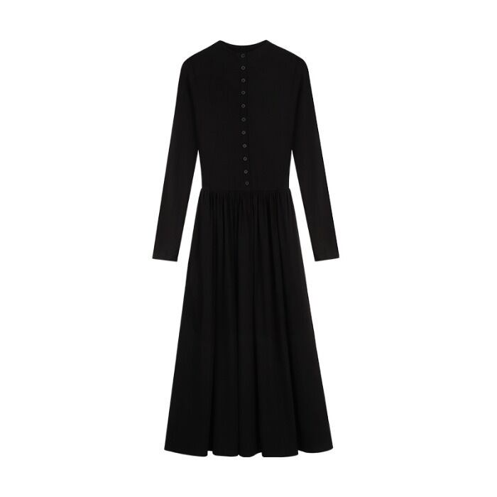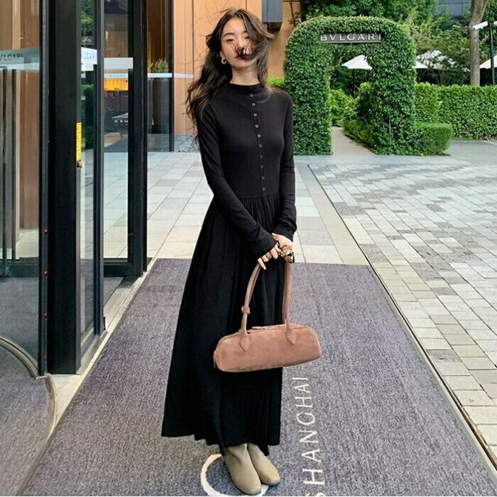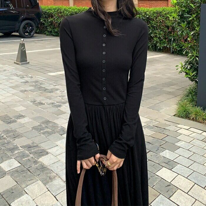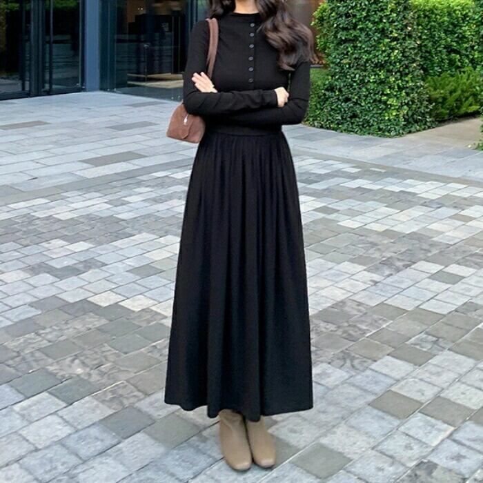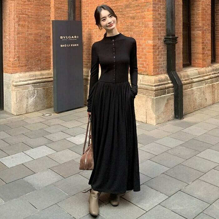 大きいサイズ 体型カバー エレガント フェミニン おしゃれ シンプル ワンピース ドレス レディース きれいめ カジュアル 大人可愛い 春 秋 冬 長袖 フロントボタン ハイウエスト ギャザースカート マキシ丈 Aライン ロングワンピース ブラック 黒 20代 30代 40代 50代 S M L XL