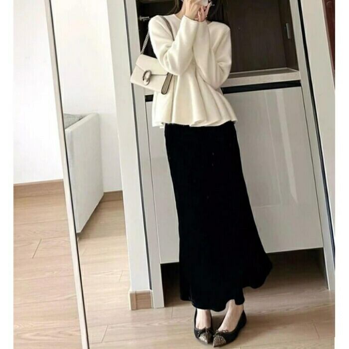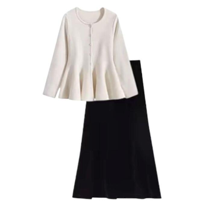 大きいサイズ 体型カバー エレガント フェミニン おしゃれ 2点セット セットアップ スカート トップス レディース きれいめ カジュアル 大人可愛い 春 秋 冬 ニット ペプラム プルオーバー スカート ロング丈 マーメイド ホワイト 白 ブラック 黒 20代 30代 40代 50代 M L XL