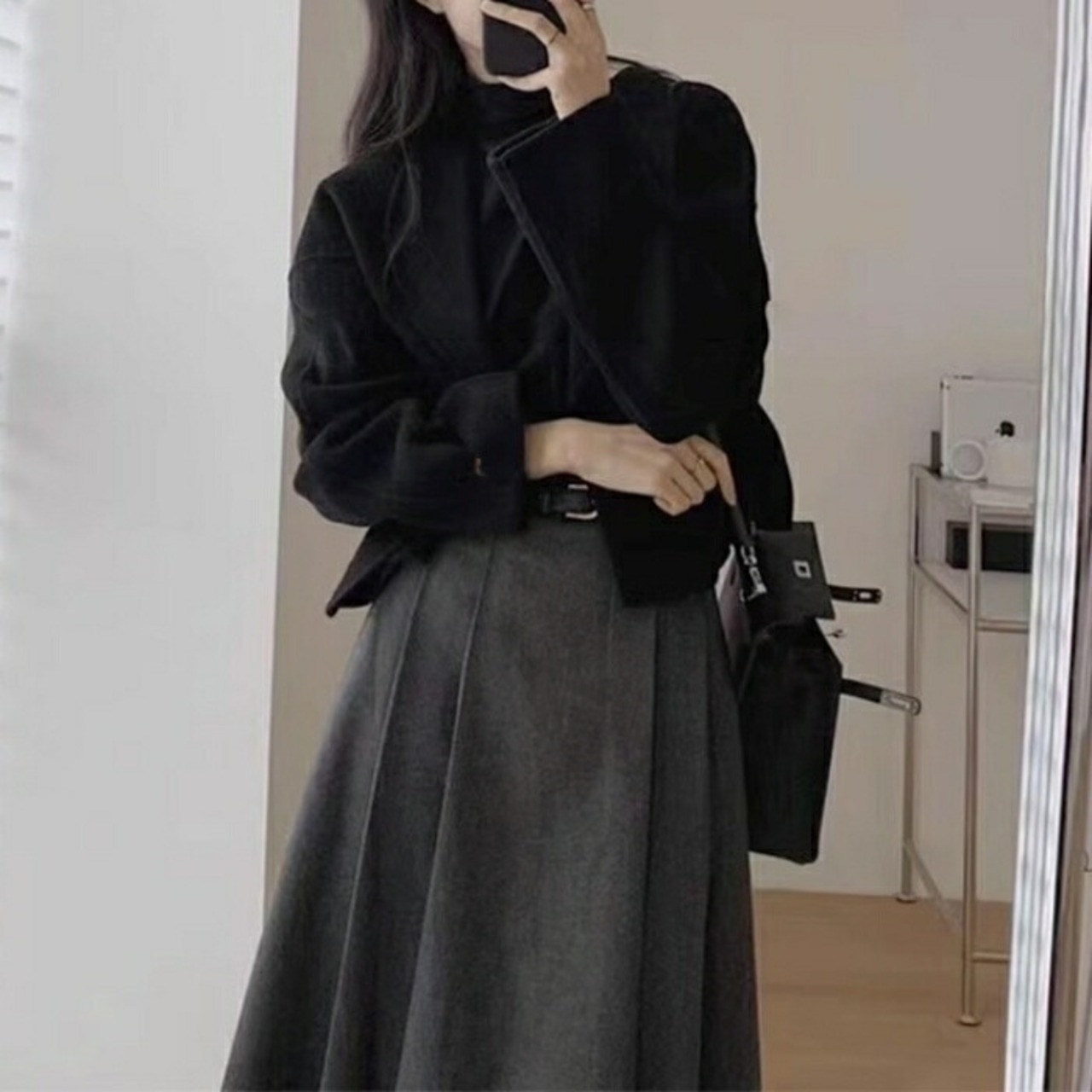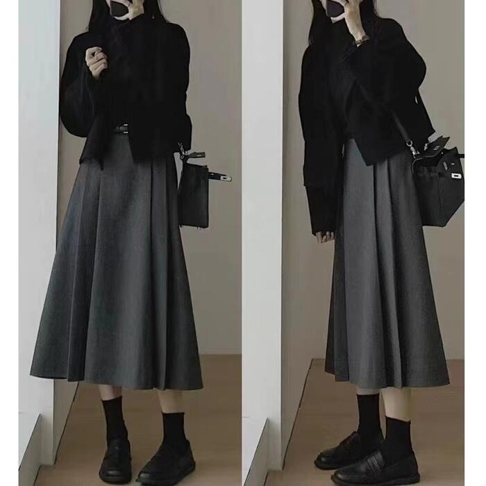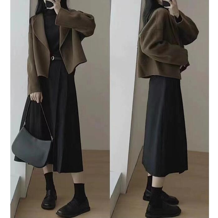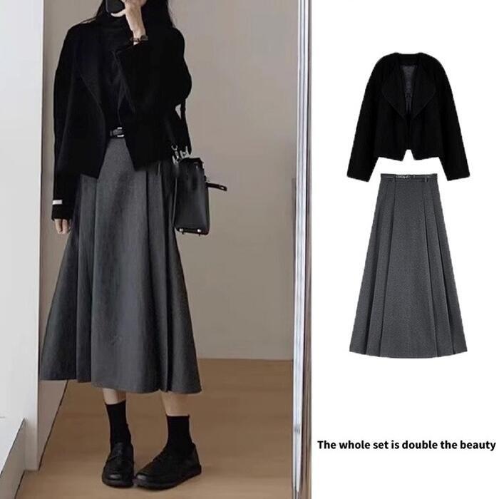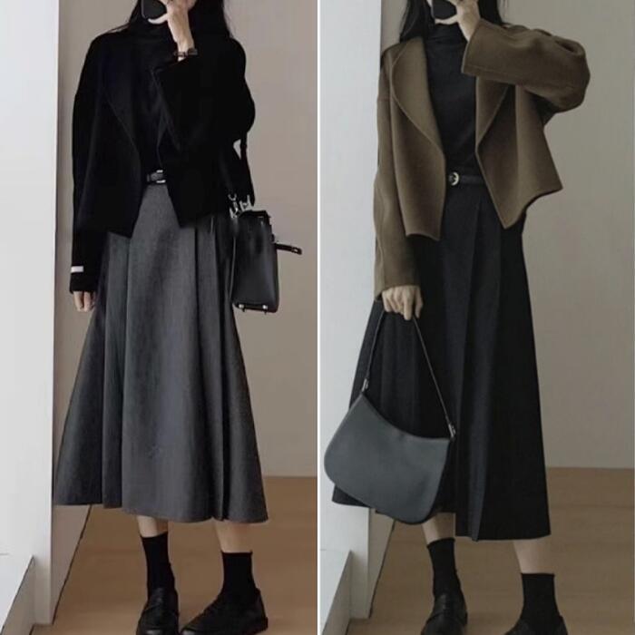 全2色 大きいサイズ 体型カバー エレガント フェミニン おしゃれ 2点セット セットアップ アウター コート スカート 春 秋 冬 レディース きれいめ カジュアル 大人可愛い ジャケット プリーツ ミモレ丈 フレアスカート ブラック 黒 グレー ブラウン 20代 30代 40代 50代 M L XL