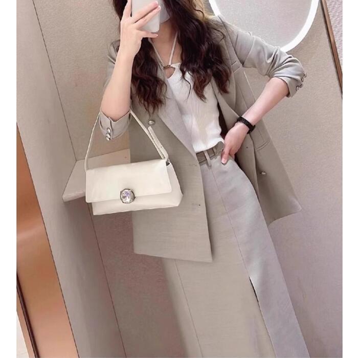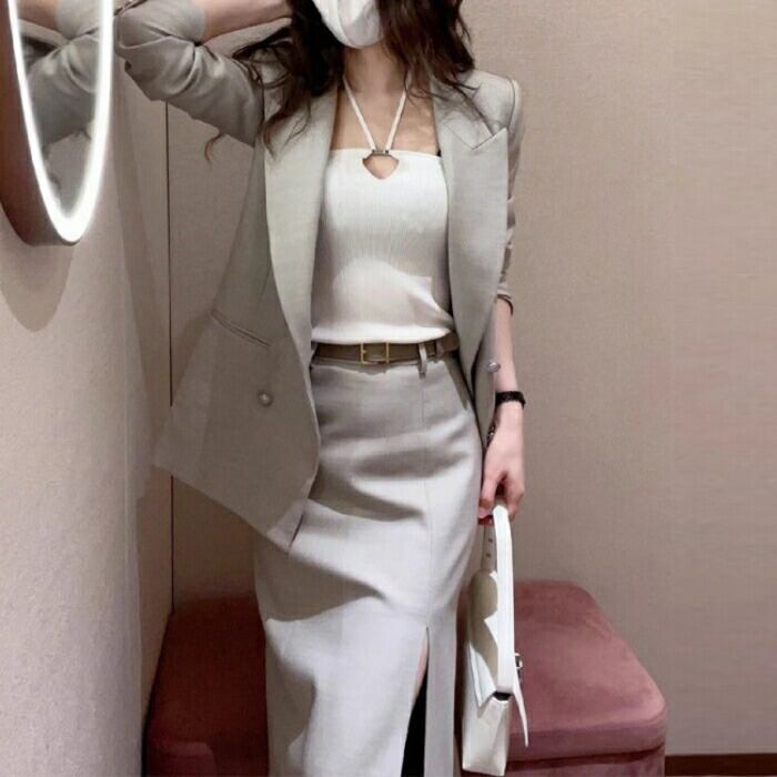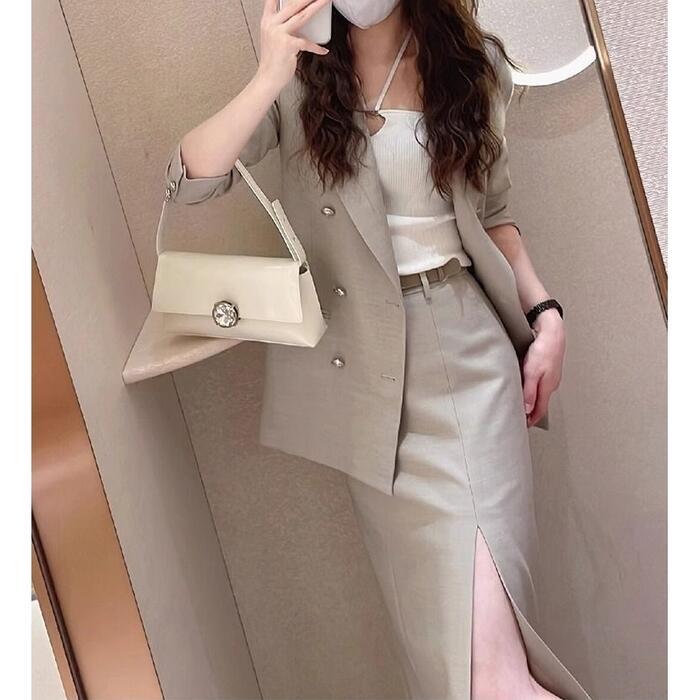 ダブルボタンのテーラードジャケット&フロントスリットスカートのセットアップです。