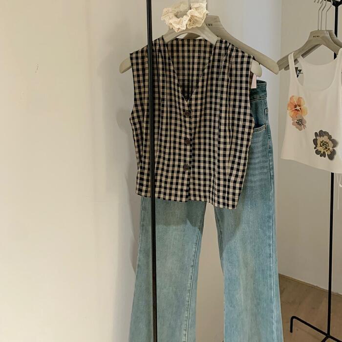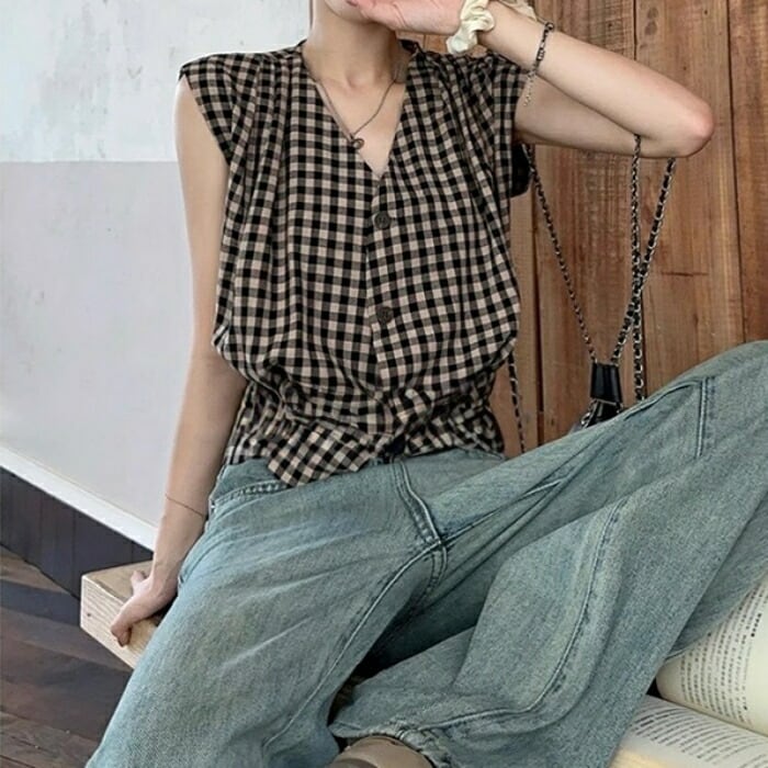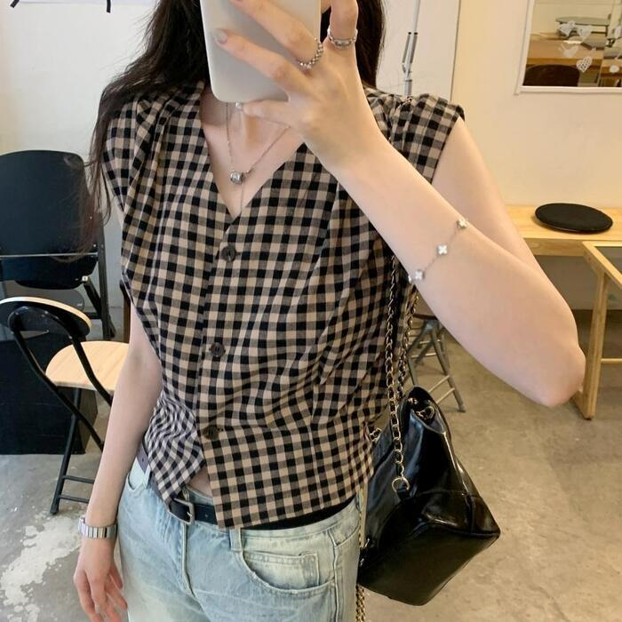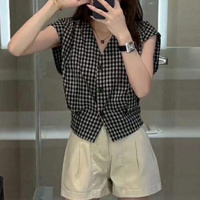ギンガムチェック柄の、Vネックフレンチスリーブブラウス。