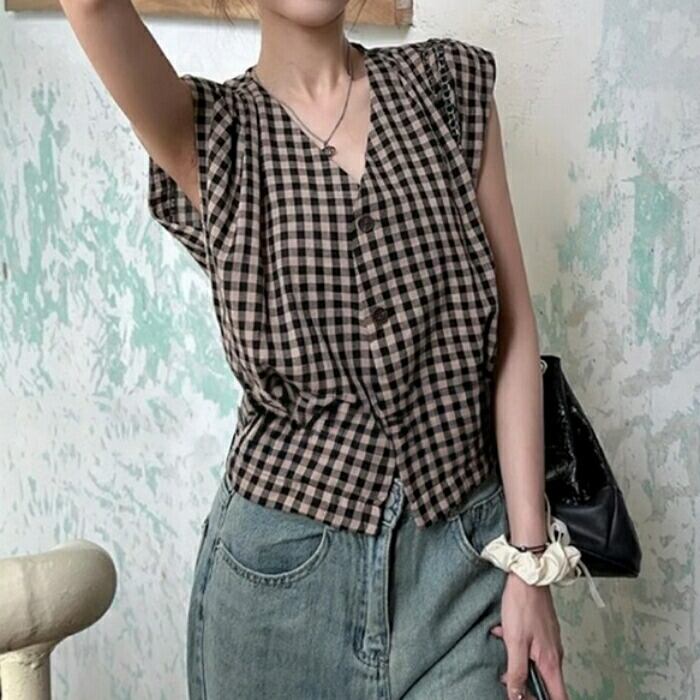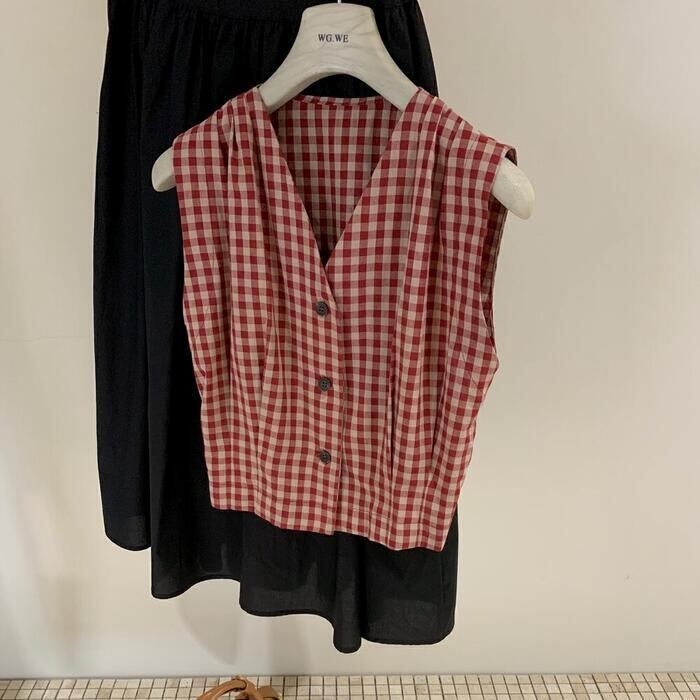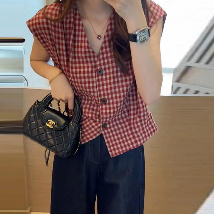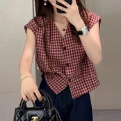 全2色 大きいサイズ 体型カバー エレガント フェミニン おしゃれ シンプル トップス ブラウス シャツ レディース きれいめ カジュアル 大人可愛い 春 夏 秋 ノースリーブ ギンガムチェック Vネック ショート丈 フレンチスリーブ レッド 赤 ブラック 黒 20代 30代 40代 50代 M L XL 2XL