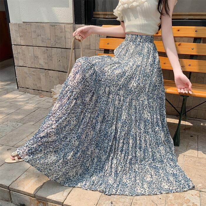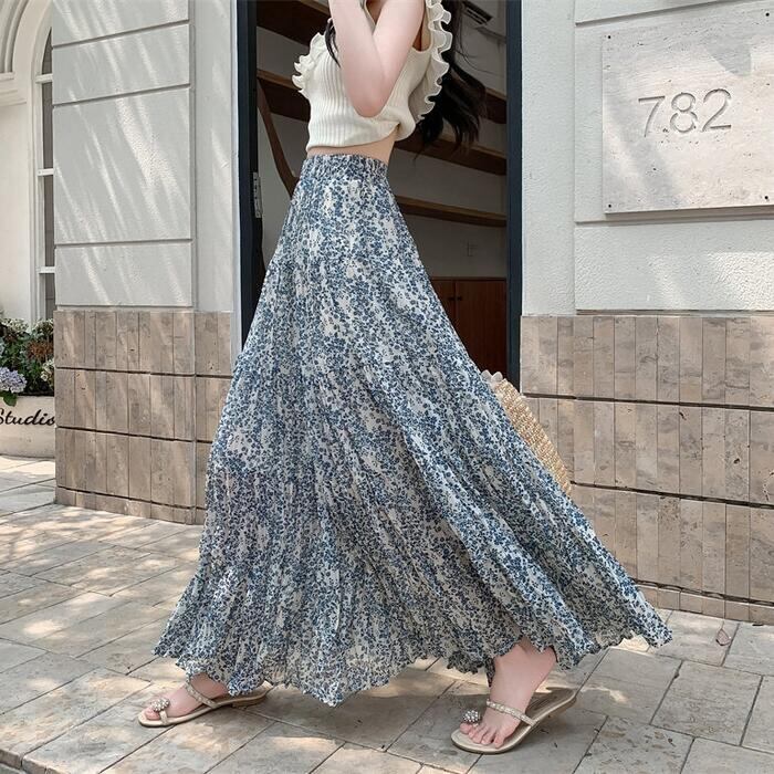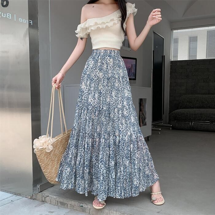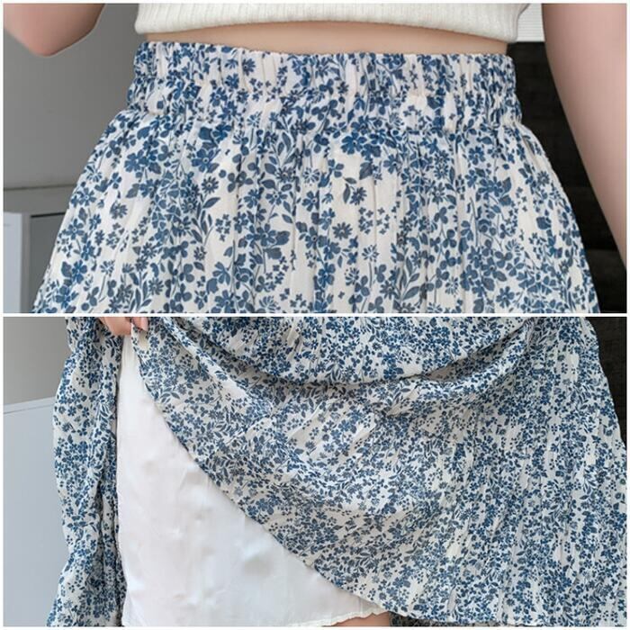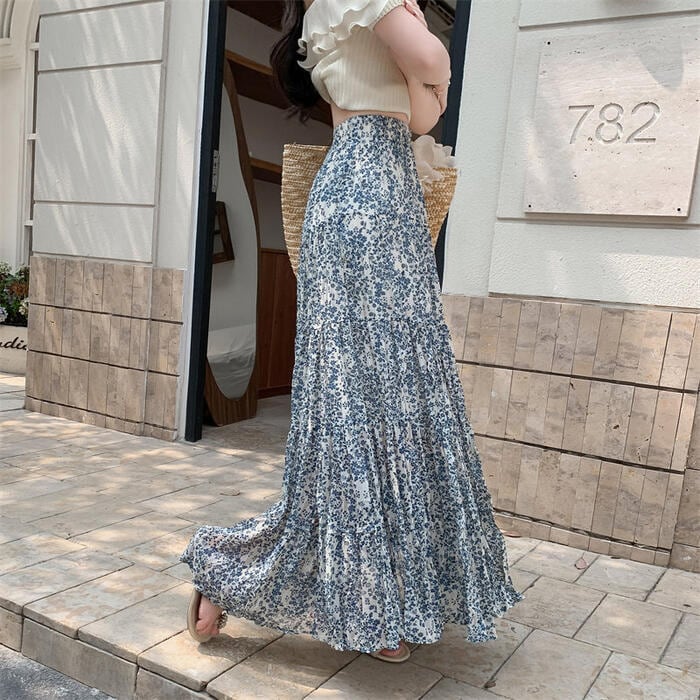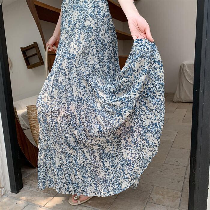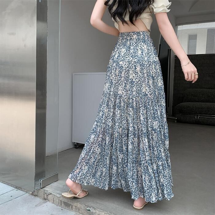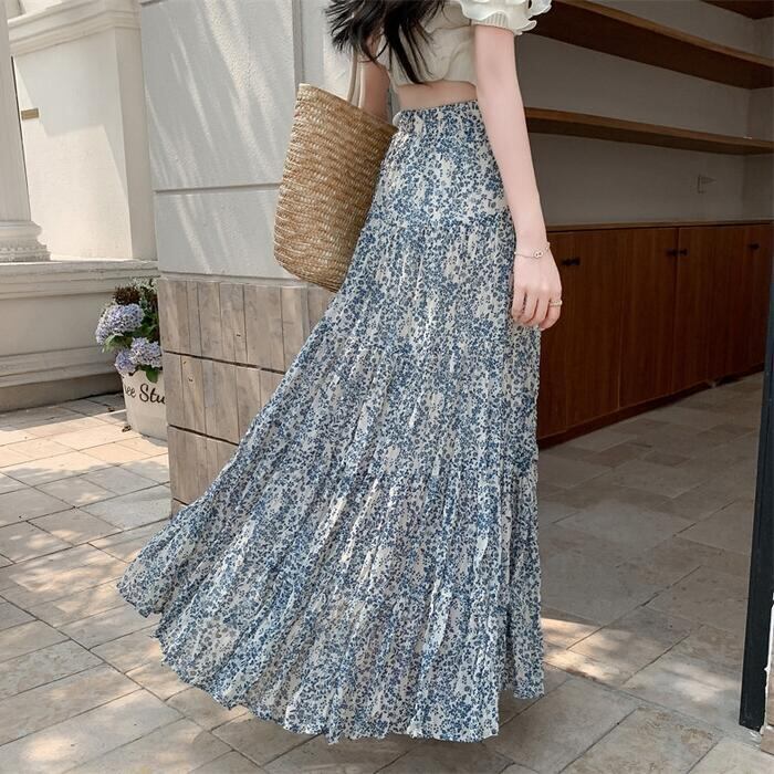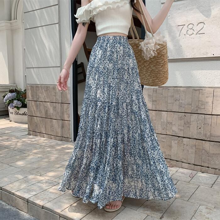 ブルーの小花柄が全面に施された、清涼感あふれるティアードロングスカート。