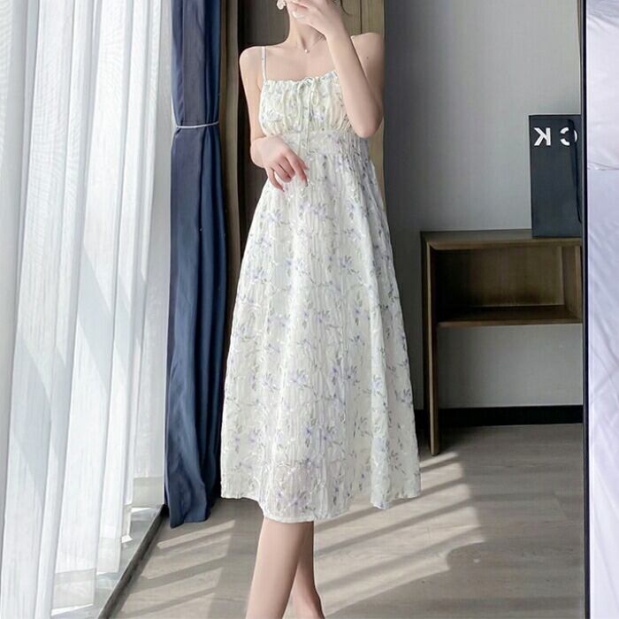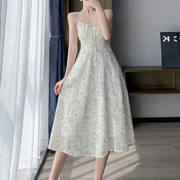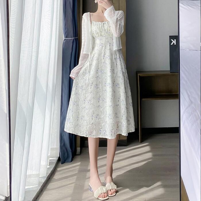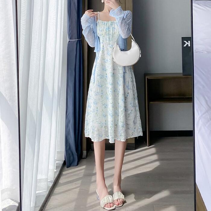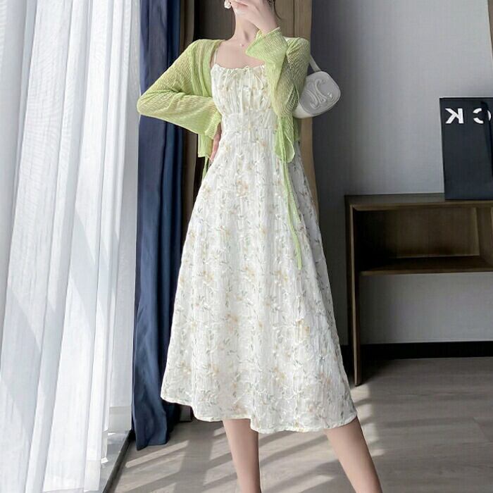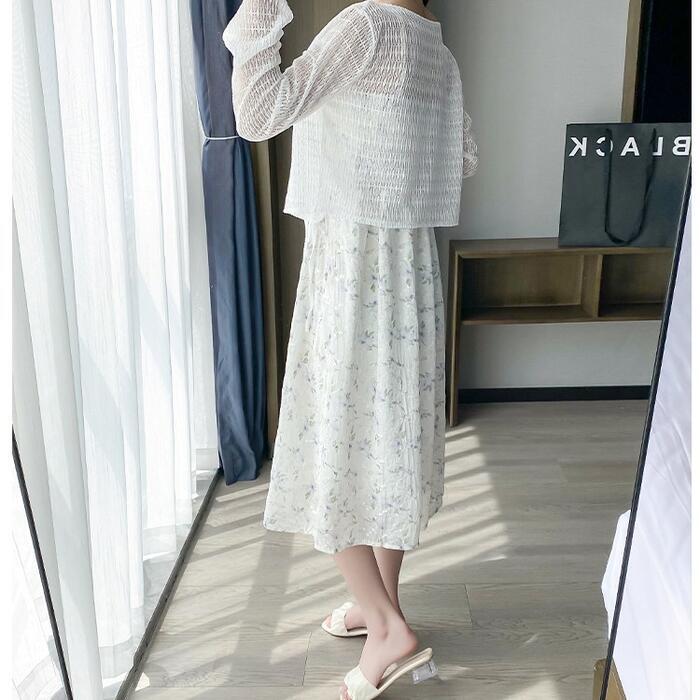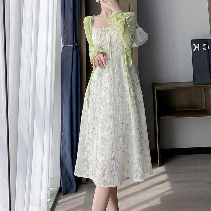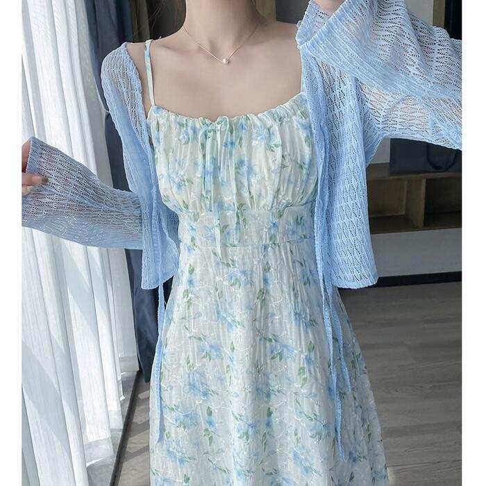 フローラルキャミワンピース&シアーカーディガンのセット。