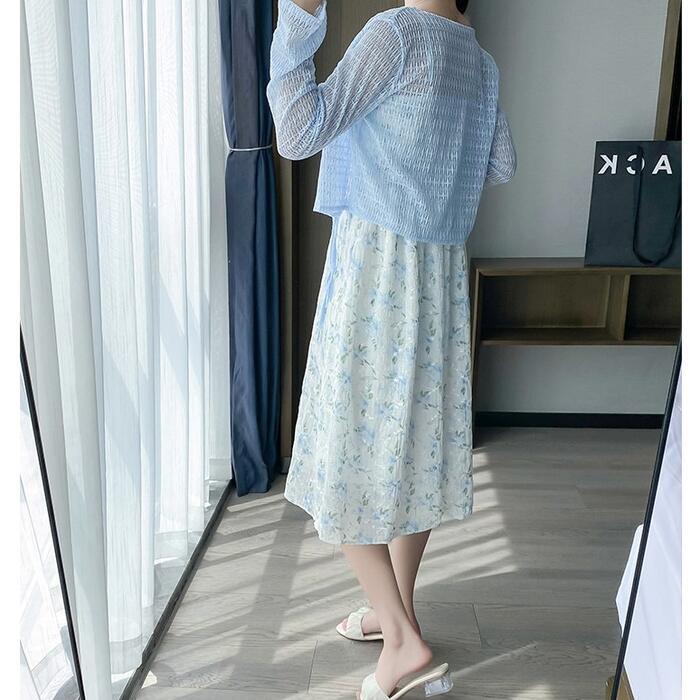 ワンピースの柔らかな質感とカーディガンの透け感が重なり合い、女性らしい透明感のある美しさを演出します。