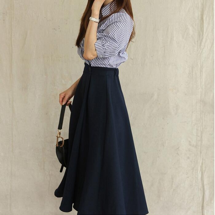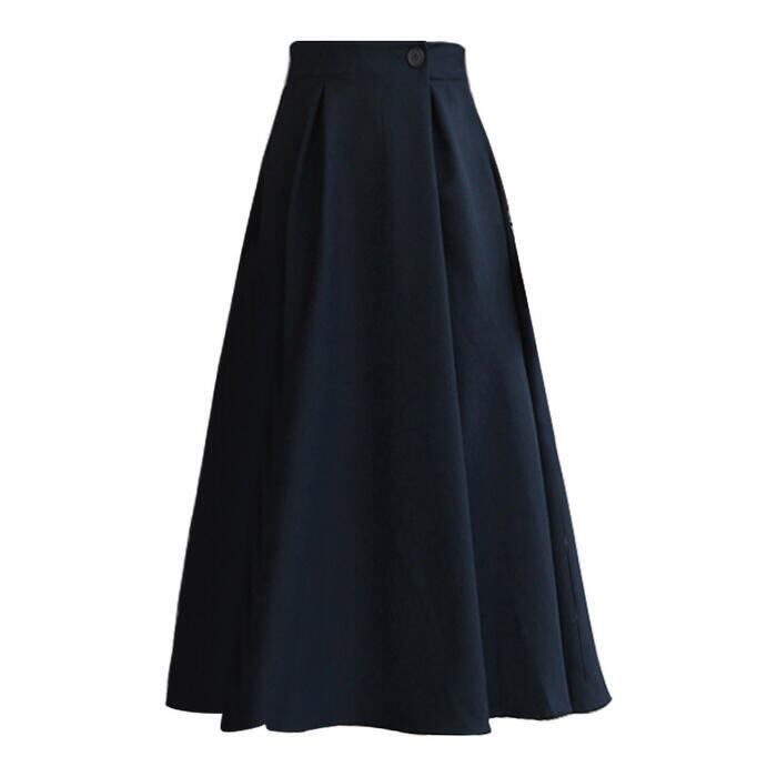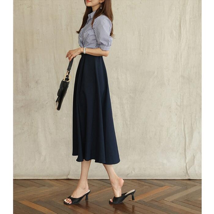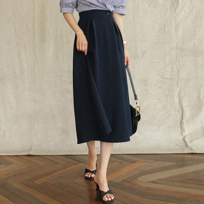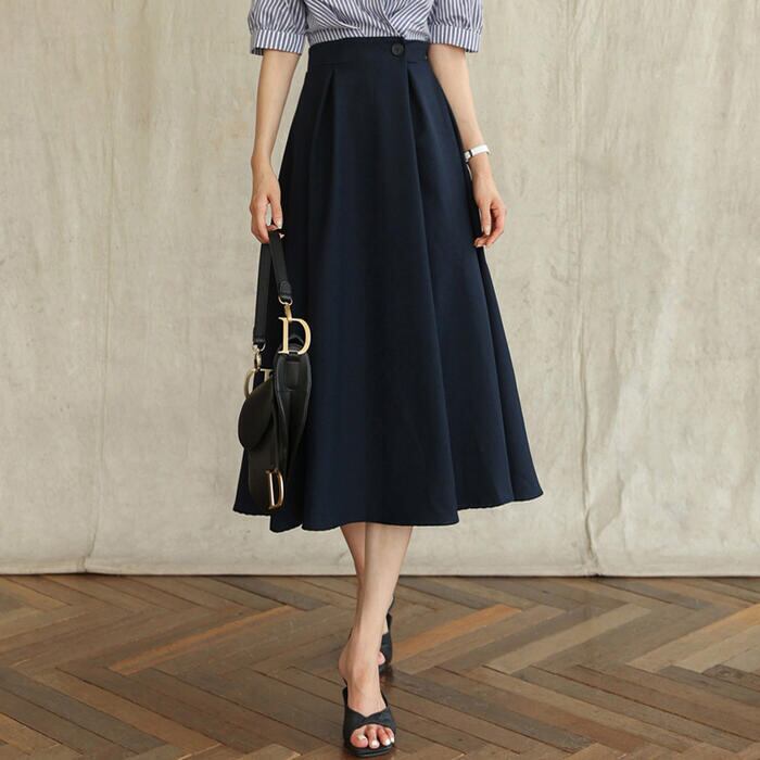 大きいサイズ 体型カバー エレガント フェミニン おしゃれ シンプル 上品 通勤 オフィス ボトムス スカート レディース きれいめ カジュアル 大人可愛い 春 夏 秋 冬 タック 無地 フレアスカート Aライン ミモレ丈 ハイウエスト ブルー ネイビー 20代 30代 40代 50代 S M L XL 2XL