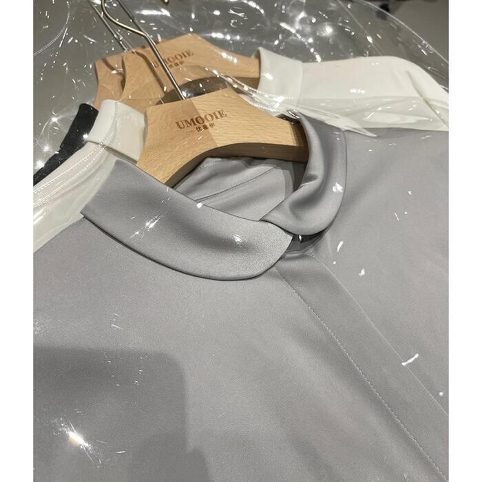 比翼仕立てでフロントをスッキリとミニマルに仕上げ、素材の良さと襟の形を美しく際立たせています。