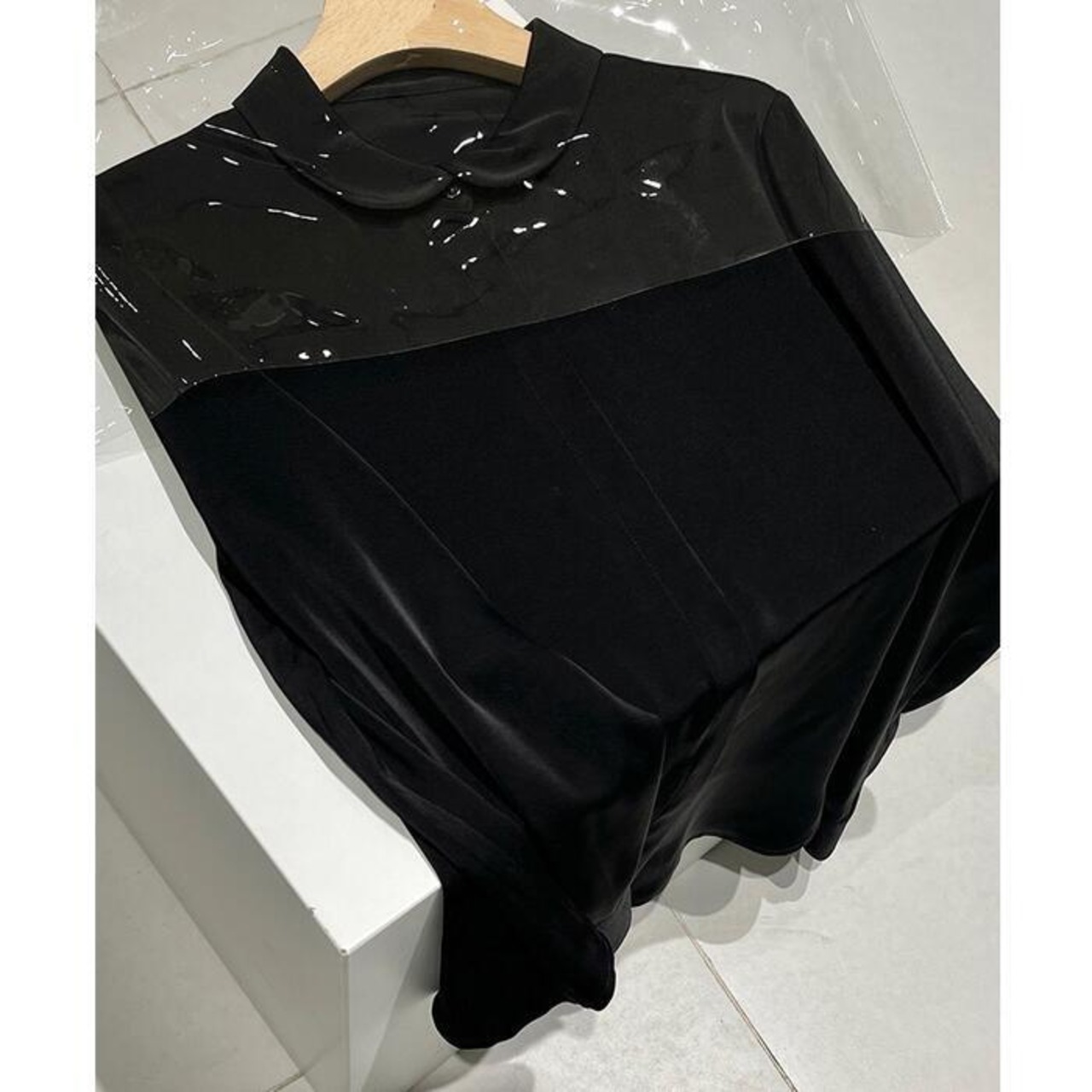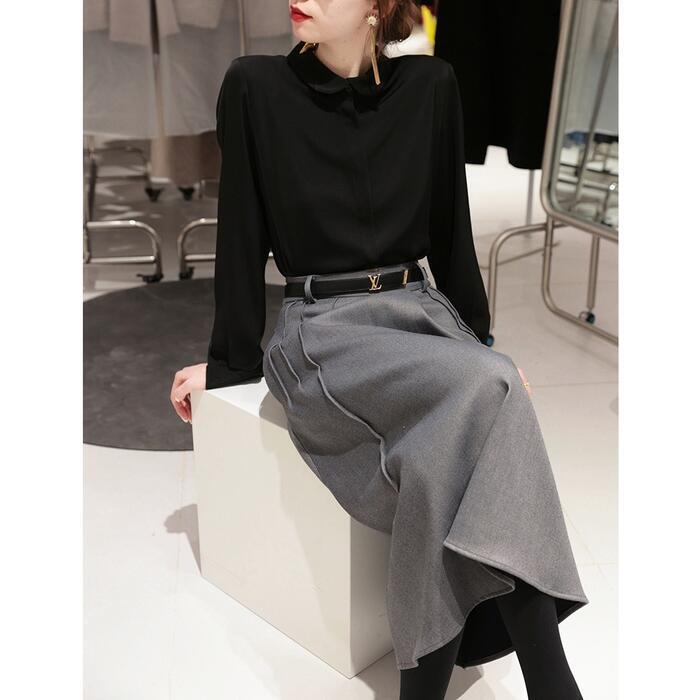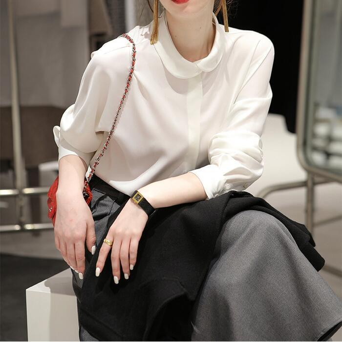 全3色 大きいサイズ 体型カバー エレガント フェミニン おしゃれ シンプル 透け感 トップス ブラウス シャツ レディース きれいめ カジュアル 大人可愛い 春 夏 秋 冬 とろみ 羽織り 長袖 丸襟 ラウンドカラー フライフロント ブラック 黒 ホワイト 白 グレー 20代 30代 40代 50代 XS S M L XL