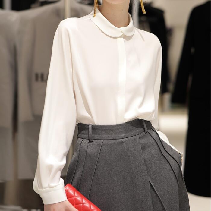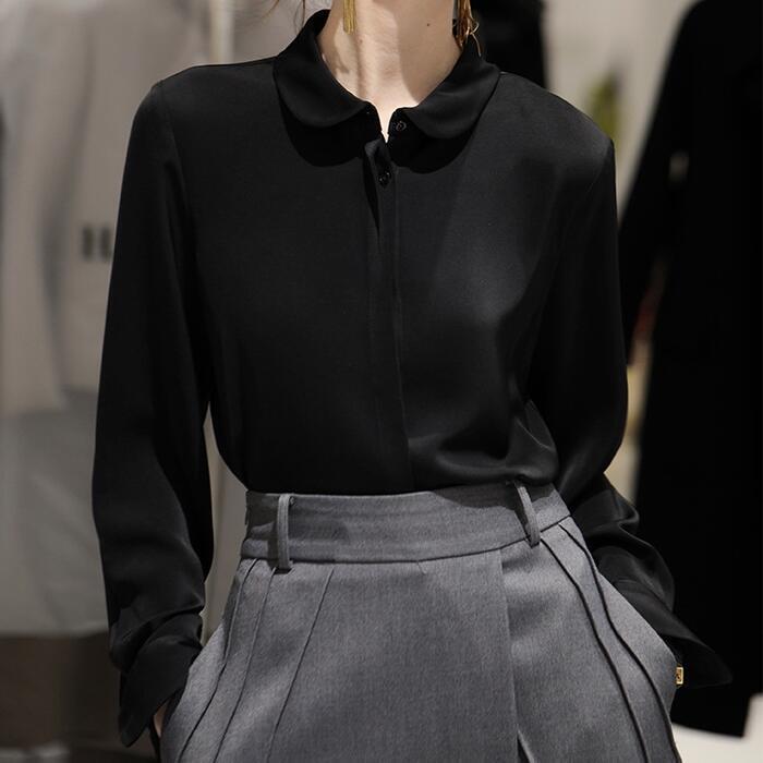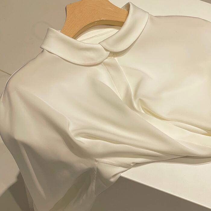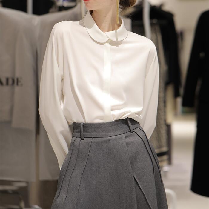 丸襟で女性らしさを添えた、クラシカルなニュアンスのとろみブラウス。