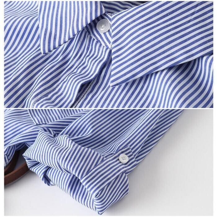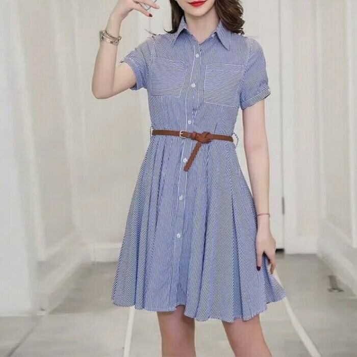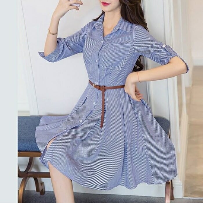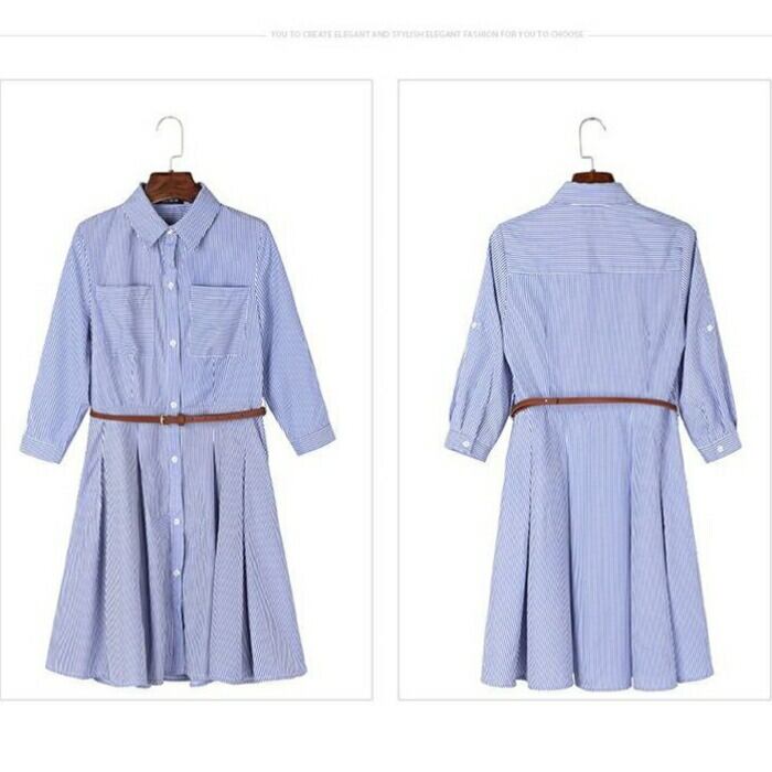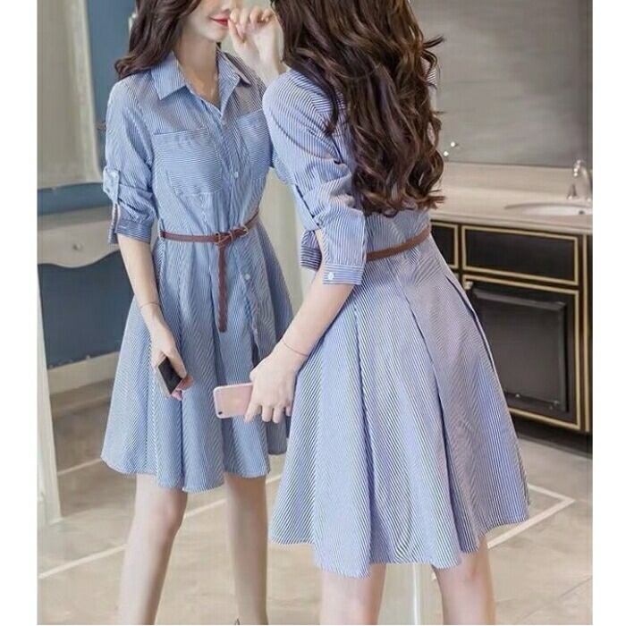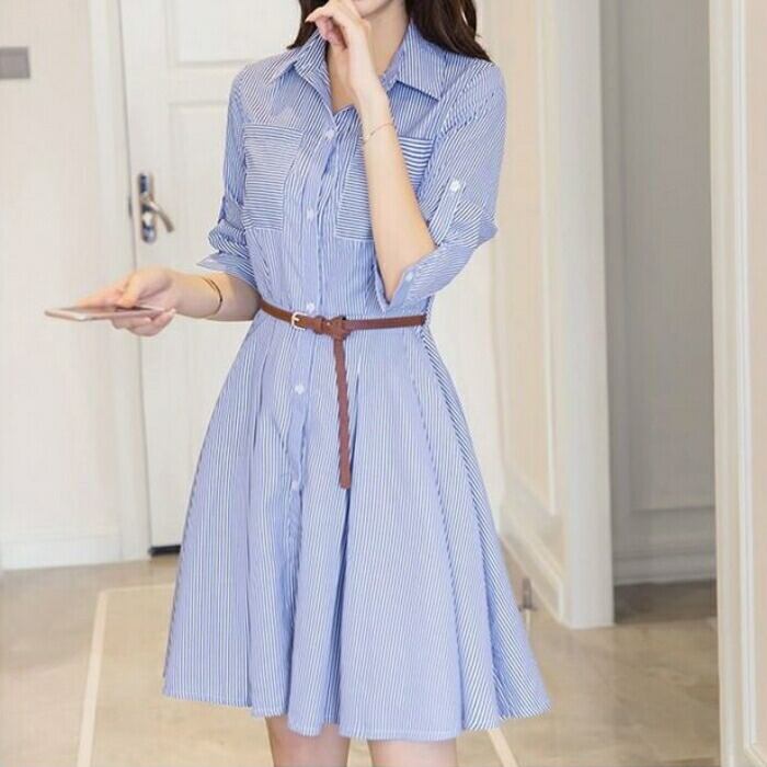 大きいサイズ 体型カバー エレガント フェミニン おしゃれ シンプル ワンピース ドレス レディース きれいめ カジュアル 大人可愛い 春 秋 夏 七分袖 ストライプ フレア シャツワンピース ひざ丈 ウエストベルト ブルー 青 20代 30代 40代 50代 S M L XL 2XL