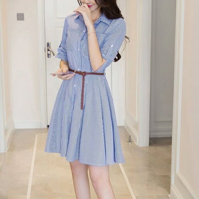 ブルーとホワイトのピンストライプが、洗練された大人の可愛らしさを引き立てるシャツワンピース。