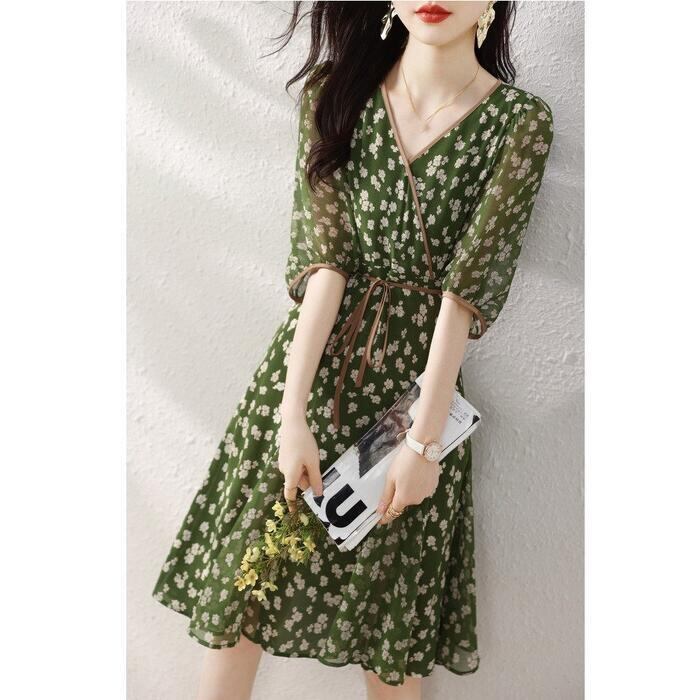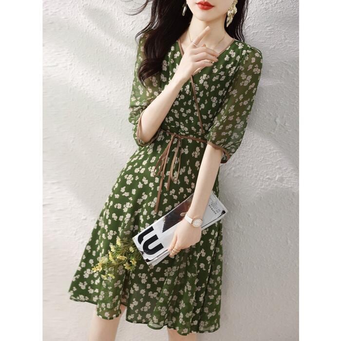 全2色 大きいサイズ 体型カバー エレガント フェミニン おしゃれ ワンピース ドレス レディース きれいめ カジュアル 大人可愛い 春 秋 夏 五分袖 花柄 フラワー カシュクール ひざ丈 ショート丈 透け感 Aライン ブラック 黒 グリーン 緑 20代 30代 40代 50代 S M L XL