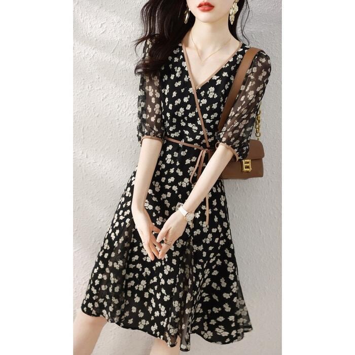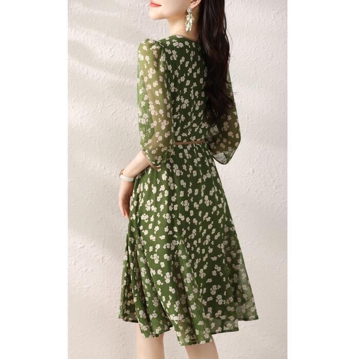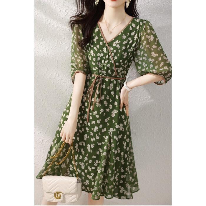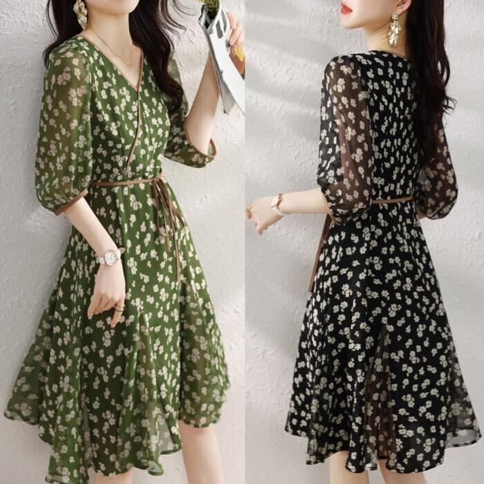 繊細な小花柄を全面にあしらった、上品可愛いシフォンワンピース。