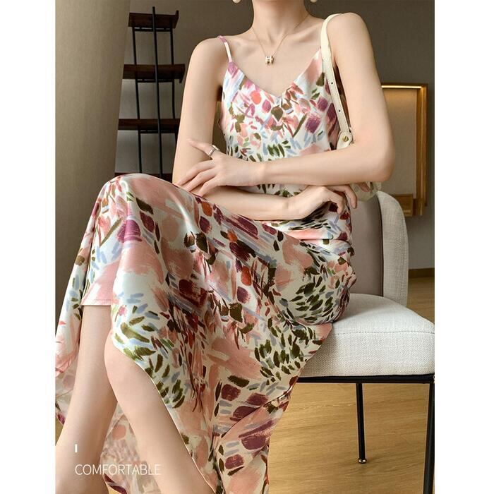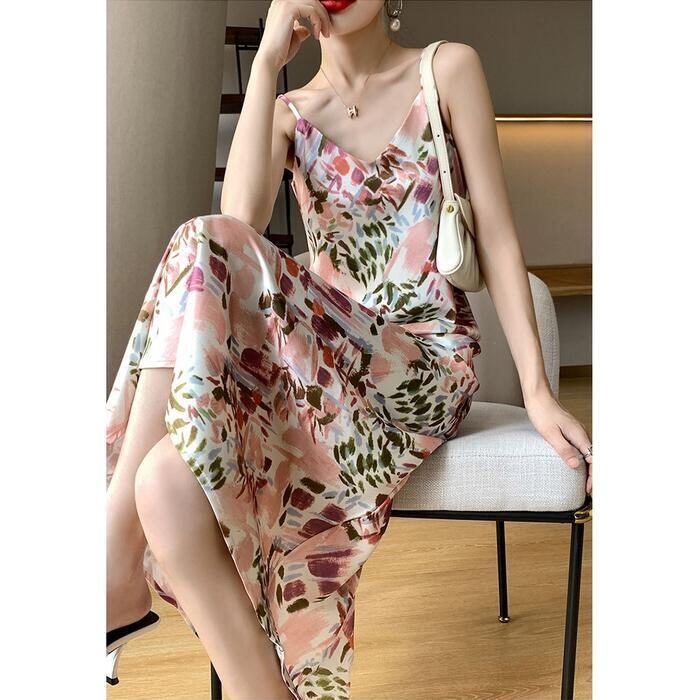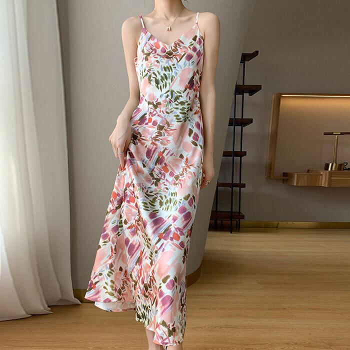 大きいサイズ 体型カバー エレガント フェミニン おしゃれ ワンピース ドレス レディース きれいめ カジュアル 大人可愛い 春 秋 夏 キャミワンピース 花柄 フラワー 水彩 ミモレ丈 Aライン ピンク マルチカラー 20代 30代 40代 50代 S M L XL 2XL 3XL