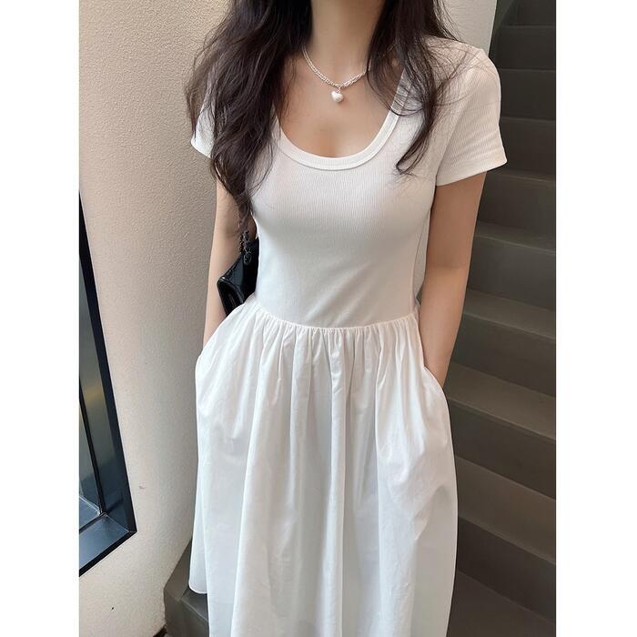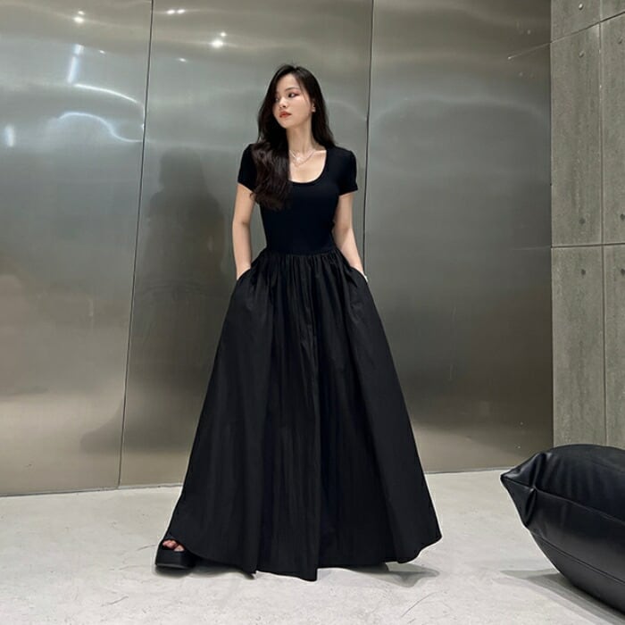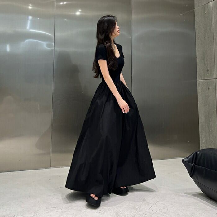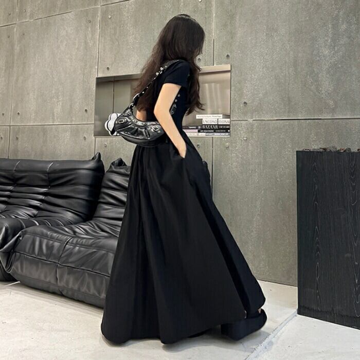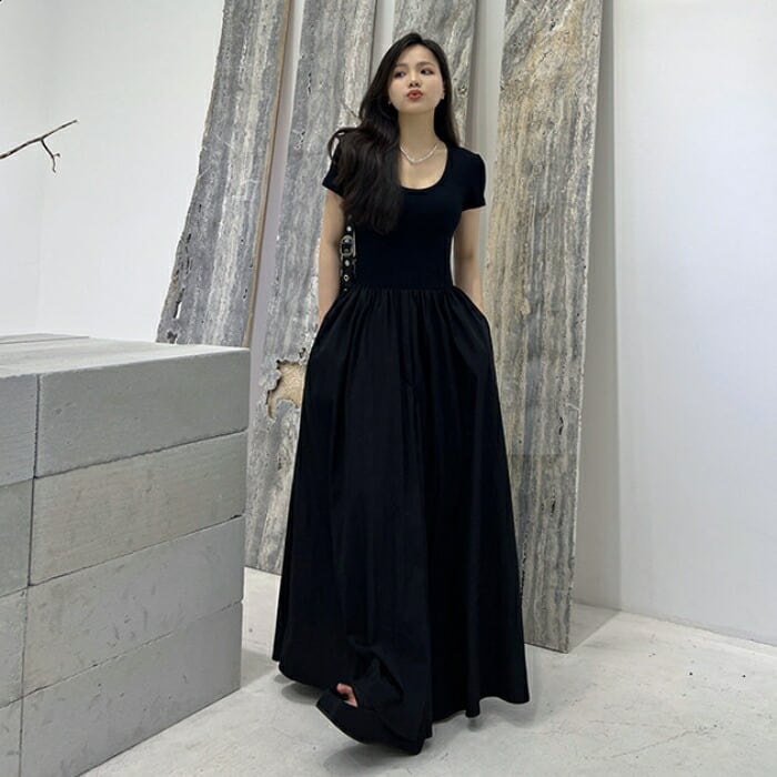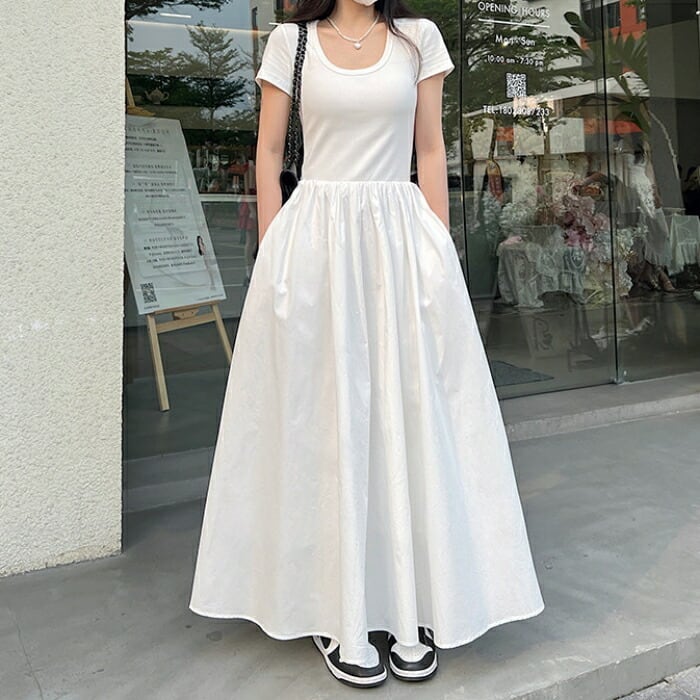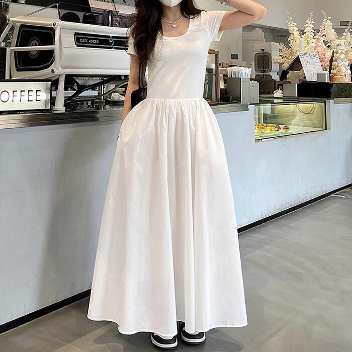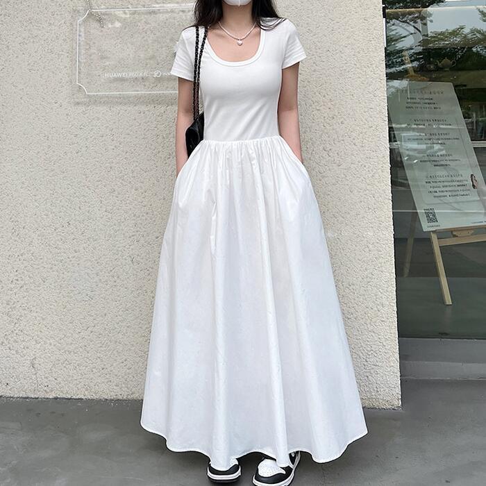 全2種2色 大きいサイズ 体型カバー エレガント フェミニン おしゃれ シンプル ワンピース ドレス レディース きれいめ カジュアル 大人可愛い 春 夏 秋 半袖 異素材ミックス フレアスカート ロング丈 マキシ丈 ハイウエスト ホワイト 白 ブラック 黒 20代 30代 40代 50代 S M L XL