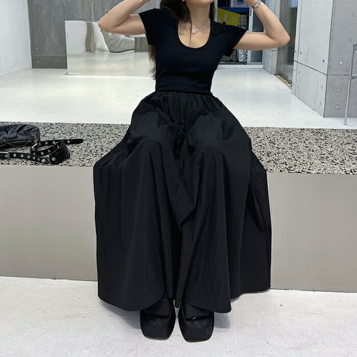 リブニットとボリュームスカートを組み合わせた、一枚でサマになるドッキングワンピース。