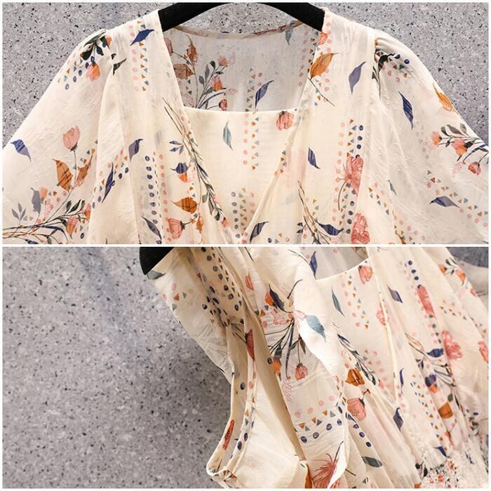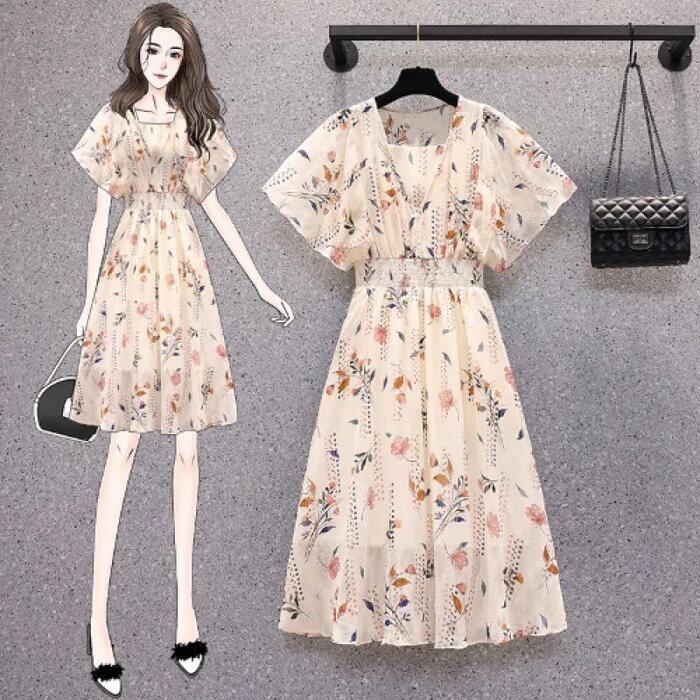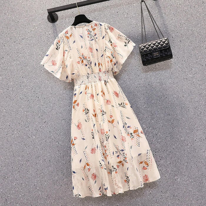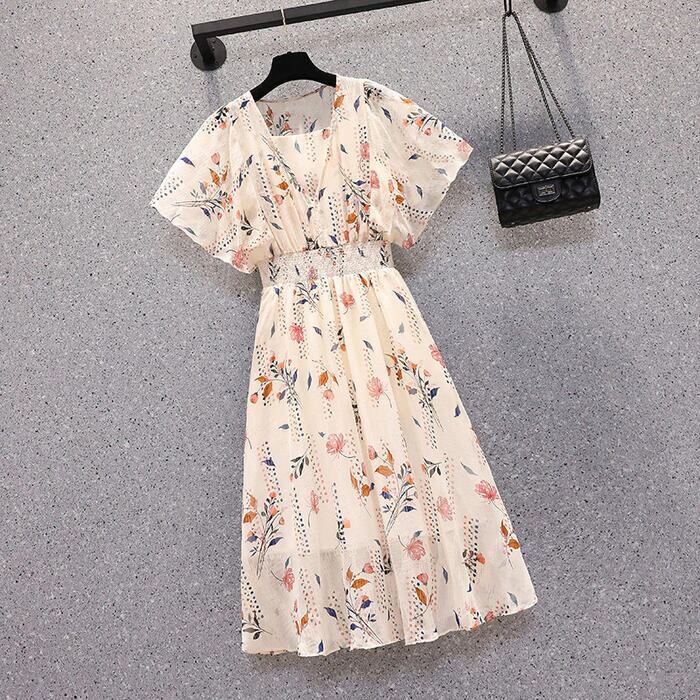 大きいサイズ 体型カバー エレガント フェミニン おしゃれ ハイウエスト ワンピース ドレス レディース きれいめ カジュアル 大人可愛い 春 夏 秋 半袖 花柄 フラワー ボタニカル Aライン ひざ丈 ショート丈 シャーリング シフォン ベージュ 20代 30代 40代 50代 M L XL 2XL 3XL 4XL