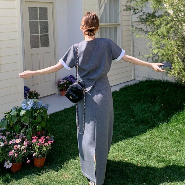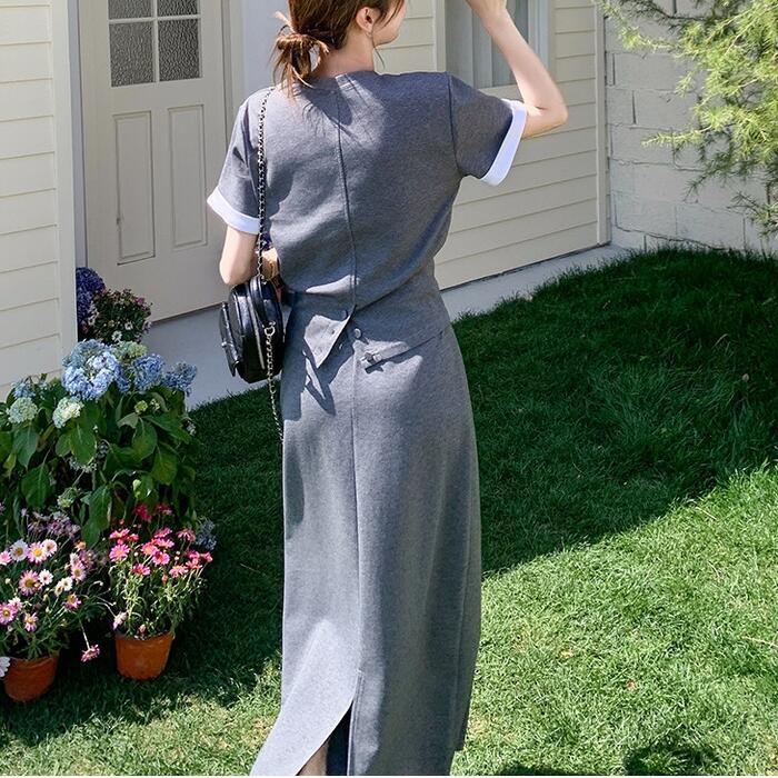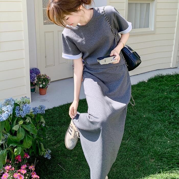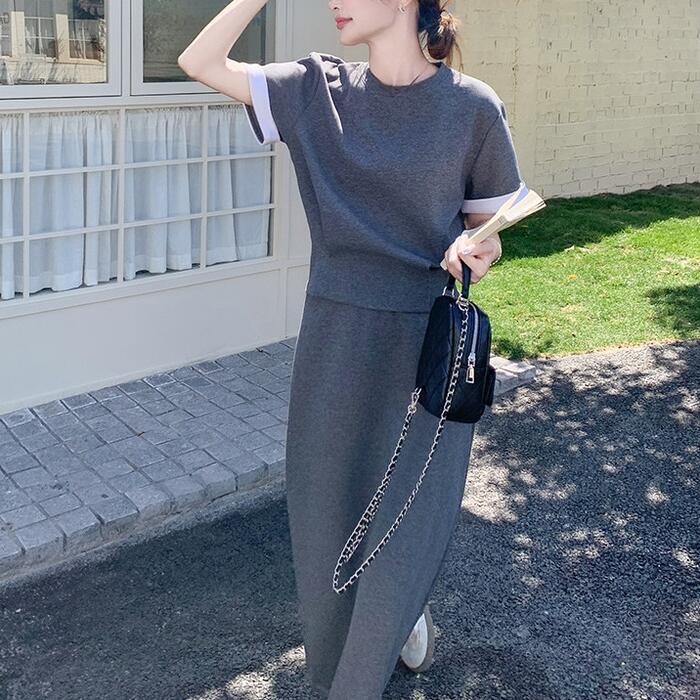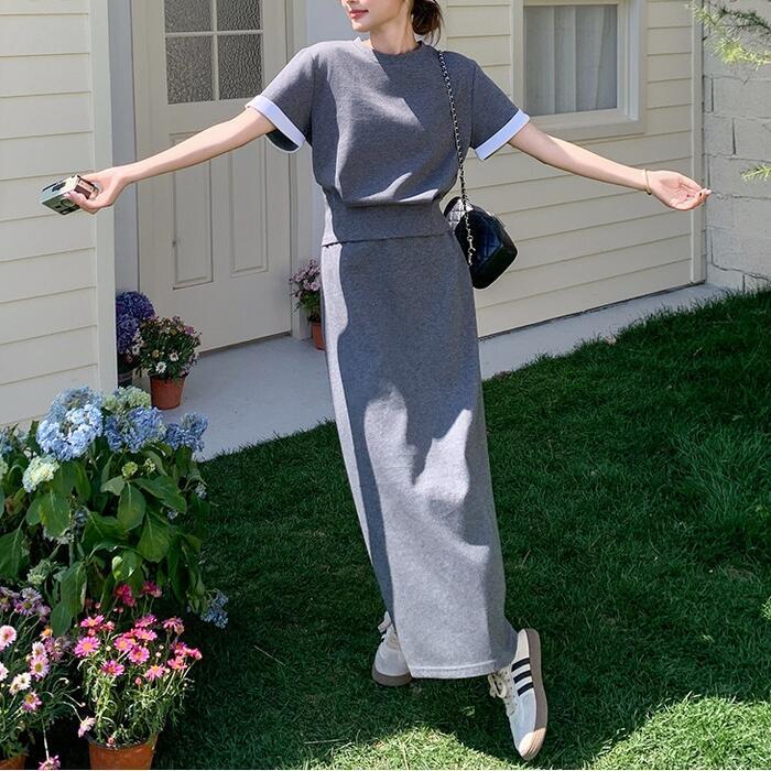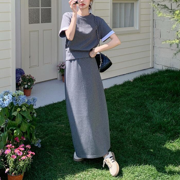 大きいサイズ 体型カバー エレガント フェミニン おしゃれ 2点セット セットアップ トップス スカート レディース きれいめ カジュアル 大人可愛い 春 秋 夏 半袖 Tシャツ 配色 バイカラー タイトスカート スリム ロング丈 ショート丈 グレー 20代 30代 40代 50代 S M L XL