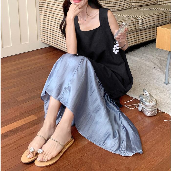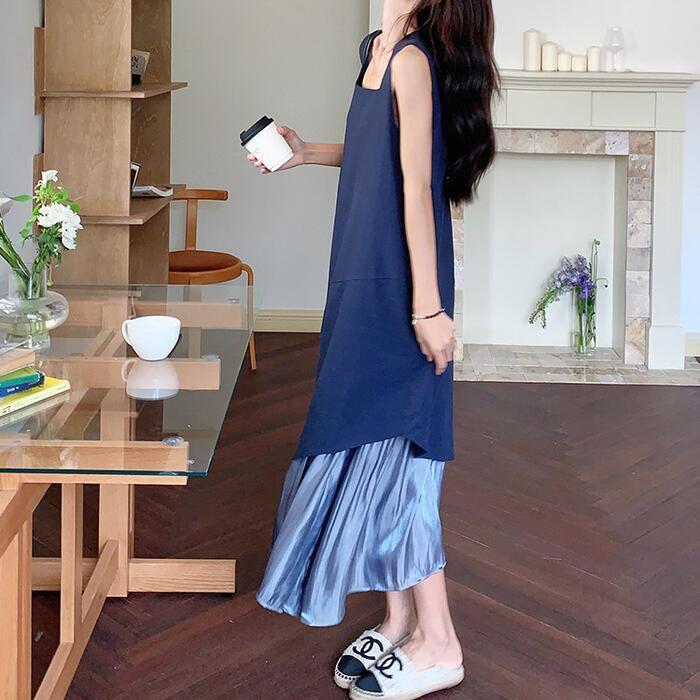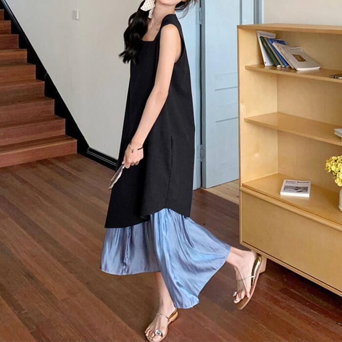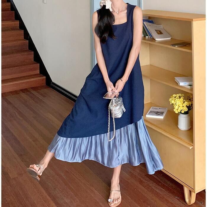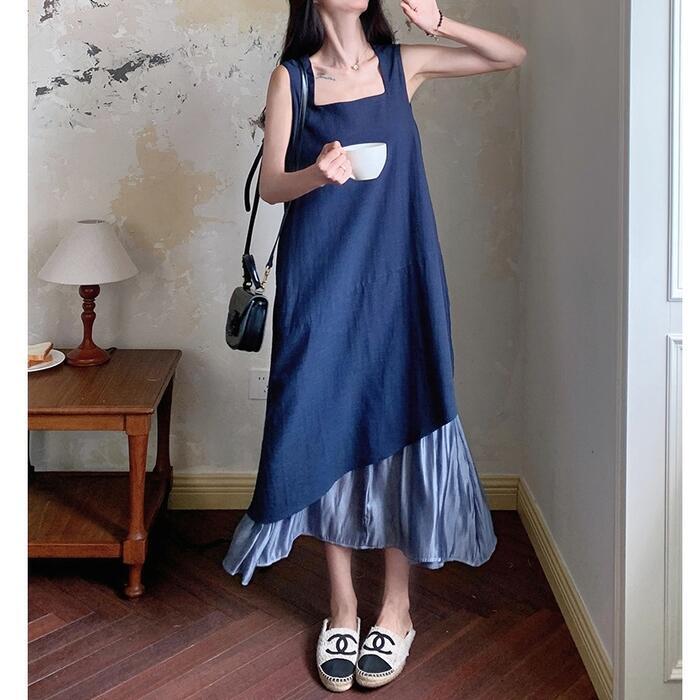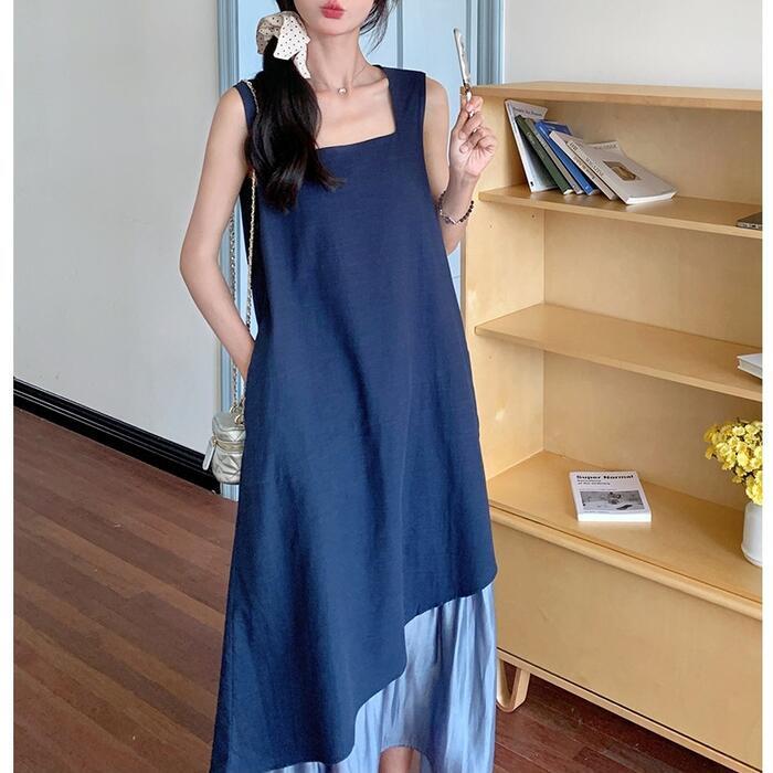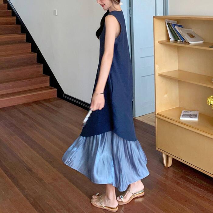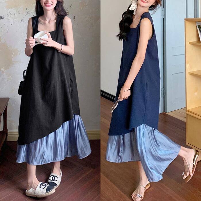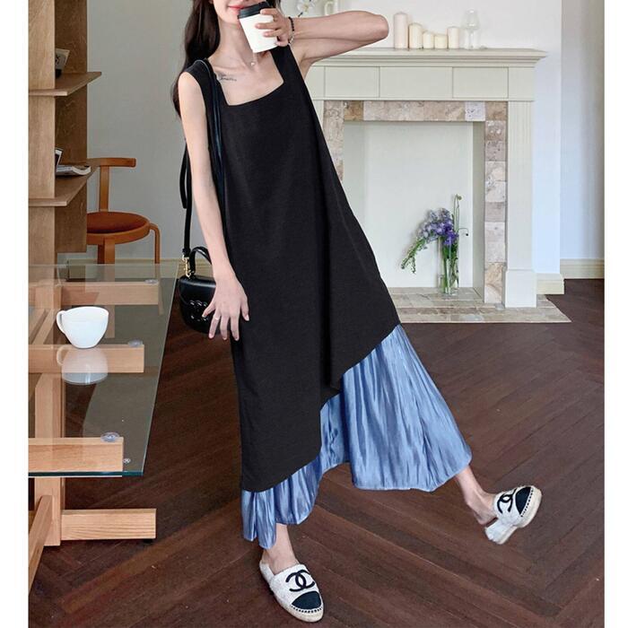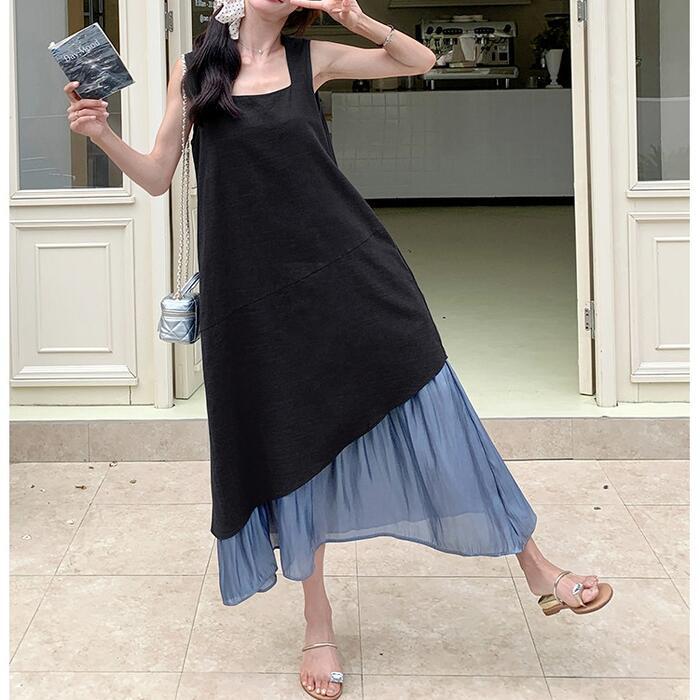 全2色 大きいサイズ 体型カバー エレガント フェミニン おしゃれ シンプル ワンピース ドレス レディース きれいめ カジュアル 大人可愛い 春 秋 夏 ノースリーブ アシンメトリー 異素材ミックス ロング丈 Aライン フレア 無地 バイカラー 配色 ブラック 黒 ブルー 青 20代 30代 40代 50代 S M L XL