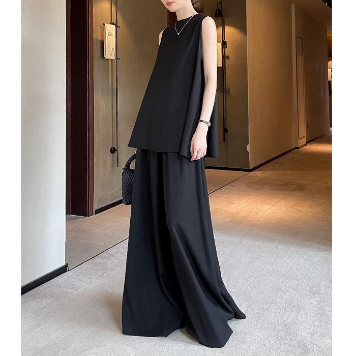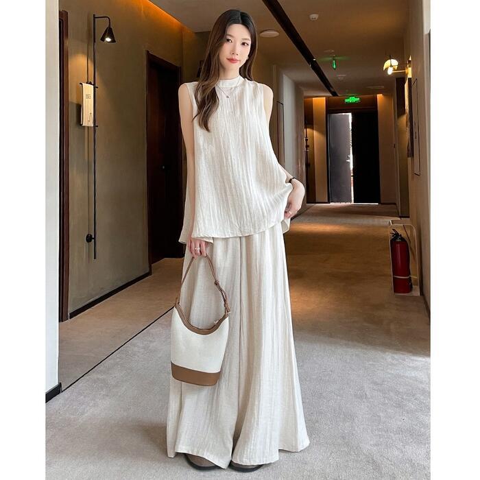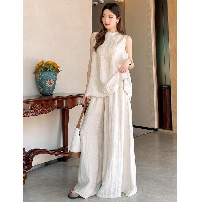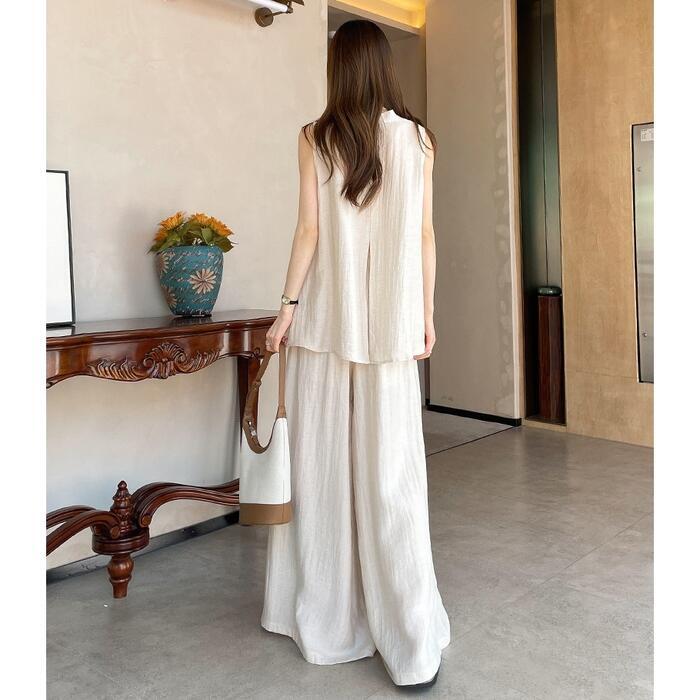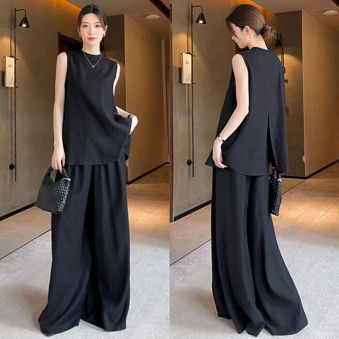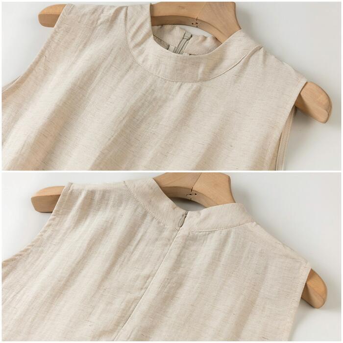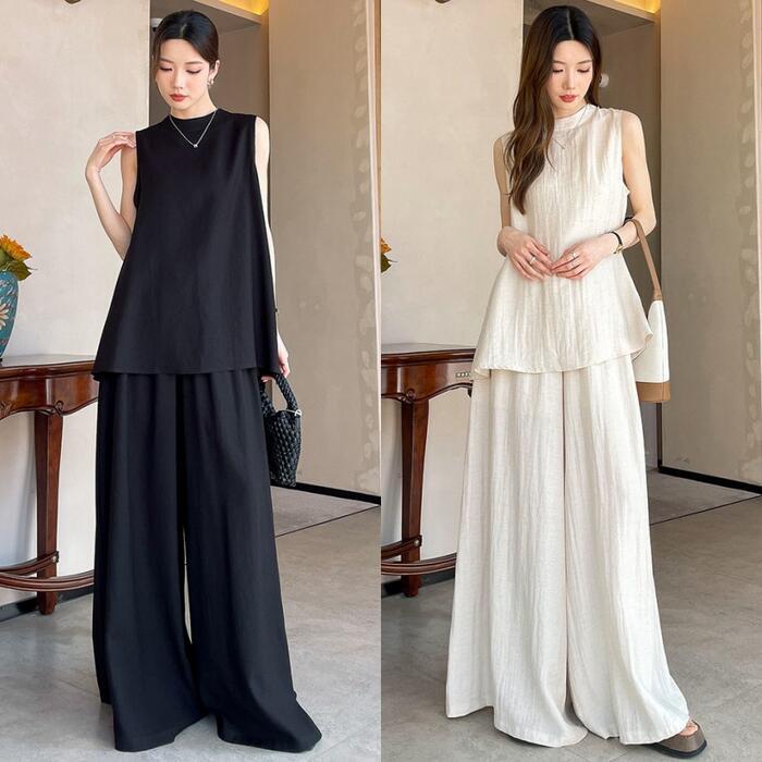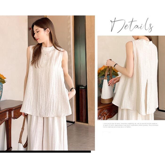 全2色 大きいサイズ 体型カバー エレガント フェミニン おしゃれ 2点セット セットアップ ブラウス パンツ 春 夏 秋 レディース きれいめ カジュアル 大人可愛い スタンドカラー リネン混 麻 スリット シャツ ワイドパンツ ロング丈 ノースリーブ ベージュ ブラック 黒 20代 30代 40代 50代 M L