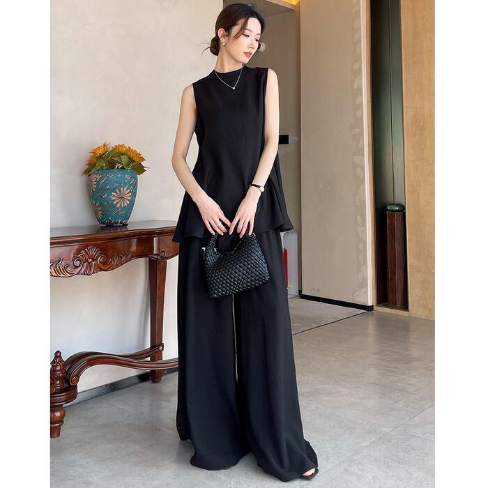 トップスはハイネック気味のノースリーブブラウスで、バックスタイルに施されたスリットが、歩くたびに軽やかな抜け感を演出します。