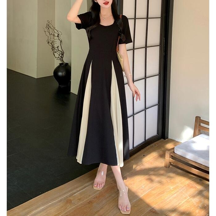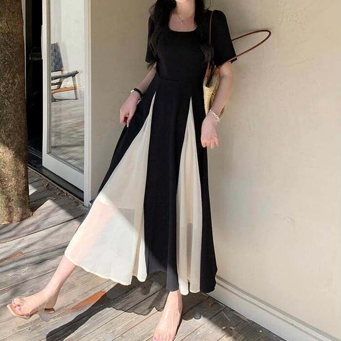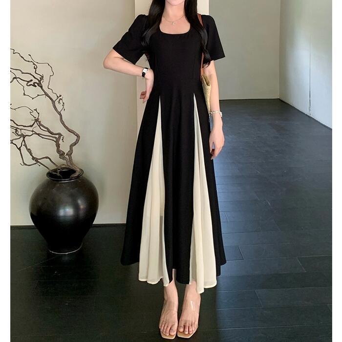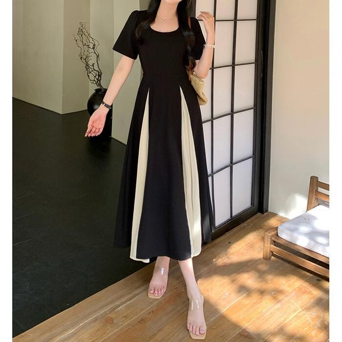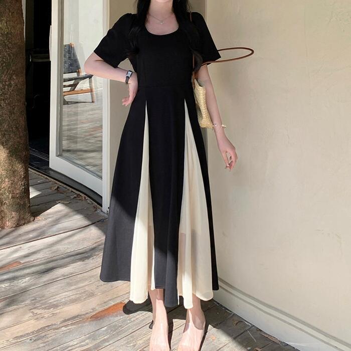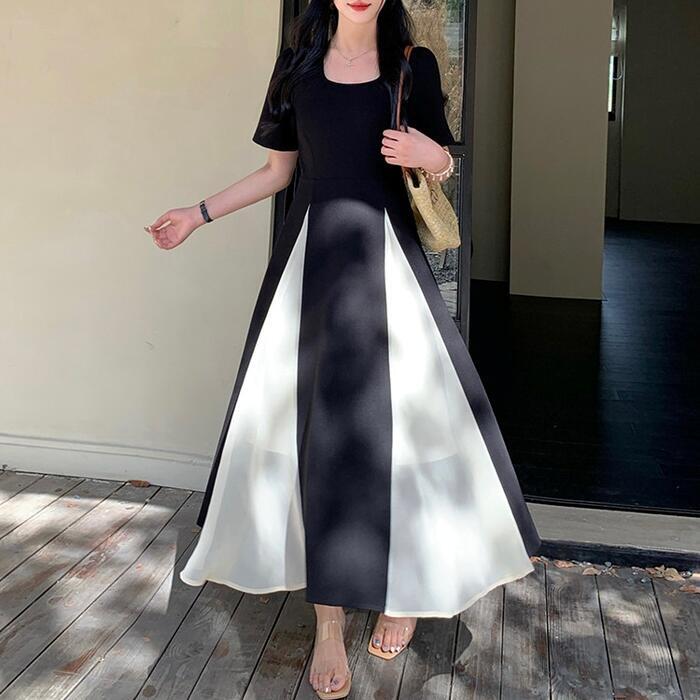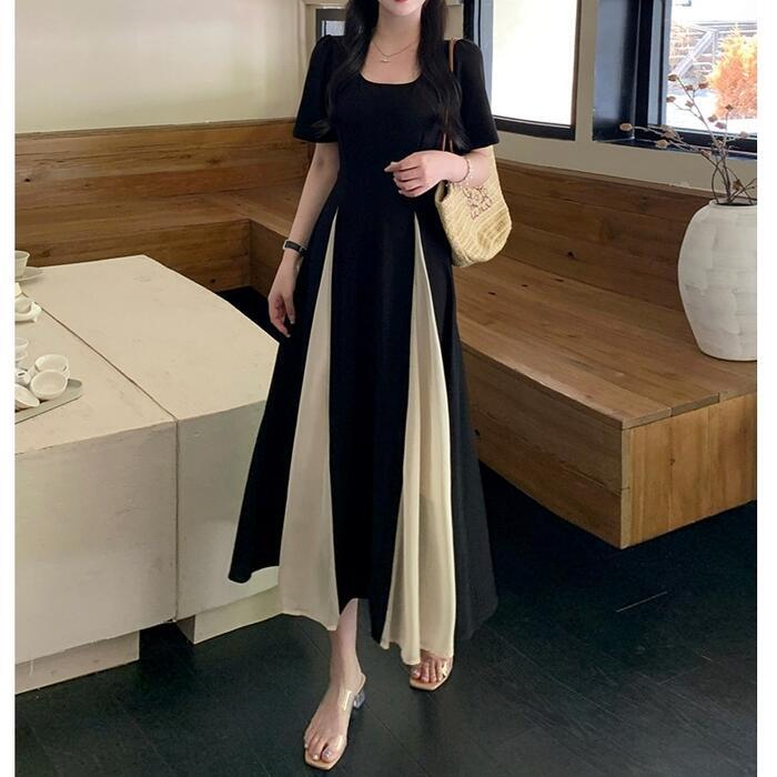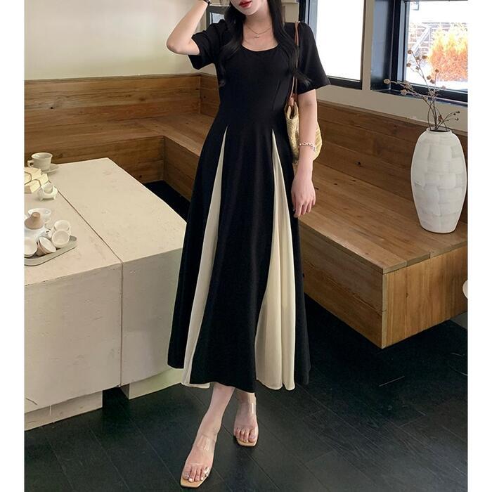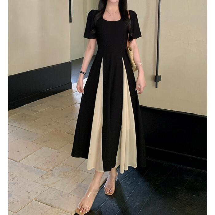 大きいサイズ 体型カバー エレガント フェミニン おしゃれ ワンピース ドレス レディース きれいめ カジュアル 大人可愛い 春 秋 夏 半袖 ミモレ丈 Aライン フレア バイカラー 切り替え 配色 スクエアネック 異素材ミックス 無地 ブラック 黒 20代 30代 40代 50代 L XL 2XL 3XL 4XL