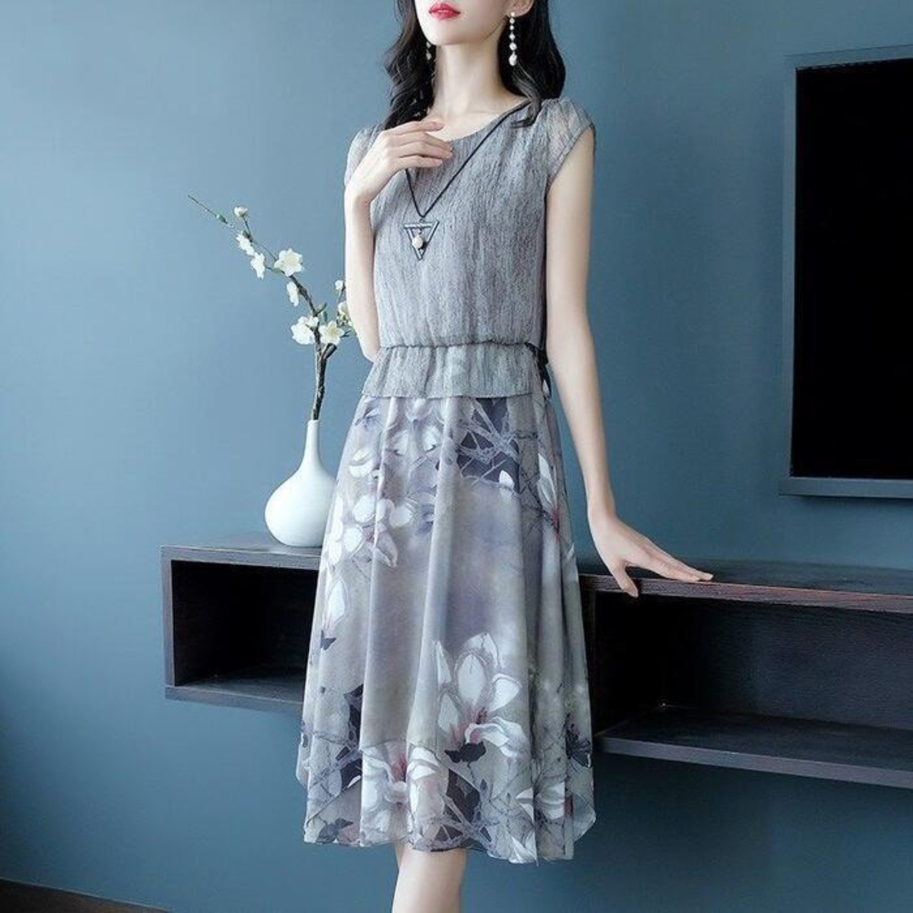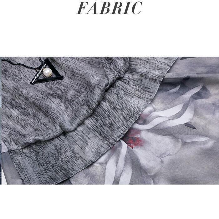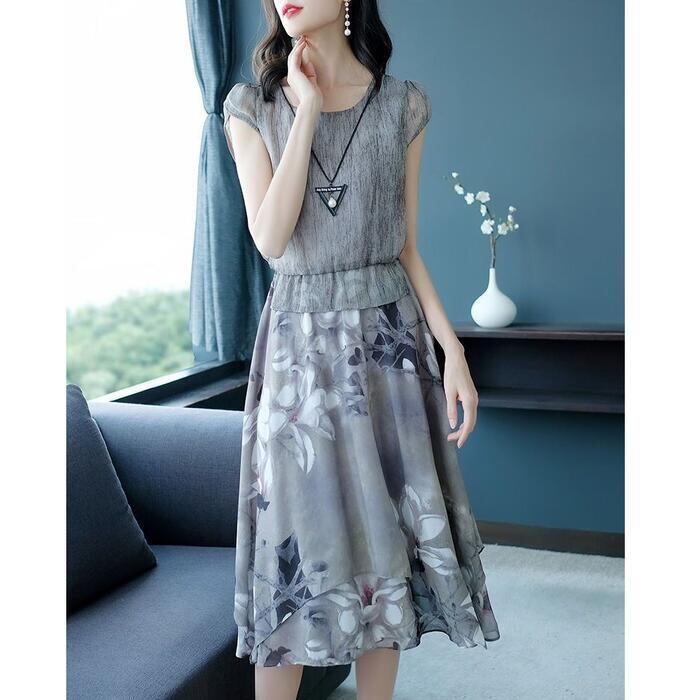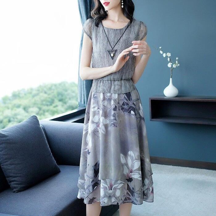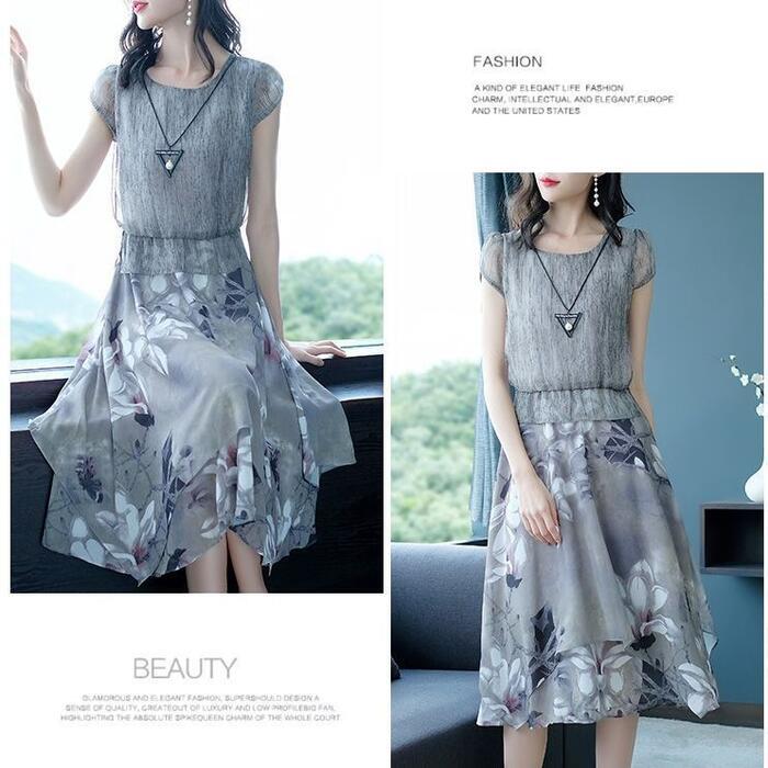 大きいサイズ 体型カバー エレガント フェミニン おしゃれ ワンピース ドレス レディース きれいめ カジュアル 大人可愛い 春 秋 夏 半袖 花柄 フラワー ドッキング セパレート風 ひざ丈 Aライン ハイウエスト グレー 20代 30代 40代 50代 S M L XL 2XL 3XL