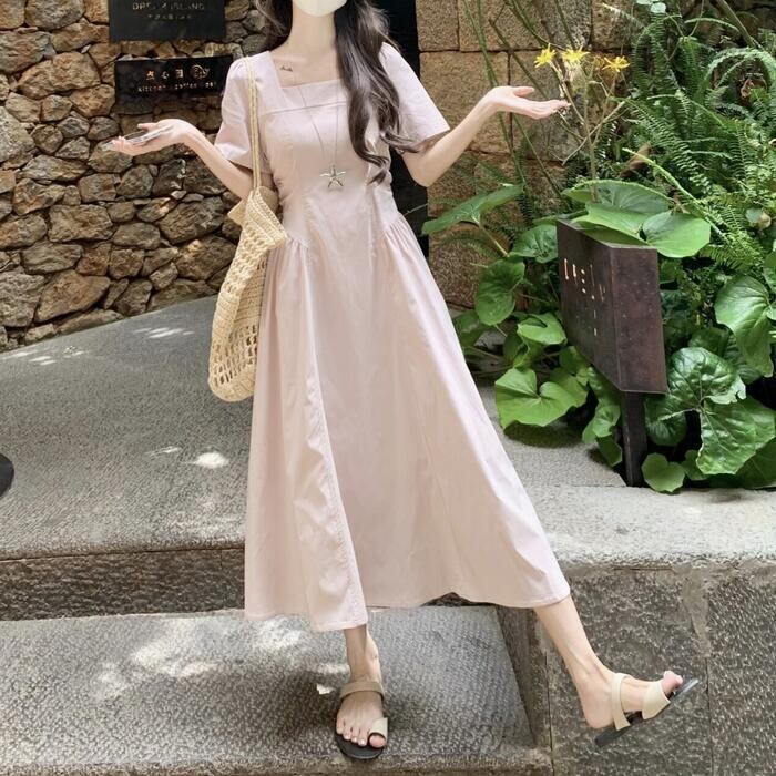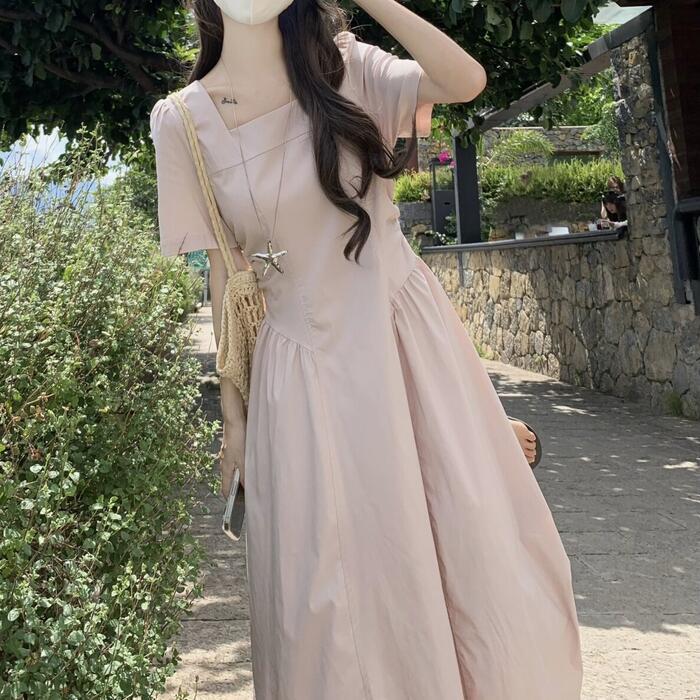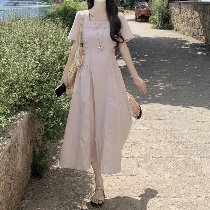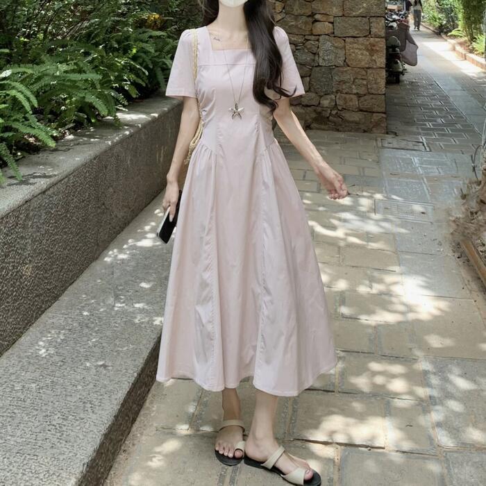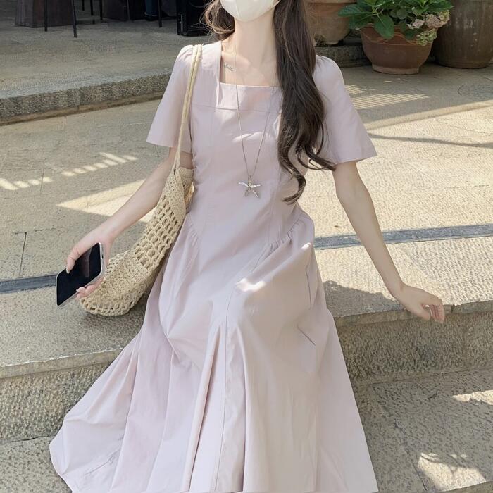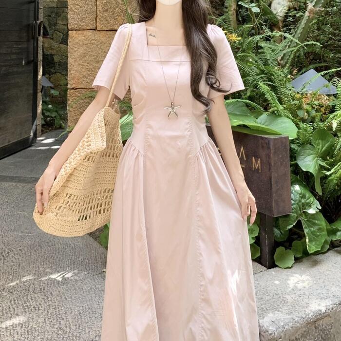 肌馴染みの良いピンクが可愛いスクエアネックワンピース。