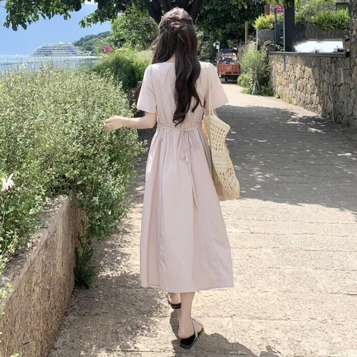 大きいサイズ 体型カバー エレガント フェミニン おしゃれ シンプル ワンピース ドレス レディース きれいめ カジュアル 大人可愛い 春 秋 夏 半袖 スクエアネック ミモレ丈 Aライン フレア 無地 ウエストリボン バックリボン ハイウエスト ピンク 20代 30代 40代 50代 S M L XL
