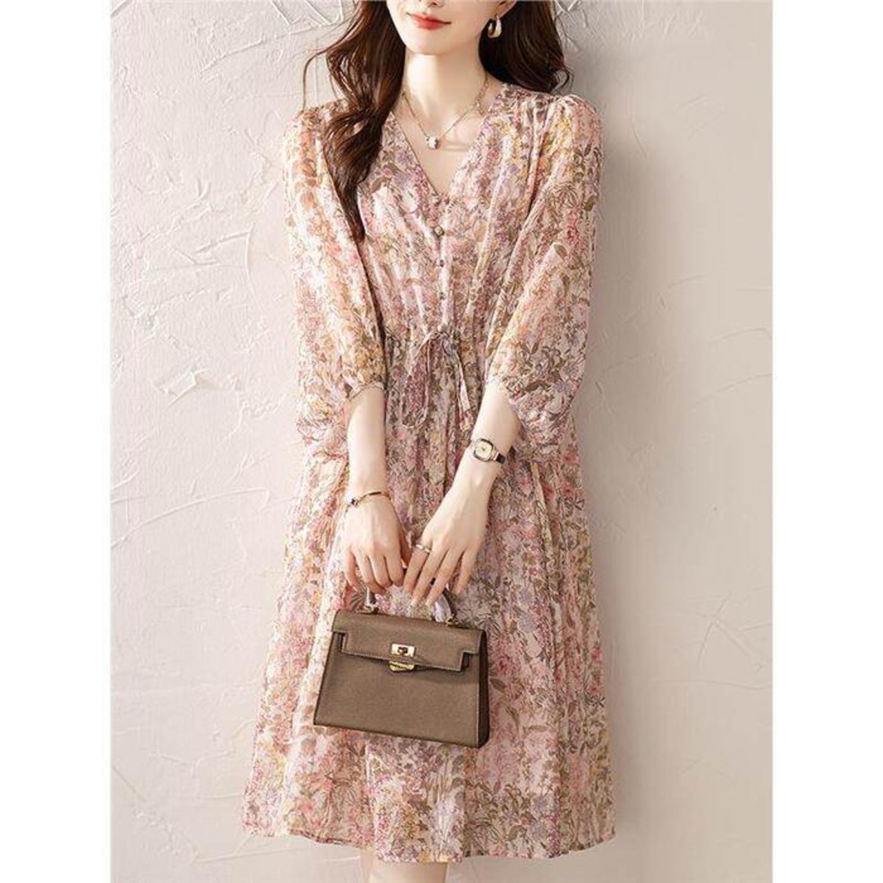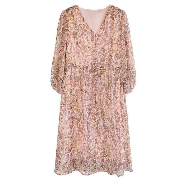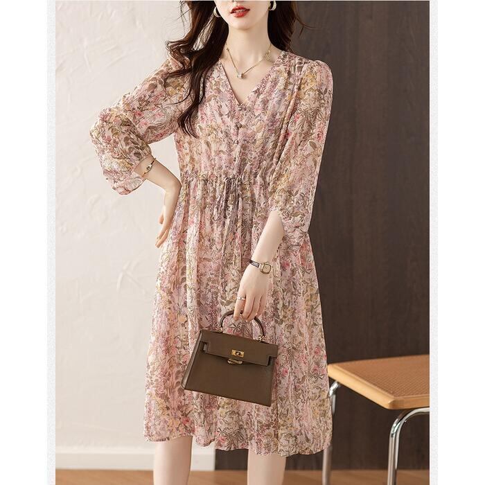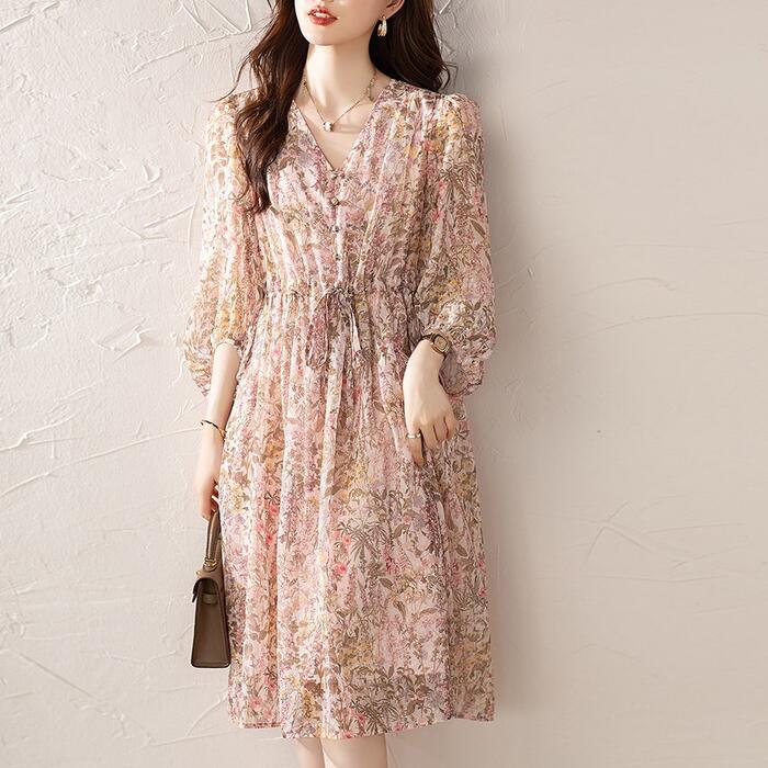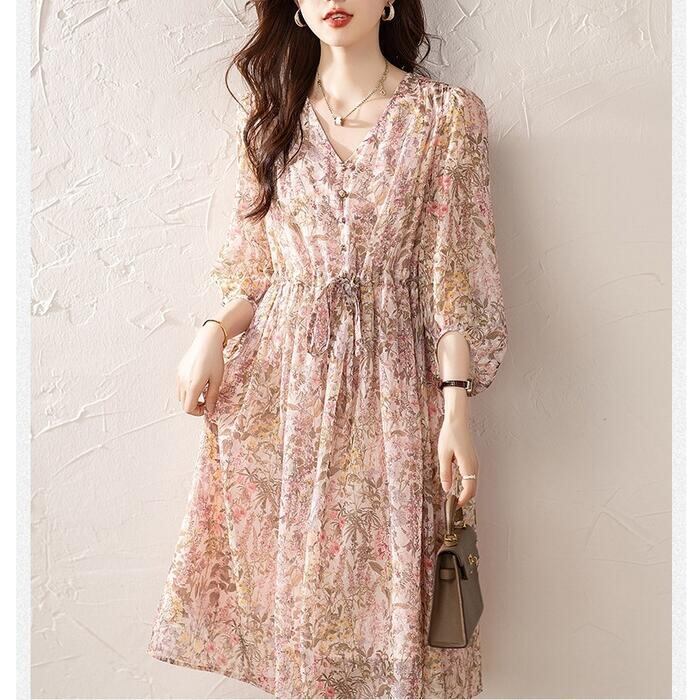 大きいサイズ 体型カバー エレガント フェミニン おしゃれ ワンピース ドレス レディース きれいめ カジュアル 大人可愛い 春 秋 夏 七分袖 花柄 フラワー ひざ丈 Aライン シフォン ドロスト Vネック パフスリーブ ピンク 20代 30代 40代 50代 S M L XL 2XL 3XL 4XL