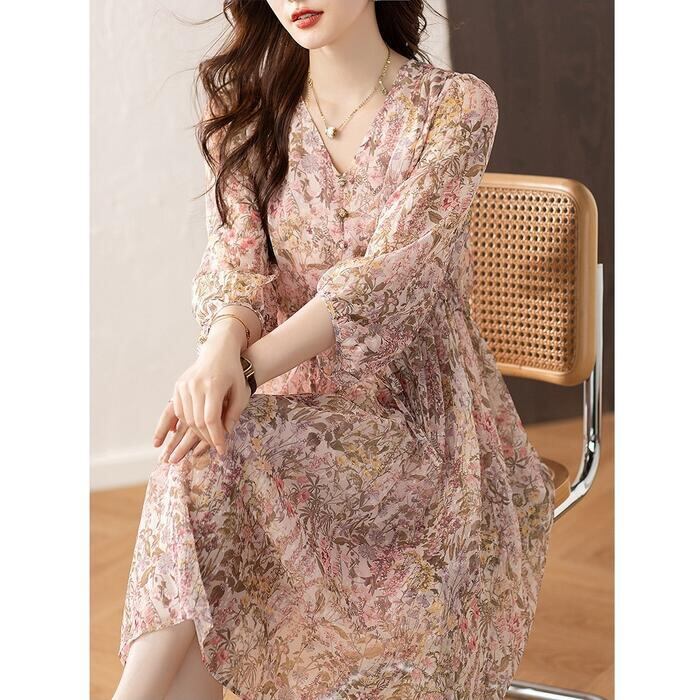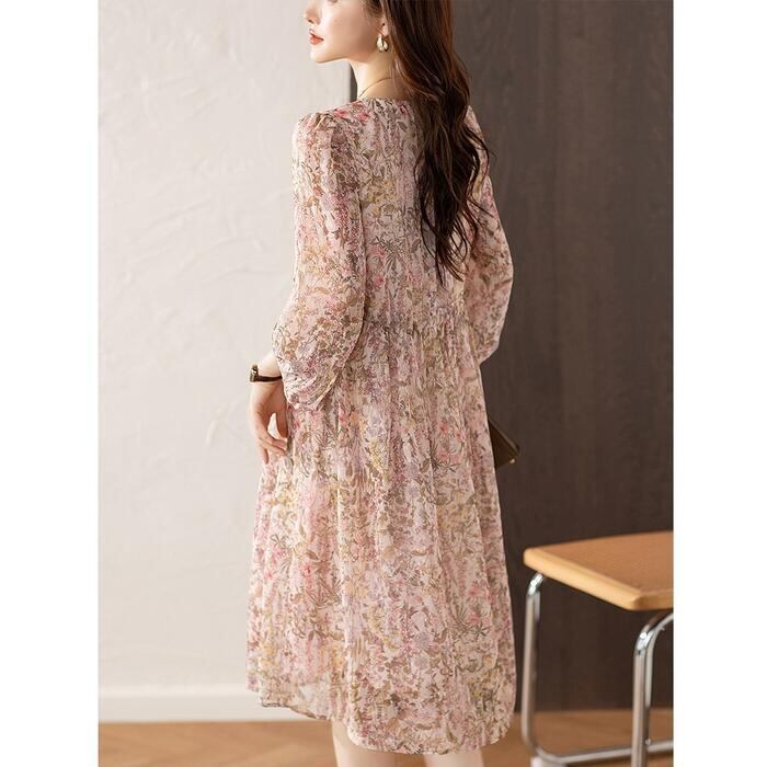 繊細なフラワープリントが全身を優しく彩る、気品あふれるシフォンワンピース。