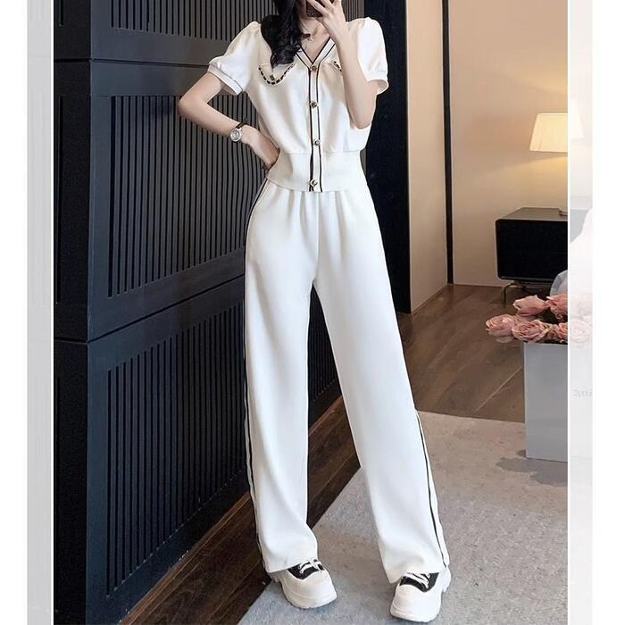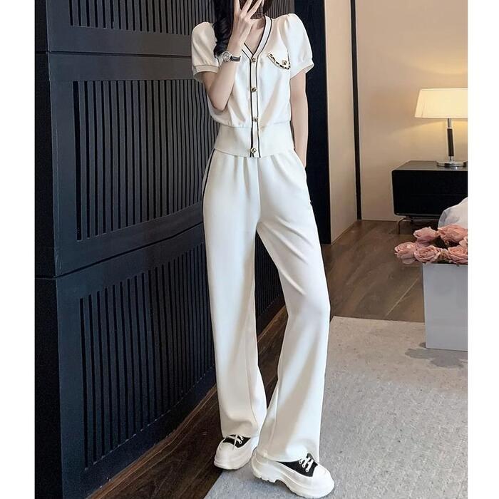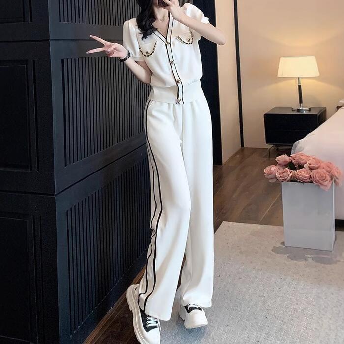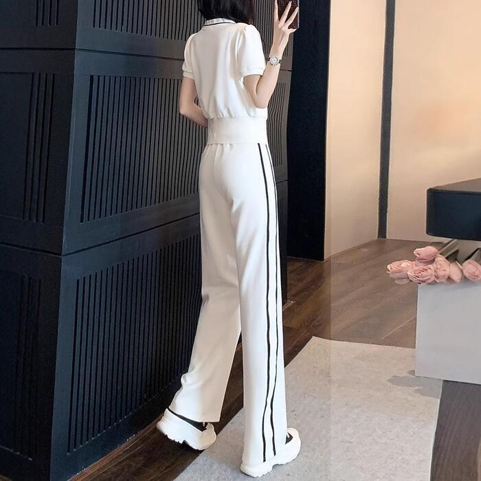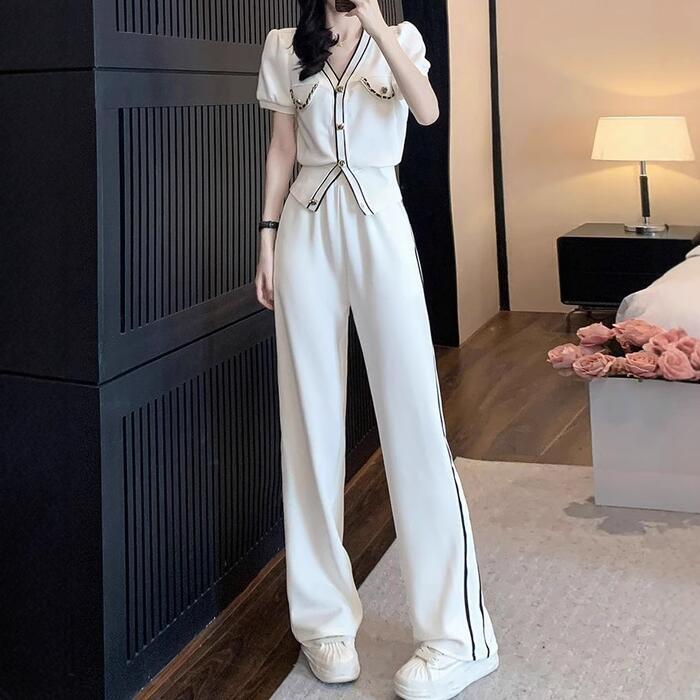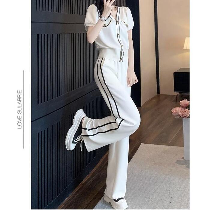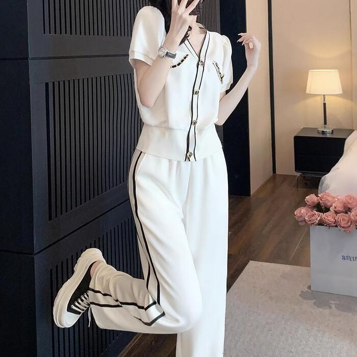 大きいサイズ 体型カバー エレガント フェミニン おしゃれ 2点セット セットアップ トップス パンツ 春 夏 秋 レディース きれいめ カジュアル 大人可愛い パフスリーブ ライン スポーティー 半袖 Vネック ロングパンツ ホワイト 白 20代 30代 40代 50代 S M L XL 2XL