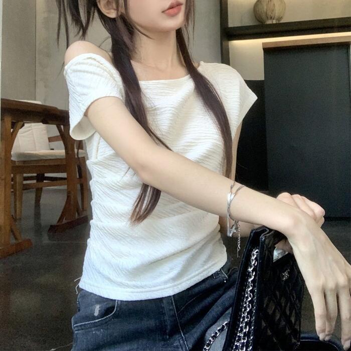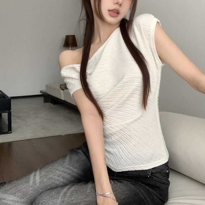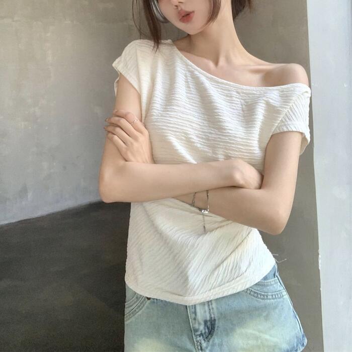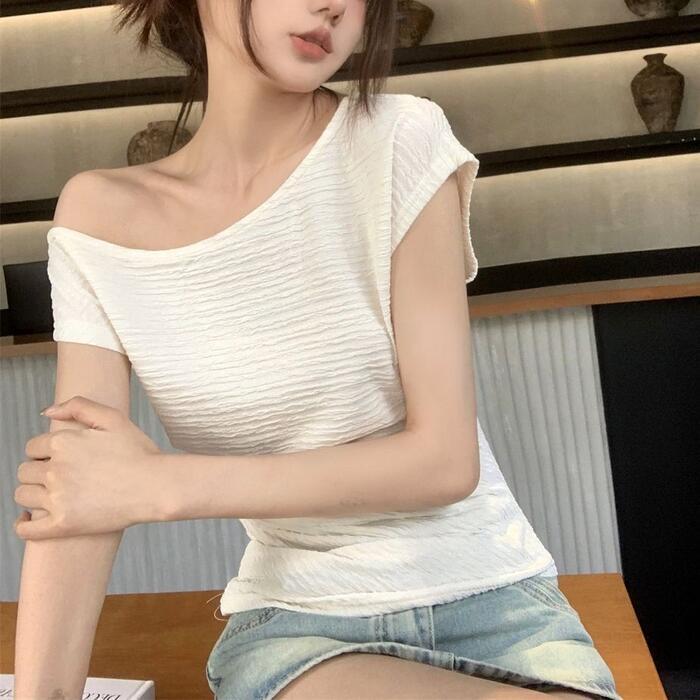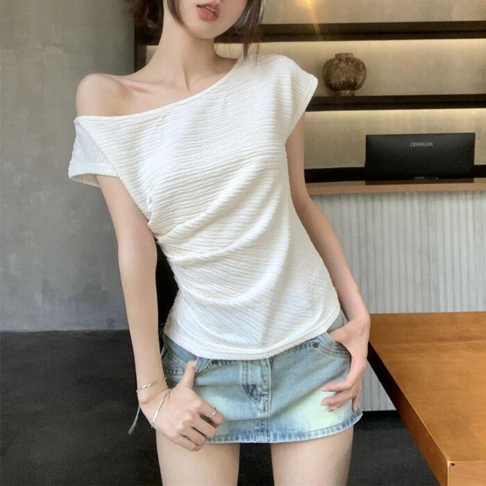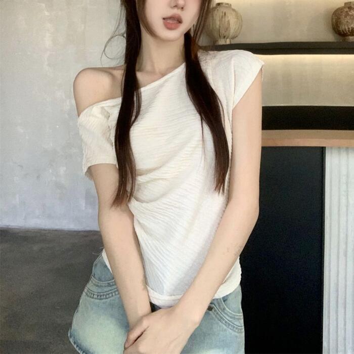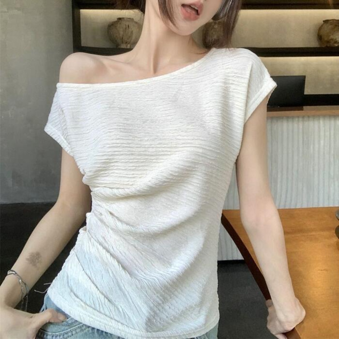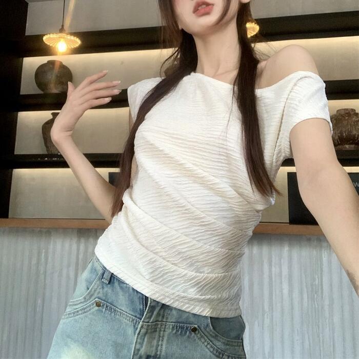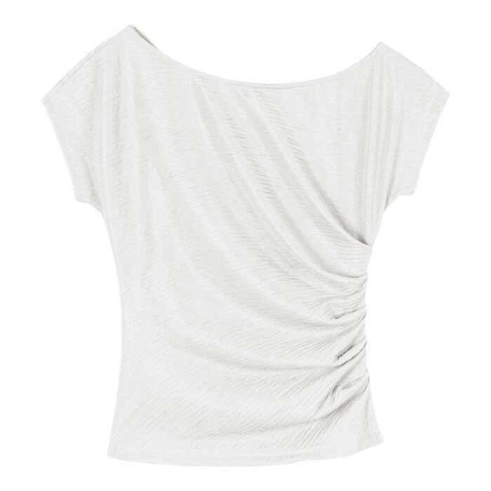 大きいサイズ 体型カバー エレガント フェミニン おしゃれ シンプル トップス カットソー Tシャツ レディース きれいめ カジュアル 大人可愛い 春 夏 秋 アシンメトリー 半袖 リンクル ワンショルダー フレンチスリーブ ホワイト 白 20代 30代 40代 50代 S M L XL
