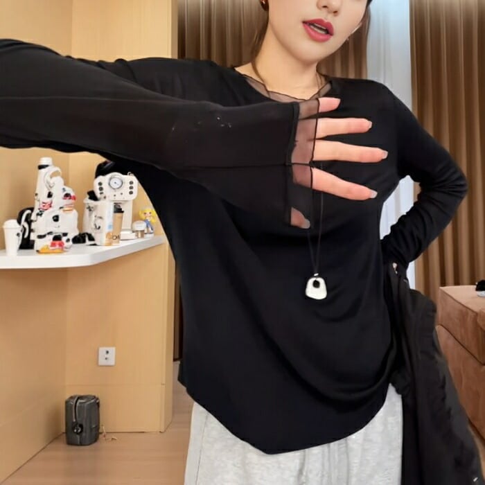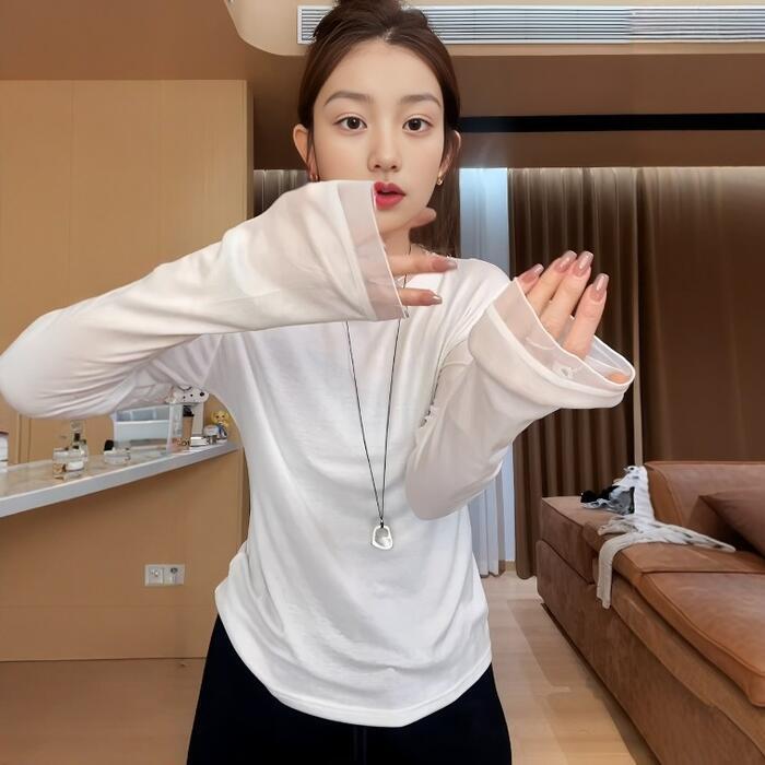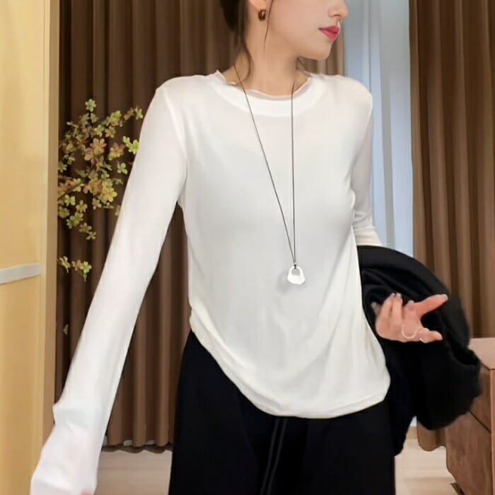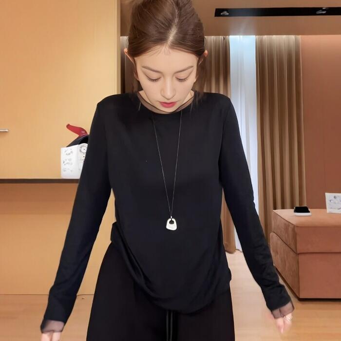 全2色 大きいサイズ 体型カバー エレガント フェミニン おしゃれ トップス Tシャツ カットソー レディース きれいめ カジュアル 大人可愛い 春 夏 秋 冬 シアー クルーネック 長袖 インナー 無地 ブラック 黒 ホワイト 白 20代 30代 40代 50代 M L XL