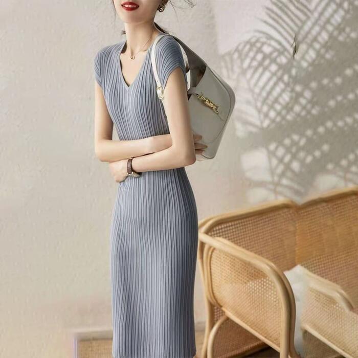 全3色 大きいサイズ 体型カバー エレガント フェミニン おしゃれ シンプル ワンピース ドレス レディース きれいめ カジュアル 大人可愛い 春 秋 夏 半袖 ニット リブ Vネック ひざ丈 タイト スリム フレンチスリーブ 無地 グレー ブラック 黒 ベージュ 20代 30代 40代 50代 M L XL 2XL 3XL