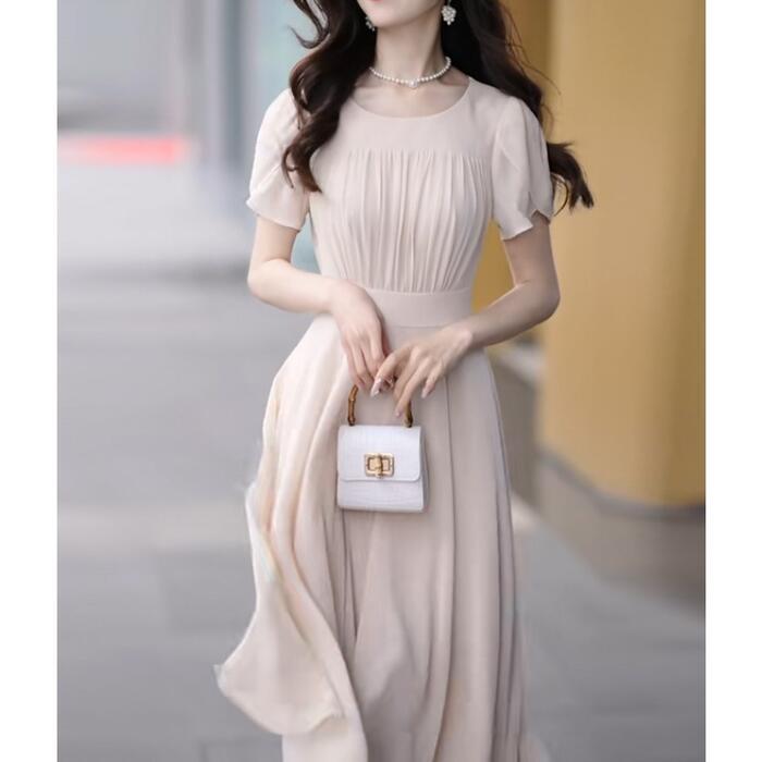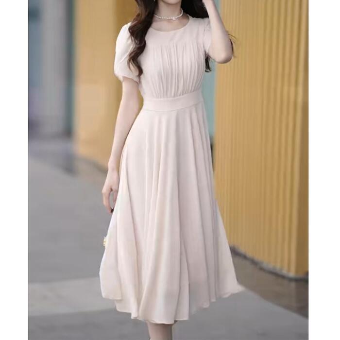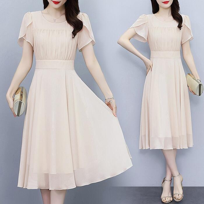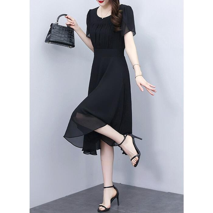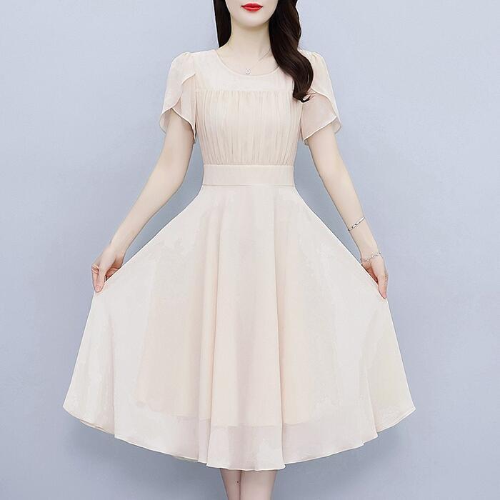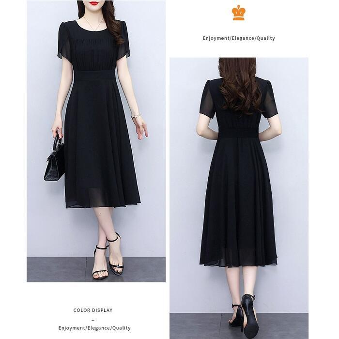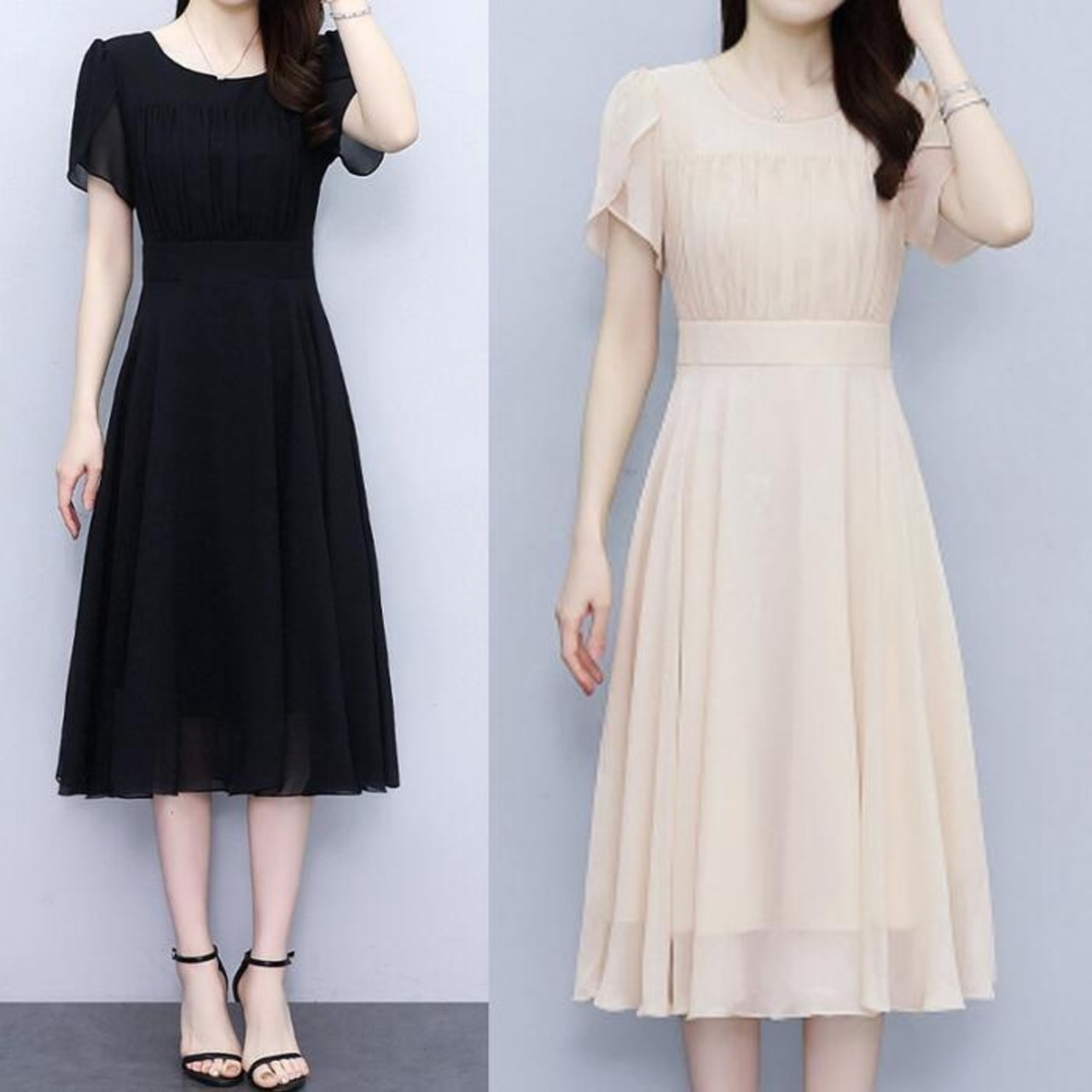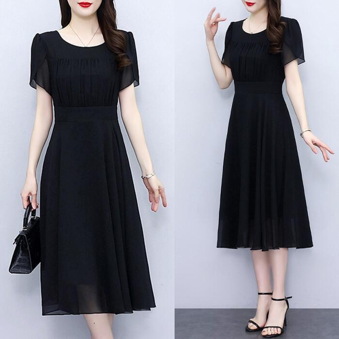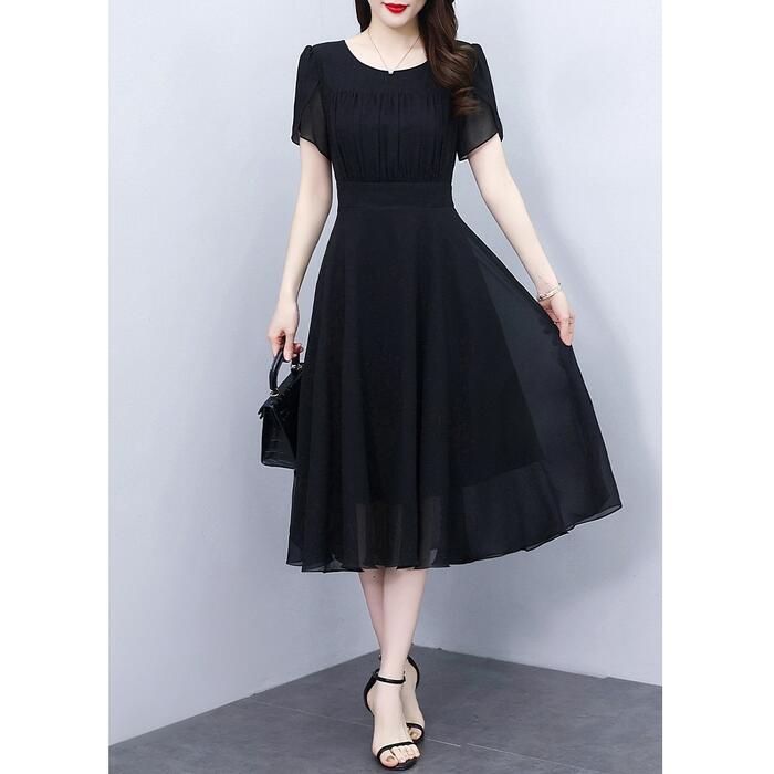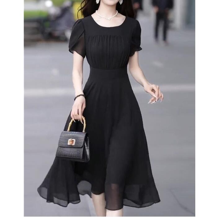 全2色 大きいサイズ 体型カバー エレガント フェミニン おしゃれ シンプル お呼ばれ 上品 ワンピース ドレス レディース きれいめ カジュアル 大人可愛い 春 秋 夏 半袖 シフォン ハイウエスト ミモレ丈 Aライン フレア 無地 ブラック 黒 ベージュ 20代 30代 40代 50代 L XL 2XL 3XL 4XL 5XL