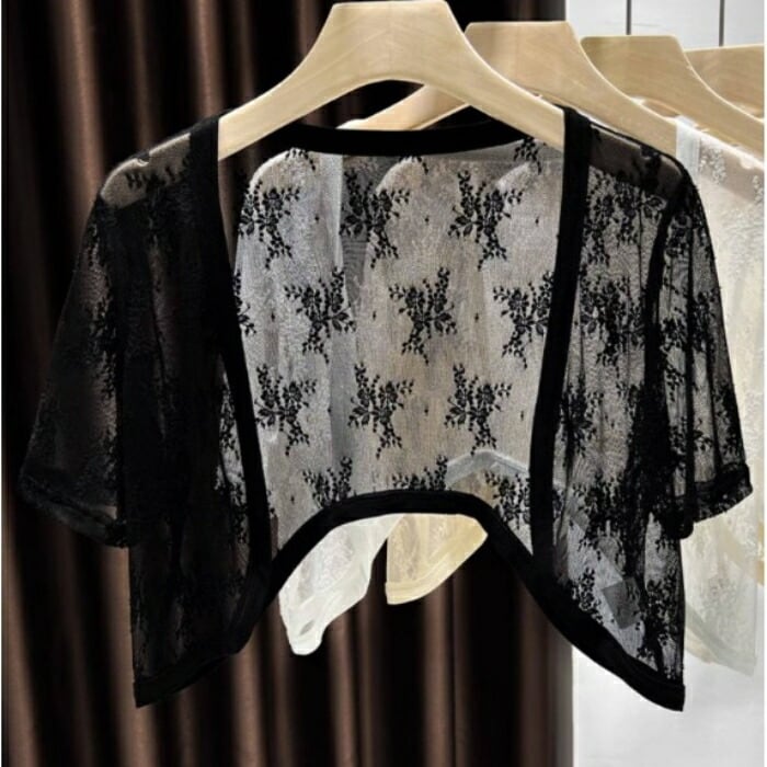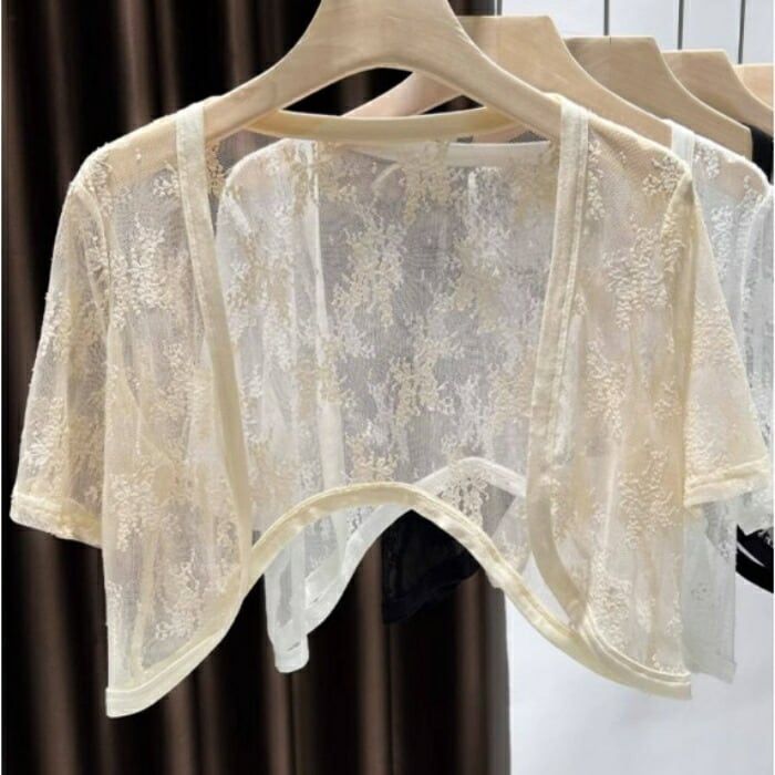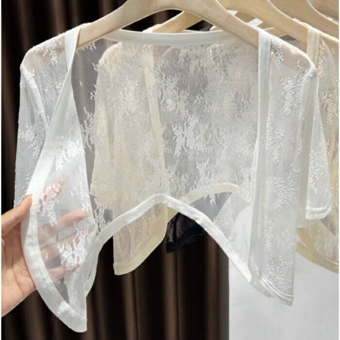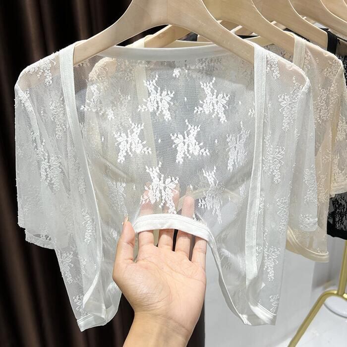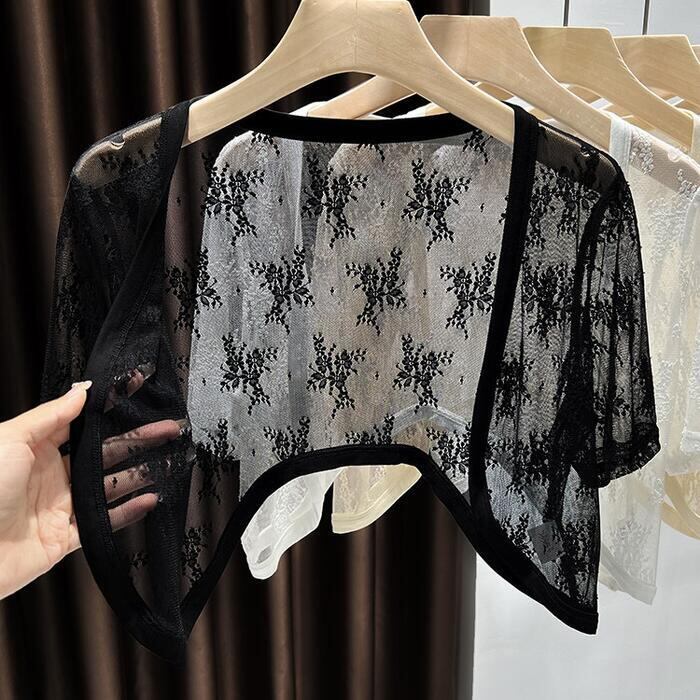 全3色 大きいサイズ 体型カバー エレガント フェミニン おしゃれ シンプル トップス カーディガン レディース きれいめ カジュアル 大人可愛い 春 夏 秋 レース 半袖 羽織り シアー 透け感 ボレロ ショート丈 クロップド丈 ホワイト 白 ブラック 黒 ベージュ 20代 30代 40代 50代 S M L